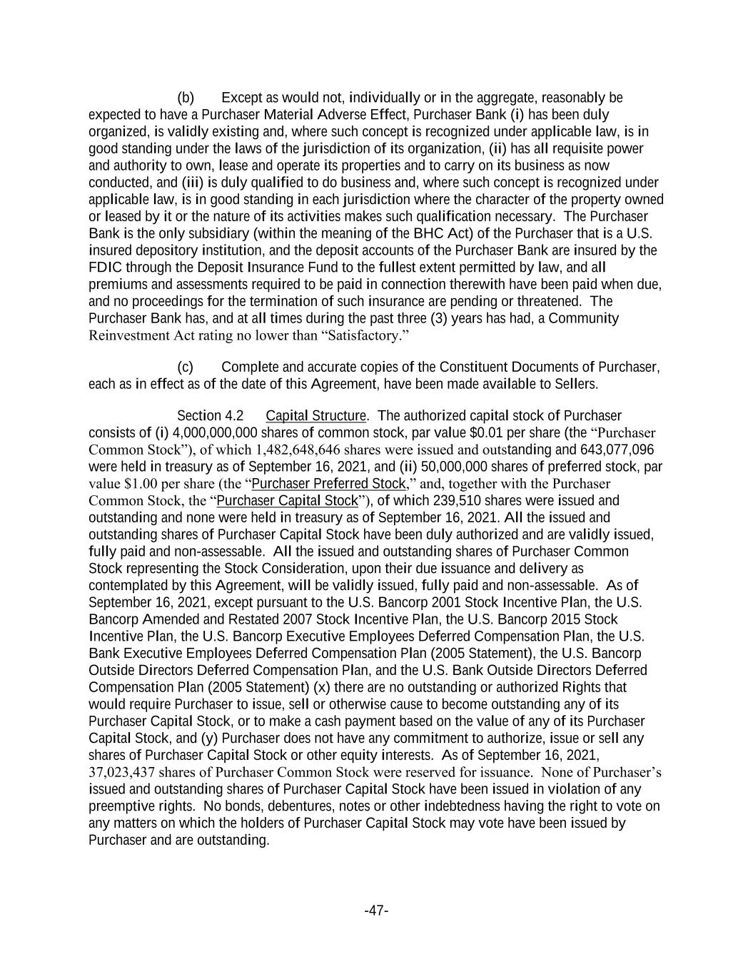 -47- (b) Except as would not, individually or in the aggregate, reasonably be expected to have a Purchaser Material Adverse Effect, Purchaser Bank (i) has been duly organized, is validly existing and, where such concept is recognized under applicable law, is in good standing under the laws of the jurisdiction of its organization, (ii) has all requisite power and authority to own, lease and operate its properties and to carry on its business as now conducted, and (iii) is duly qualified to do business and, where such concept is recognized under applicable law, is in good standing in each jurisdiction where the character of the property owned or leased by it or the nature of its activities makes such qualification necessary. The Purchaser Bank is the only subsidiary (within the meaning of the BHC Act) of the Purchaser that is a U.S. insured depository institution, and the deposit accounts of the Purchaser Bank are insured by the FDIC through the Deposit Insurance Fund to the fullest extent permitted by law, and all premiums and assessments required to be paid in connection therewith have been paid when due, and no proceedings for the termination of such insurance are pending or threatened. The Purchaser Bank has, and at all times during the past three (3) years has had, a Community Reinvestment Act rating no lower than “Satisfactory.” (c) Complete and accurate copies of the Constituent Documents of Purchaser, each as in effect as of the date of this Agreement, have been made available to Sellers. Section 4.2 Capital Structure. The authorized capital stock of Purchaser consists of (i) 4,000,000,000 shares of common stock, par value $0.01 per share (the “Purchaser Common Stock”), of which 1,482,648,646 shares were issued and outstanding and 643,077,096 were held in treasury as of September 16, 2021, and (ii) 50,000,000 shares of preferred stock, par value $1.00 per share (the “Purchaser Preferred Stock,” and, together with the Purchaser Common Stock, the “Purchaser Capital Stock”), of which 239,510 shares were issued and outstanding and none were held in treasury as of September 16, 2021. All the issued and outstanding shares of Purchaser Capital Stock have been duly authorized and are validly issued, fully paid and non-assessable. All the issued and outstanding shares of Purchaser Common Stock representing the Stock Consideration, upon their due issuance and delivery as contemplated by this Agreement, will be validly issued, fully paid and non-assessable. As of September 16, 2021, except pursuant to the U.S. Bancorp 2001 Stock Incentive Plan, the U.S. Bancorp Amended and Restated 2007 Stock Incentive Plan, the U.S. Bancorp 2015 Stock Incentive Plan, the U.S. Bancorp Executive Employees Deferred Compensation Plan, the U.S. Bank Executive Employees Deferred Compensation Plan (2005 Statement), the U.S. Bancorp Outside Directors Deferred Compensation Plan, and the U.S. Bank Outside Directors Deferred Compensation Plan (2005 Statement) (x) there are no outstanding or authorized Rights that would require Purchaser to issue, sell or otherwise cause to become outstanding any of its Purchaser Capital Stock, or to make a cash payment based on the value of any of its Purchaser Capital Stock, and (y) Purchaser does not have any commitment to authorize, issue or sell any shares of Purchaser Capital Stock or other equity interests. As of September 16, 2021, 37,023,437 shares of Purchaser Common Stock were reserved for issuance. None of Purchaser’s issued and outstanding shares of Purchaser Capital Stock have been issued in violation of any preemptive rights. No bonds, debentures, notes or other indebtedness having the right to vote on any matters on which the holders of Purchaser Capital Stock may vote have been issued by Purchaser and are outstanding.