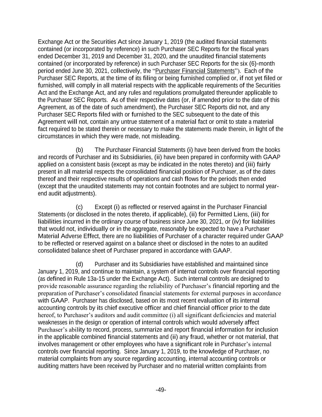 -49- Exchange Act or the Securities Act since January 1, 2019 (the audited financial statements contained (or incorporated by reference) in such Purchaser SEC Reports for the fiscal years ended December 31, 2019 and December 31, 2020, and the unaudited financial statements contained (or incorporated by reference) in such Purchaser SEC Reports for the six (6)-month period ended June 30, 2021, collectively, the “Purchaser Financial Statements”). Each of the Purchaser SEC Reports, at the time of its filing or being furnished complied or, if not yet filed or furnished, will comply in all material respects with the applicable requirements of the Securities Act and the Exchange Act, and any rules and regulations promulgated thereunder applicable to the Purchaser SEC Reports. As of their respective dates (or, if amended prior to the date of this Agreement, as of the date of such amendment), the Purchaser SEC Reports did not, and any Purchaser SEC Reports filed with or furnished to the SEC subsequent to the date of this Agreement will not, contain any untrue statement of a material fact or omit to state a material fact required to be stated therein or necessary to make the statements made therein, in light of the circumstances in which they were made, not misleading. (b) The Purchaser Financial Statements (i) have been derived from the books and records of Purchaser and its Subsidiaries, (ii) have been prepared in conformity with GAAP applied on a consistent basis (except as may be indicated in the notes thereto) and (iii) fairly present in all material respects the consolidated financial position of Purchaser, as of the dates thereof and their respective results of operations and cash flows for the periods then ended (except that the unaudited statements may not contain footnotes and are subject to normal year- end audit adjustments). (c) Except (i) as reflected or reserved against in the Purchaser Financial Statements (or disclosed in the notes thereto, if applicable), (ii) for Permitted Liens, (iii) for liabilities incurred in the ordinary course of business since June 30, 2021, or (iv) for liabilities that would not, individually or in the aggregate, reasonably be expected to have a Purchaser Material Adverse Effect, there are no liabilities of Purchaser of a character required under GAAP to be reflected or reserved against on a balance sheet or disclosed in the notes to an audited consolidated balance sheet of Purchaser prepared in accordance with GAAP. (d) Purchaser and its Subsidiaries have established and maintained since January 1, 2019, and continue to maintain, a system of internal controls over financial reporting (as defined in Rule 13a-15 under the Exchange Act). Such internal controls are designed to provide reasonable assurance regarding the reliability of Purchaser’s financial reporting and the preparation of Purchaser’s consolidated financial statements for external purposes in accordance with GAAP. Purchaser has disclosed, based on its most recent evaluation of its internal accounting controls by its chief executive officer and chief financial officer prior to the date hereof, to Purchaser’s auditors and audit committee (i) all significant deficiencies and material weaknesses in the design or operation of internal controls which would adversely affect Purchaser’s ability to record, process, summarize and report financial information for inclusion in the applicable combined financial statements and (ii) any fraud, whether or not material, that involves management or other employees who have a significant role in Purchaser’s internal controls over financial reporting. Since January 1, 2019, to the knowledge of Purchaser, no material complaints from any source regarding accounting, internal accounting controls or auditing matters have been received by Purchaser and no material written complaints from