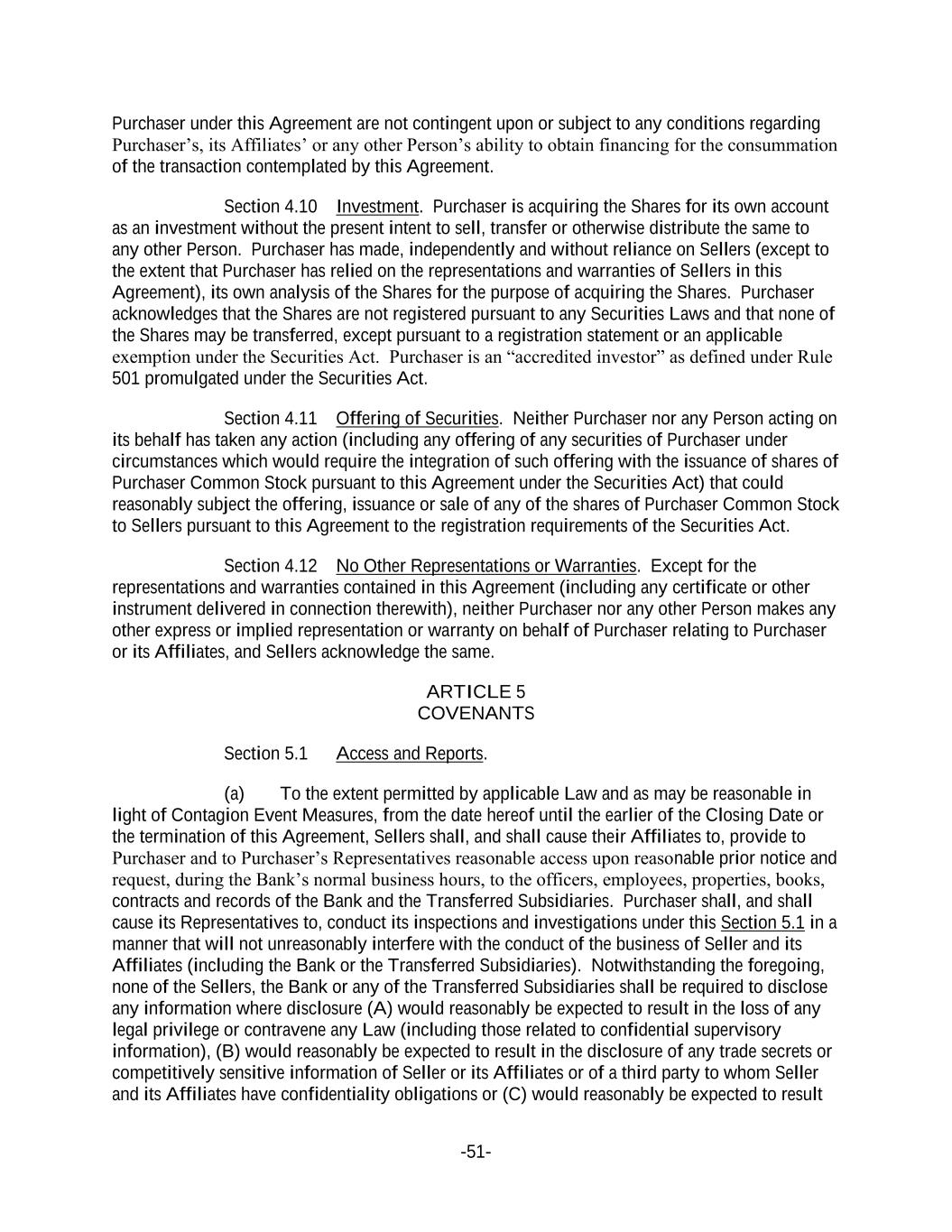 -51- Purchaser under this Agreement are not contingent upon or subject to any conditions regarding Purchaser’s, its Affiliates’ or any other Person’s ability to obtain financing for the consummation of the transaction contemplated by this Agreement. Section 4.10 Investment. Purchaser is acquiring the Shares for its own account as an investment without the present intent to sell, transfer or otherwise distribute the same to any other Person. Purchaser has made, independently and without reliance on Sellers (except to the extent that Purchaser has relied on the representations and warranties of Sellers in this Agreement), its own analysis of the Shares for the purpose of acquiring the Shares. Purchaser acknowledges that the Shares are not registered pursuant to any Securities Laws and that none of the Shares may be transferred, except pursuant to a registration statement or an applicable exemption under the Securities Act. Purchaser is an “accredited investor” as defined under Rule 501 promulgated under the Securities Act. Section 4.11 Offering of Securities. Neither Purchaser nor any Person acting on its behalf has taken any action (including any offering of any securities of Purchaser under circumstances which would require the integration of such offering with the issuance of shares of Purchaser Common Stock pursuant to this Agreement under the Securities Act) that could reasonably subject the offering, issuance or sale of any of the shares of Purchaser Common Stock to Sellers pursuant to this Agreement to the registration requirements of the Securities Act. Section 4.12 No Other Representations or Warranties. Except for the representations and warranties contained in this Agreement (including any certificate or other instrument delivered in connection therewith), neither Purchaser nor any other Person makes any other express or implied representation or warranty on behalf of Purchaser relating to Purchaser or its Affiliates, and Sellers acknowledge the same. ARTICLE 5 COVENANTS Section 5.1 Access and Reports. (a) To the extent permitted by applicable Law and as may be reasonable in light of Contagion Event Measures, from the date hereof until the earlier of the Closing Date or the termination of this Agreement, Sellers shall, and shall cause their Affiliates to, provide to Purchaser and to Purchaser’s Representatives reasonable access upon reasonable prior notice and request, during the Bank’s normal business hours, to the officers, employees, properties, books, contracts and records of the Bank and the Transferred Subsidiaries. Purchaser shall, and shall cause its Representatives to, conduct its inspections and investigations under this Section 5.1 in a manner that will not unreasonably interfere with the conduct of the business of Seller and its Affiliates (including the Bank or the Transferred Subsidiaries). Notwithstanding the foregoing, none of the Sellers, the Bank or any of the Transferred Subsidiaries shall be required to disclose any information where disclosure (A) would reasonably be expected to result in the loss of any legal privilege or contravene any Law (including those related to confidential supervisory information), (B) would reasonably be expected to result in the disclosure of any trade secrets or competitively sensitive information of Seller or its Affiliates or of a third party to whom Seller and its Affiliates have confidentiality obligations or (C) would reasonably be expected to result