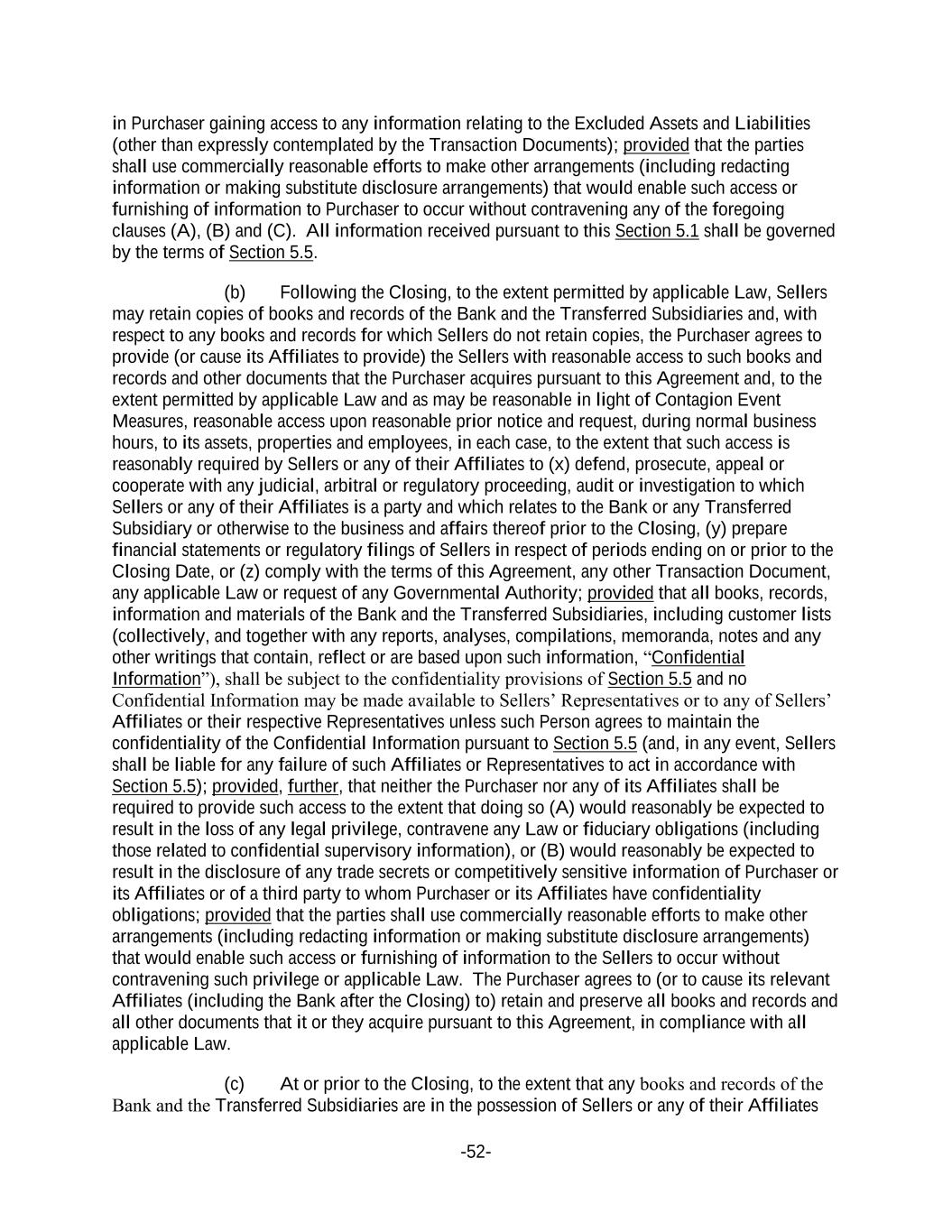 -52- in Purchaser gaining access to any information relating to the Excluded Assets and Liabilities (other than expressly contemplated by the Transaction Documents); provided that the parties shall use commercially reasonable efforts to make other arrangements (including redacting information or making substitute disclosure arrangements) that would enable such access or furnishing of information to Purchaser to occur without contravening any of the foregoing clauses (A), (B) and (C). All information received pursuant to this Section 5.1 shall be governed by the terms of Section 5.5. (b) Following the Closing, to the extent permitted by applicable Law, Sellers may retain copies of books and records of the Bank and the Transferred Subsidiaries and, with respect to any books and records for which Sellers do not retain copies, the Purchaser agrees to provide (or cause its Affiliates to provide) the Sellers with reasonable access to such books and records and other documents that the Purchaser acquires pursuant to this Agreement and, to the extent permitted by applicable Law and as may be reasonable in light of Contagion Event Measures, reasonable access upon reasonable prior notice and request, during normal business hours, to its assets, properties and employees, in each case, to the extent that such access is reasonably required by Sellers or any of their Affiliates to (x) defend, prosecute, appeal or cooperate with any judicial, arbitral or regulatory proceeding, audit or investigation to which Sellers or any of their Affiliates is a party and which relates to the Bank or any Transferred Subsidiary or otherwise to the business and affairs thereof prior to the Closing, (y) prepare financial statements or regulatory filings of Sellers in respect of periods ending on or prior to the Closing Date, or (z) comply with the terms of this Agreement, any other Transaction Document, any applicable Law or request of any Governmental Authority; provided that all books, records, information and materials of the Bank and the Transferred Subsidiaries, including customer lists (collectively, and together with any reports, analyses, compilations, memoranda, notes and any other writings that contain, reflect or are based upon such information, “Confidential Information”), shall be subject to the confidentiality provisions of Section 5.5 and no Confidential Information may be made available to Sellers’ Representatives or to any of Sellers’ Affiliates or their respective Representatives unless such Person agrees to maintain the confidentiality of the Confidential Information pursuant to Section 5.5 (and, in any event, Sellers shall be liable for any failure of such Affiliates or Representatives to act in accordance with Section 5.5); provided, further, that neither the Purchaser nor any of its Affiliates shall be required to provide such access to the extent that doing so (A) would reasonably be expected to result in the loss of any legal privilege, contravene any Law or fiduciary obligations (including those related to confidential supervisory information), or (B) would reasonably be expected to result in the disclosure of any trade secrets or competitively sensitive information of Purchaser or its Affiliates or of a third party to whom Purchaser or its Affiliates have confidentiality obligations; provided that the parties shall use commercially reasonable efforts to make other arrangements (including redacting information or making substitute disclosure arrangements) that would enable such access or furnishing of information to the Sellers to occur without contravening such privilege or applicable Law. The Purchaser agrees to (or to cause its relevant Affiliates (including the Bank after the Closing) to) retain and preserve all books and records and all other documents that it or they acquire pursuant to this Agreement, in compliance with all applicable Law. (c) At or prior to the Closing, to the extent that any books and records of the Bank and the Transferred Subsidiaries are in the possession of Sellers or any of their Affiliates