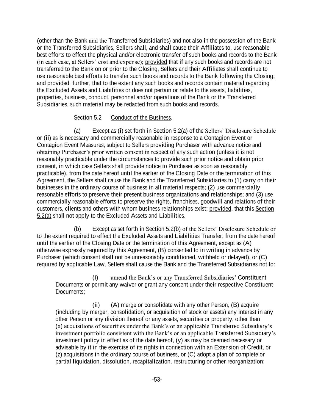 -53- (other than the Bank and the Transferred Subsidiaries) and not also in the possession of the Bank or the Transferred Subsidiaries, Sellers shall, and shall cause their Affiliates to, use reasonable best efforts to effect the physical and/or electronic transfer of such books and records to the Bank (in each case, at Sellers’ cost and expense); provided that if any such books and records are not transferred to the Bank on or prior to the Closing, Sellers and their Affiliates shall continue to use reasonable best efforts to transfer such books and records to the Bank following the Closing; and provided, further, that to the extent any such books and records contain material regarding the Excluded Assets and Liabilities or does not pertain or relate to the assets, liabilities, properties, business, conduct, personnel and/or operations of the Bank or the Transferred Subsidiaries, such material may be redacted from such books and records. Section 5.2 Conduct of the Business. (a) Except as (i) set forth in Section 5.2(a) of the Sellers’ Disclosure Schedule or (ii) as is necessary and commercially reasonable in response to a Contagion Event or Contagion Event Measures, subject to Sellers providing Purchaser with advance notice and obtaining Purchaser’s prior written consent in respect of any such action (unless it is not reasonably practicable under the circumstances to provide such prior notice and obtain prior consent, in which case Sellers shall provide notice to Purchaser as soon as reasonably practicable), from the date hereof until the earlier of the Closing Date or the termination of this Agreement, the Sellers shall cause the Bank and the Transferred Subsidiaries to (1) carry on their businesses in the ordinary course of business in all material respects; (2) use commercially reasonable efforts to preserve their present business organizations and relationships; and (3) use commercially reasonable efforts to preserve the rights, franchises, goodwill and relations of their customers, clients and others with whom business relationships exist; provided, that this Section 5.2(a) shall not apply to the Excluded Assets and Liabilities. (b) Except as set forth in Section 5.2(b) of the Sellers’ Disclosure Schedule or to the extent required to effect the Excluded Assets and Liabilities Transfer, from the date hereof until the earlier of the Closing Date or the termination of this Agreement, except as (A) otherwise expressly required by this Agreement, (B) consented to in writing in advance by Purchaser (which consent shall not be unreasonably conditioned, withheld or delayed), or (C) required by applicable Law, Sellers shall cause the Bank and the Transferred Subsidiaries not to: (i) amend the Bank’s or any Transferred Subsidiaries’ Constituent Documents or permit any waiver or grant any consent under their respective Constituent Documents; (ii) (A) merge or consolidate with any other Person, (B) acquire (including by merger, consolidation, or acquisition of stock or assets) any interest in any other Person or any division thereof or any assets, securities or property, other than (x) acquisitions of securities under the Bank’s or an applicable Transferred Subsidiary’s investment portfolio consistent with the Bank’s or an applicable Transferred Subsidiary’s investment policy in effect as of the date hereof, (y) as may be deemed necessary or advisable by it in the exercise of its rights in connection with an Extension of Credit, or (z) acquisitions in the ordinary course of business, or (C) adopt a plan of complete or partial liquidation, dissolution, recapitalization, restructuring or other reorganization;
