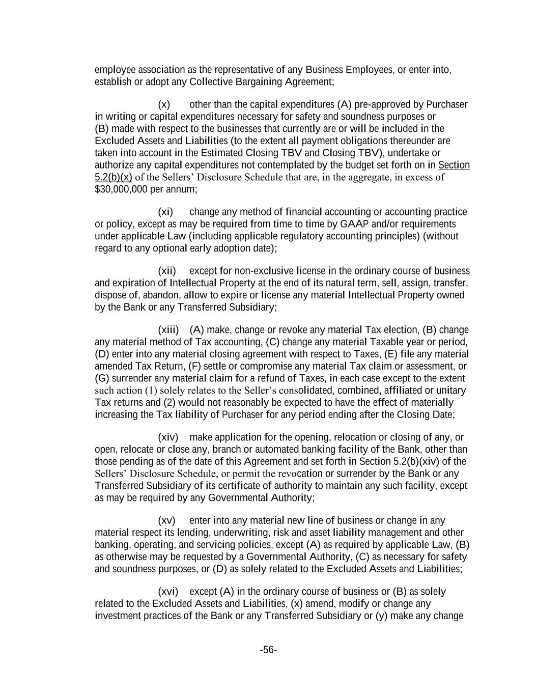 -56- employee association as the representative of any Business Employees, or enter into, establish or adopt any Collective Bargaining Agreement; (x) other than the capital expenditures (A) pre-approved by Purchaser in writing or capital expenditures necessary for safety and soundness purposes or (B) made with respect to the businesses that currently are or will be included in the Excluded Assets and Liabilities (to the extent all payment obligations thereunder are taken into account in the Estimated Closing TBV and Closing TBV), undertake or authorize any capital expenditures not contemplated by the budget set forth on in Section 5.2(b)(x) of the Sellers’ Disclosure Schedule that are, in the aggregate, in excess of $30,000,000 per annum; (xi) change any method of financial accounting or accounting practice or policy, except as may be required from time to time by GAAP and/or requirements under applicable Law (including applicable regulatory accounting principles) (without regard to any optional early adoption date); (xii) except for non-exclusive license in the ordinary course of business and expiration of Intellectual Property at the end of its natural term, sell, assign, transfer, dispose of, abandon, allow to expire or license any material Intellectual Property owned by the Bank or any Transferred Subsidiary; (xiii) (A) make, change or revoke any material Tax election, (B) change any material method of Tax accounting, (C) change any material Taxable year or period, (D) enter into any material closing agreement with respect to Taxes, (E) file any material amended Tax Return, (F) settle or compromise any material Tax claim or assessment, or (G) surrender any material claim for a refund of Taxes, in each case except to the extent such action (1) solely relates to the Seller’s consolidated, combined, affiliated or unitary Tax returns and (2) would not reasonably be expected to have the effect of materially increasing the Tax liability of Purchaser for any period ending after the Closing Date; (xiv) make application for the opening, relocation or closing of any, or open, relocate or close any, branch or automated banking facility of the Bank, other than those pending as of the date of this Agreement and set forth in Section 5.2(b)(xiv) of the Sellers’ Disclosure Schedule, or permit the revocation or surrender by the Bank or any Transferred Subsidiary of its certificate of authority to maintain any such facility, except as may be required by any Governmental Authority; (xv) enter into any material new line of business or change in any material respect its lending, underwriting, risk and asset liability management and other banking, operating, and servicing policies, except (A) as required by applicable Law, (B) as otherwise may be requested by a Governmental Authority, (C) as necessary for safety and soundness purposes, or (D) as solely related to the Excluded Assets and Liabilities; (xvi) except (A) in the ordinary course of business or (B) as solely related to the Excluded Assets and Liabilities, (x) amend, modify or change any investment practices of the Bank or any Transferred Subsidiary or (y) make any change