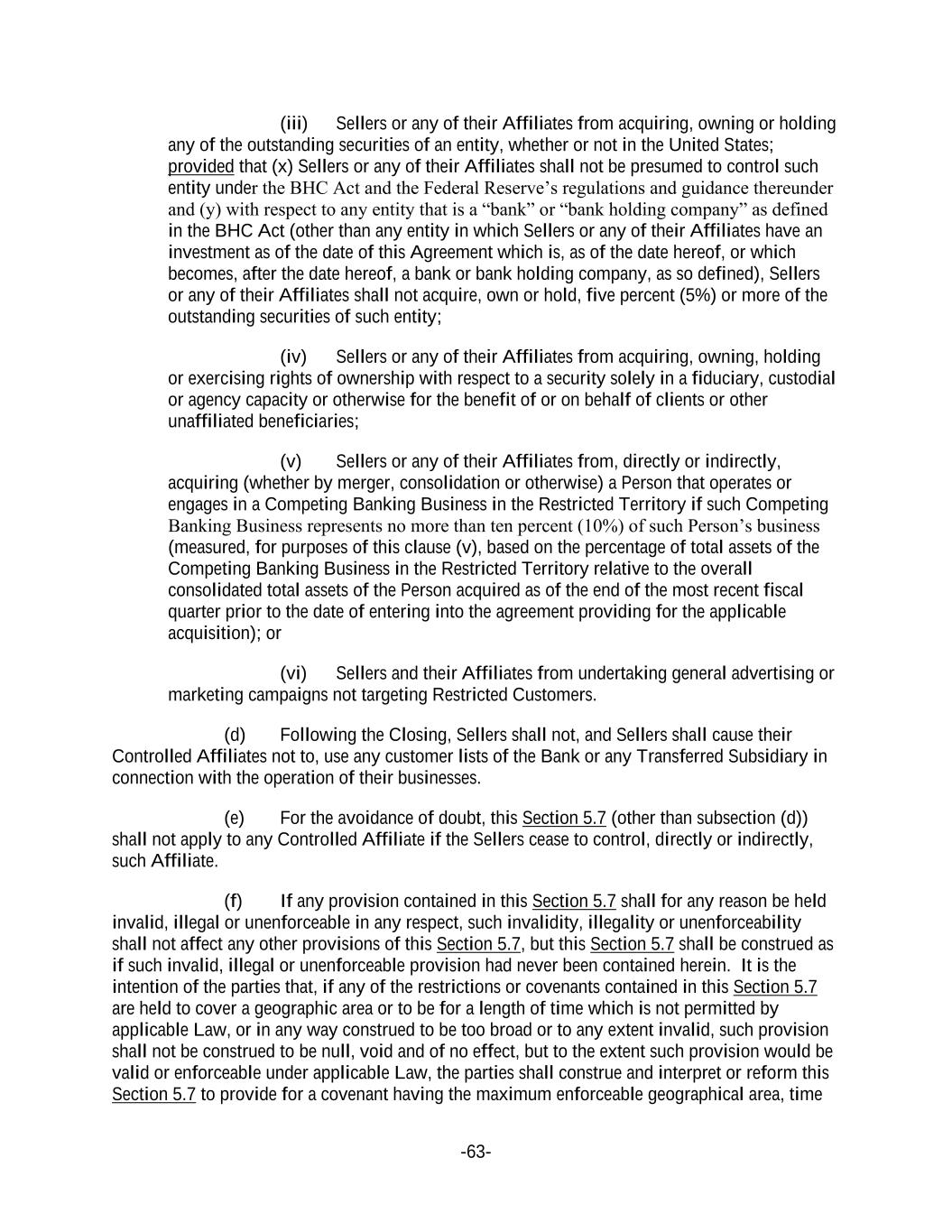 -63- (iii) Sellers or any of their Affiliates from acquiring, owning or holding any of the outstanding securities of an entity, whether or not in the United States; provided that (x) Sellers or any of their Affiliates shall not be presumed to control such entity under the BHC Act and the Federal Reserve’s regulations and guidance thereunder and (y) with respect to any entity that is a “bank” or “bank holding company” as defined in the BHC Act (other than any entity in which Sellers or any of their Affiliates have an investment as of the date of this Agreement which is, as of the date hereof, or which becomes, after the date hereof, a bank or bank holding company, as so defined), Sellers or any of their Affiliates shall not acquire, own or hold, five percent (5%) or more of the outstanding securities of such entity; (iv) Sellers or any of their Affiliates from acquiring, owning, holding or exercising rights of ownership with respect to a security solely in a fiduciary, custodial or agency capacity or otherwise for the benefit of or on behalf of clients or other unaffiliated beneficiaries; (v) Sellers or any of their Affiliates from, directly or indirectly, acquiring (whether by merger, consolidation or otherwise) a Person that operates or engages in a Competing Banking Business in the Restricted Territory if such Competing Banking Business represents no more than ten percent (10%) of such Person’s business (measured, for purposes of this clause (v), based on the percentage of total assets of the Competing Banking Business in the Restricted Territory relative to the overall consolidated total assets of the Person acquired as of the end of the most recent fiscal quarter prior to the date of entering into the agreement providing for the applicable acquisition); or (vi) Sellers and their Affiliates from undertaking general advertising or marketing campaigns not targeting Restricted Customers. (d) Following the Closing, Sellers shall not, and Sellers shall cause their Controlled Affiliates not to, use any customer lists of the Bank or any Transferred Subsidiary in connection with the operation of their businesses. (e) For the avoidance of doubt, this Section 5.7 (other than subsection (d)) shall not apply to any Controlled Affiliate if the Sellers cease to control, directly or indirectly, such Affiliate. (f) If any provision contained in this Section 5.7 shall for any reason be held invalid, illegal or unenforceable in any respect, such invalidity, illegality or unenforceability shall not affect any other provisions of this Section 5.7, but this Section 5.7 shall be construed as if such invalid, illegal or unenforceable provision had never been contained herein. It is the intention of the parties that, if any of the restrictions or covenants contained in this Section 5.7 are held to cover a geographic area or to be for a length of time which is not permitted by applicable Law, or in any way construed to be too broad or to any extent invalid, such provision shall not be construed to be null, void and of no effect, but to the extent such provision would be valid or enforceable under applicable Law, the parties shall construe and interpret or reform this Section 5.7 to provide for a covenant having the maximum enforceable geographical area, time