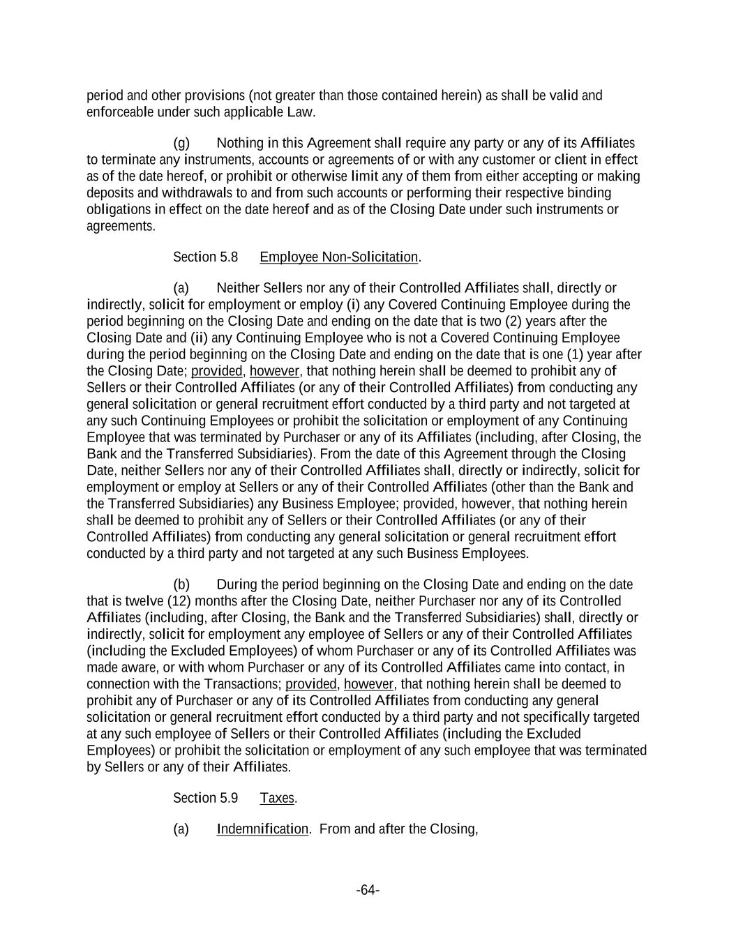 -64- period and other provisions (not greater than those contained herein) as shall be valid and enforceable under such applicable Law. (g) Nothing in this Agreement shall require any party or any of its Affiliates to terminate any instruments, accounts or agreements of or with any customer or client in effect as of the date hereof, or prohibit or otherwise limit any of them from either accepting or making deposits and withdrawals to and from such accounts or performing their respective binding obligations in effect on the date hereof and as of the Closing Date under such instruments or agreements. Section 5.8 Employee Non-Solicitation. (a) Neither Sellers nor any of their Controlled Affiliates shall, directly or indirectly, solicit for employment or employ (i) any Covered Continuing Employee during the period beginning on the Closing Date and ending on the date that is two (2) years after the Closing Date and (ii) any Continuing Employee who is not a Covered Continuing Employee during the period beginning on the Closing Date and ending on the date that is one (1) year after the Closing Date; provided, however, that nothing herein shall be deemed to prohibit any of Sellers or their Controlled Affiliates (or any of their Controlled Affiliates) from conducting any general solicitation or general recruitment effort conducted by a third party and not targeted at any such Continuing Employees or prohibit the solicitation or employment of any Continuing Employee that was terminated by Purchaser or any of its Affiliates (including, after Closing, the Bank and the Transferred Subsidiaries). From the date of this Agreement through the Closing Date, neither Sellers nor any of their Controlled Affiliates shall, directly or indirectly, solicit for employment or employ at Sellers or any of their Controlled Affiliates (other than the Bank and the Transferred Subsidiaries) any Business Employee; provided, however, that nothing herein shall be deemed to prohibit any of Sellers or their Controlled Affiliates (or any of their Controlled Affiliates) from conducting any general solicitation or general recruitment effort conducted by a third party and not targeted at any such Business Employees. (b) During the period beginning on the Closing Date and ending on the date that is twelve (12) months after the Closing Date, neither Purchaser nor any of its Controlled Affiliates (including, after Closing, the Bank and the Transferred Subsidiaries) shall, directly or indirectly, solicit for employment any employee of Sellers or any of their Controlled Affiliates (including the Excluded Employees) of whom Purchaser or any of its Controlled Affiliates was made aware, or with whom Purchaser or any of its Controlled Affiliates came into contact, in connection with the Transactions; provided, however, that nothing herein shall be deemed to prohibit any of Purchaser or any of its Controlled Affiliates from conducting any general solicitation or general recruitment effort conducted by a third party and not specifically targeted at any such employee of Sellers or their Controlled Affiliates (including the Excluded Employees) or prohibit the solicitation or employment of any such employee that was terminated by Sellers or any of their Affiliates. Section 5.9 Taxes. (a) Indemnification. From and after the Closing,