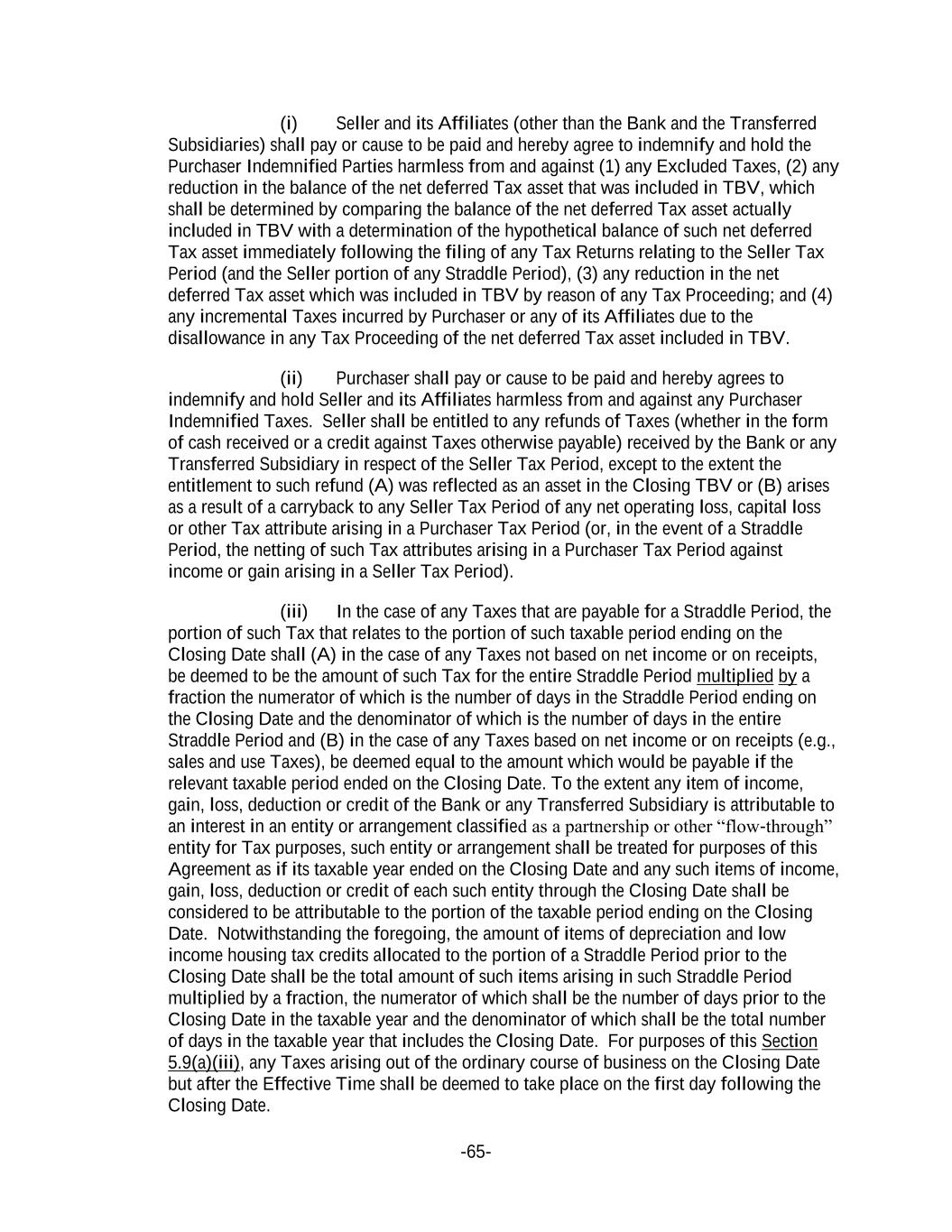 -65- (i) Seller and its Affiliates (other than the Bank and the Transferred Subsidiaries) shall pay or cause to be paid and hereby agree to indemnify and hold the Purchaser Indemnified Parties harmless from and against (1) any Excluded Taxes, (2) any reduction in the balance of the net deferred Tax asset that was included in TBV, which shall be determined by comparing the balance of the net deferred Tax asset actually included in TBV with a determination of the hypothetical balance of such net deferred Tax asset immediately following the filing of any Tax Returns relating to the Seller Tax Period (and the Seller portion of any Straddle Period), (3) any reduction in the net deferred Tax asset which was included in TBV by reason of any Tax Proceeding; and (4) any incremental Taxes incurred by Purchaser or any of its Affiliates due to the disallowance in any Tax Proceeding of the net deferred Tax asset included in TBV. (ii) Purchaser shall pay or cause to be paid and hereby agrees to indemnify and hold Seller and its Affiliates harmless from and against any Purchaser Indemnified Taxes. Seller shall be entitled to any refunds of Taxes (whether in the form of cash received or a credit against Taxes otherwise payable) received by the Bank or any Transferred Subsidiary in respect of the Seller Tax Period, except to the extent the entitlement to such refund (A) was reflected as an asset in the Closing TBV or (B) arises as a result of a carryback to any Seller Tax Period of any net operating loss, capital loss or other Tax attribute arising in a Purchaser Tax Period (or, in the event of a Straddle Period, the netting of such Tax attributes arising in a Purchaser Tax Period against income or gain arising in a Seller Tax Period). (iii) In the case of any Taxes that are payable for a Straddle Period, the portion of such Tax that relates to the portion of such taxable period ending on the Closing Date shall (A) in the case of any Taxes not based on net income or on receipts, be deemed to be the amount of such Tax for the entire Straddle Period multiplied by a fraction the numerator of which is the number of days in the Straddle Period ending on the Closing Date and the denominator of which is the number of days in the entire Straddle Period and (B) in the case of any Taxes based on net income or on receipts (e.g., sales and use Taxes), be deemed equal to the amount which would be payable if the relevant taxable period ended on the Closing Date. To the extent any item of income, gain, loss, deduction or credit of the Bank or any Transferred Subsidiary is attributable to an interest in an entity or arrangement classified as a partnership or other “flow-through” entity for Tax purposes, such entity or arrangement shall be treated for purposes of this Agreement as if its taxable year ended on the Closing Date and any such items of income, gain, loss, deduction or credit of each such entity through the Closing Date shall be considered to be attributable to the portion of the taxable period ending on the Closing Date. Notwithstanding the foregoing, the amount of items of depreciation and low income housing tax credits allocated to the portion of a Straddle Period prior to the Closing Date shall be the total amount of such items arising in such Straddle Period multiplied by a fraction, the numerator of which shall be the number of days prior to the Closing Date in the taxable year and the denominator of which shall be the total number of days in the taxable year that includes the Closing Date. For purposes of this Section 5.9(a)(iii), any Taxes arising out of the ordinary course of business on the Closing Date but after the Effective Time shall be deemed to take place on the first day following the Closing Date.