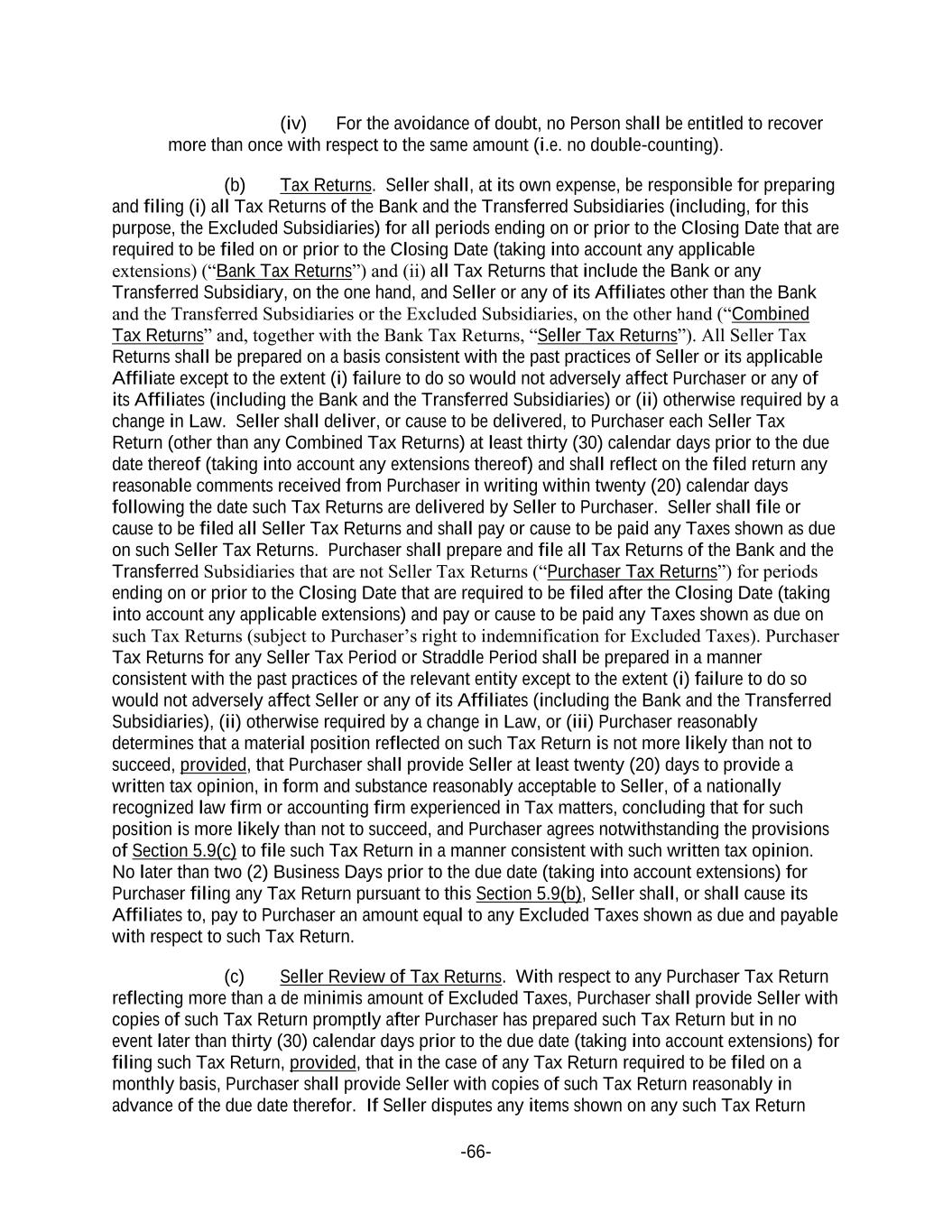 -66- (iv) For the avoidance of doubt, no Person shall be entitled to recover more than once with respect to the same amount (i.e. no double-counting). (b) Tax Returns. Seller shall, at its own expense, be responsible for preparing and filing (i) all Tax Returns of the Bank and the Transferred Subsidiaries (including, for this purpose, the Excluded Subsidiaries) for all periods ending on or prior to the Closing Date that are required to be filed on or prior to the Closing Date (taking into account any applicable extensions) (“Bank Tax Returns”) and (ii) all Tax Returns that include the Bank or any Transferred Subsidiary, on the one hand, and Seller or any of its Affiliates other than the Bank and the Transferred Subsidiaries or the Excluded Subsidiaries, on the other hand (“Combined Tax Returns” and, together with the Bank Tax Returns, “Seller Tax Returns”). All Seller Tax Returns shall be prepared on a basis consistent with the past practices of Seller or its applicable Affiliate except to the extent (i) failure to do so would not adversely affect Purchaser or any of its Affiliates (including the Bank and the Transferred Subsidiaries) or (ii) otherwise required by a change in Law. Seller shall deliver, or cause to be delivered, to Purchaser each Seller Tax Return (other than any Combined Tax Returns) at least thirty (30) calendar days prior to the due date thereof (taking into account any extensions thereof) and shall reflect on the filed return any reasonable comments received from Purchaser in writing within twenty (20) calendar days following the date such Tax Returns are delivered by Seller to Purchaser. Seller shall file or cause to be filed all Seller Tax Returns and shall pay or cause to be paid any Taxes shown as due on such Seller Tax Returns. Purchaser shall prepare and file all Tax Returns of the Bank and the Transferred Subsidiaries that are not Seller Tax Returns (“Purchaser Tax Returns”) for periods ending on or prior to the Closing Date that are required to be filed after the Closing Date (taking into account any applicable extensions) and pay or cause to be paid any Taxes shown as due on such Tax Returns (subject to Purchaser’s right to indemnification for Excluded Taxes). Purchaser Tax Returns for any Seller Tax Period or Straddle Period shall be prepared in a manner consistent with the past practices of the relevant entity except to the extent (i) failure to do so would not adversely affect Seller or any of its Affiliates (including the Bank and the Transferred Subsidiaries), (ii) otherwise required by a change in Law, or (iii) Purchaser reasonably determines that a material position reflected on such Tax Return is not more likely than not to succeed, provided, that Purchaser shall provide Seller at least twenty (20) days to provide a written tax opinion, in form and substance reasonably acceptable to Seller, of a nationally recognized law firm or accounting firm experienced in Tax matters, concluding that for such position is more likely than not to succeed, and Purchaser agrees notwithstanding the provisions of Section 5.9(c) to file such Tax Return in a manner consistent with such written tax opinion. No later than two (2) Business Days prior to the due date (taking into account extensions) for Purchaser filing any Tax Return pursuant to this Section 5.9(b), Seller shall, or shall cause its Affiliates to, pay to Purchaser an amount equal to any Excluded Taxes shown as due and payable with respect to such Tax Return. (c) Seller Review of Tax Returns. With respect to any Purchaser Tax Return reflecting more than a de minimis amount of Excluded Taxes, Purchaser shall provide Seller with copies of such Tax Return promptly after Purchaser has prepared such Tax Return but in no event later than thirty (30) calendar days prior to the due date (taking into account extensions) for filing such Tax Return, provided, that in the case of any Tax Return required to be filed on a monthly basis, Purchaser shall provide Seller with copies of such Tax Return reasonably in advance of the due date therefor. If Seller disputes any items shown on any such Tax Return