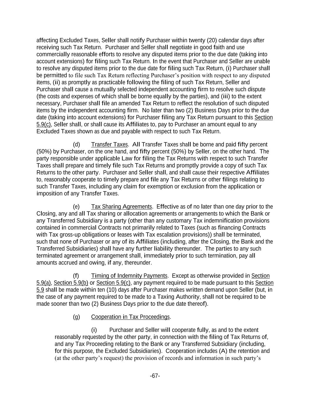 -67- affecting Excluded Taxes, Seller shall notify Purchaser within twenty (20) calendar days after receiving such Tax Return. Purchaser and Seller shall negotiate in good faith and use commercially reasonable efforts to resolve any disputed items prior to the due date (taking into account extensions) for filing such Tax Return. In the event that Purchaser and Seller are unable to resolve any disputed items prior to the due date for filing such Tax Return, (i) Purchaser shall be permitted to file such Tax Return reflecting Purchaser’s position with respect to any disputed items, (ii) as promptly as practicable following the filing of such Tax Return, Seller and Purchaser shall cause a mutually selected independent accounting firm to resolve such dispute (the costs and expenses of which shall be borne equally by the parties), and (iii) to the extent necessary, Purchaser shall file an amended Tax Return to reflect the resolution of such disputed items by the independent accounting firm. No later than two (2) Business Days prior to the due date (taking into account extensions) for Purchaser filing any Tax Return pursuant to this Section 5.9(c), Seller shall, or shall cause its Affiliates to, pay to Purchaser an amount equal to any Excluded Taxes shown as due and payable with respect to such Tax Return. (d) Transfer Taxes. All Transfer Taxes shall be borne and paid fifty percent (50%) by Purchaser, on the one hand, and fifty percent (50%) by Seller, on the other hand. The party responsible under applicable Law for filing the Tax Returns with respect to such Transfer Taxes shall prepare and timely file such Tax Returns and promptly provide a copy of such Tax Returns to the other party. Purchaser and Seller shall, and shall cause their respective Affiliates to, reasonably cooperate to timely prepare and file any Tax Returns or other filings relating to such Transfer Taxes, including any claim for exemption or exclusion from the application or imposition of any Transfer Taxes. (e) Tax Sharing Agreements. Effective as of no later than one day prior to the Closing, any and all Tax sharing or allocation agreements or arrangements to which the Bank or any Transferred Subsidiary is a party (other than any customary Tax indemnification provisions contained in commercial Contracts not primarily related to Taxes (such as financing Contracts with Tax gross-up obligations or leases with Tax escalation provisions)) shall be terminated, such that none of Purchaser or any of its Affiliates (including, after the Closing, the Bank and the Transferred Subsidiaries) shall have any further liability thereunder. The parties to any such terminated agreement or arrangement shall, immediately prior to such termination, pay all amounts accrued and owing, if any, thereunder. (f) Timing of Indemnity Payments. Except as otherwise provided in Section 5.9(a), Section 5.9(b) or Section 5.9(c), any payment required to be made pursuant to this Section 5.9 shall be made within ten (10) days after Purchaser makes written demand upon Seller (but, in the case of any payment required to be made to a Taxing Authority, shall not be required to be made sooner than two (2) Business Days prior to the due date thereof). (g) Cooperation in Tax Proceedings. (i) Purchaser and Seller will cooperate fully, as and to the extent reasonably requested by the other party, in connection with the filing of Tax Returns of, and any Tax Proceeding relating to the Bank or any Transferred Subsidiary (including, for this purpose, the Excluded Subsidiaries). Cooperation includes (A) the retention and (at the other party’s request) the provision of records and information in such party’s