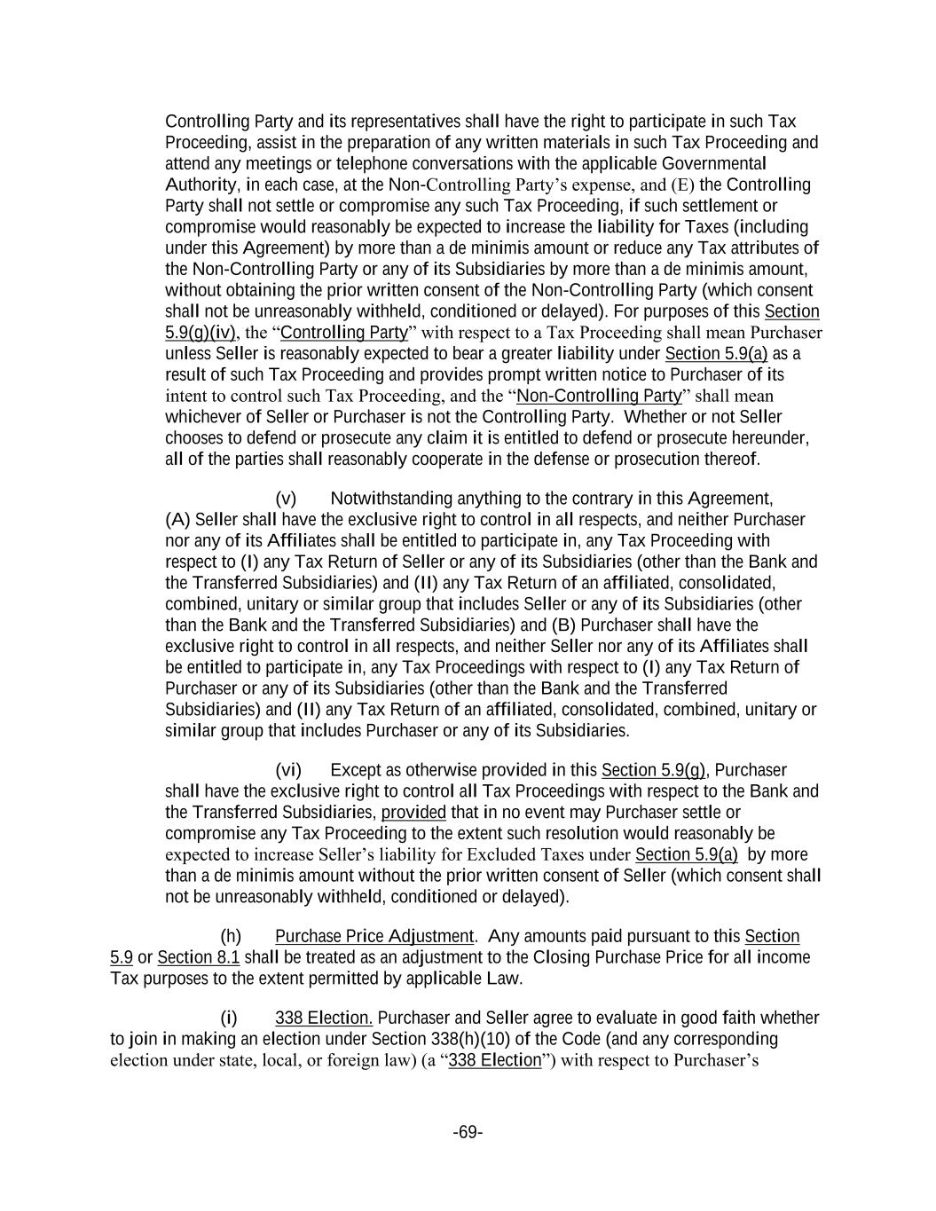 -69- Controlling Party and its representatives shall have the right to participate in such Tax Proceeding, assist in the preparation of any written materials in such Tax Proceeding and attend any meetings or telephone conversations with the applicable Governmental Authority, in each case, at the Non-Controlling Party’s expense, and (E) the Controlling Party shall not settle or compromise any such Tax Proceeding, if such settlement or compromise would reasonably be expected to increase the liability for Taxes (including under this Agreement) by more than a de minimis amount or reduce any Tax attributes of the Non-Controlling Party or any of its Subsidiaries by more than a de minimis amount, without obtaining the prior written consent of the Non-Controlling Party (which consent shall not be unreasonably withheld, conditioned or delayed). For purposes of this Section 5.9(g)(iv), the “Controlling Party” with respect to a Tax Proceeding shall mean Purchaser unless Seller is reasonably expected to bear a greater liability under Section 5.9(a) as a result of such Tax Proceeding and provides prompt written notice to Purchaser of its intent to control such Tax Proceeding, and the “Non-Controlling Party” shall mean whichever of Seller or Purchaser is not the Controlling Party. Whether or not Seller chooses to defend or prosecute any claim it is entitled to defend or prosecute hereunder, all of the parties shall reasonably cooperate in the defense or prosecution thereof. (v) Notwithstanding anything to the contrary in this Agreement, (A) Seller shall have the exclusive right to control in all respects, and neither Purchaser nor any of its Affiliates shall be entitled to participate in, any Tax Proceeding with respect to (I) any Tax Return of Seller or any of its Subsidiaries (other than the Bank and the Transferred Subsidiaries) and (II) any Tax Return of an affiliated, consolidated, combined, unitary or similar group that includes Seller or any of its Subsidiaries (other than the Bank and the Transferred Subsidiaries) and (B) Purchaser shall have the exclusive right to control in all respects, and neither Seller nor any of its Affiliates shall be entitled to participate in, any Tax Proceedings with respect to (I) any Tax Return of Purchaser or any of its Subsidiaries (other than the Bank and the Transferred Subsidiaries) and (II) any Tax Return of an affiliated, consolidated, combined, unitary or similar group that includes Purchaser or any of its Subsidiaries. (vi) Except as otherwise provided in this Section 5.9(g), Purchaser shall have the exclusive right to control all Tax Proceedings with respect to the Bank and the Transferred Subsidiaries, provided that in no event may Purchaser settle or compromise any Tax Proceeding to the extent such resolution would reasonably be expected to increase Seller’s liability for Excluded Taxes under Section 5.9(a) by more than a de minimis amount without the prior written consent of Seller (which consent shall not be unreasonably withheld, conditioned or delayed). (h) Purchase Price Adjustment. Any amounts paid pursuant to this Section 5.9 or Section 8.1 shall be treated as an adjustment to the Closing Purchase Price for all income Tax purposes to the extent permitted by applicable Law. (i) 338 Election. Purchaser and Seller agree to evaluate in good faith whether to join in making an election under Section 338(h)(10) of the Code (and any corresponding election under state, local, or foreign law) (a “338 Election”) with respect to Purchaser’s