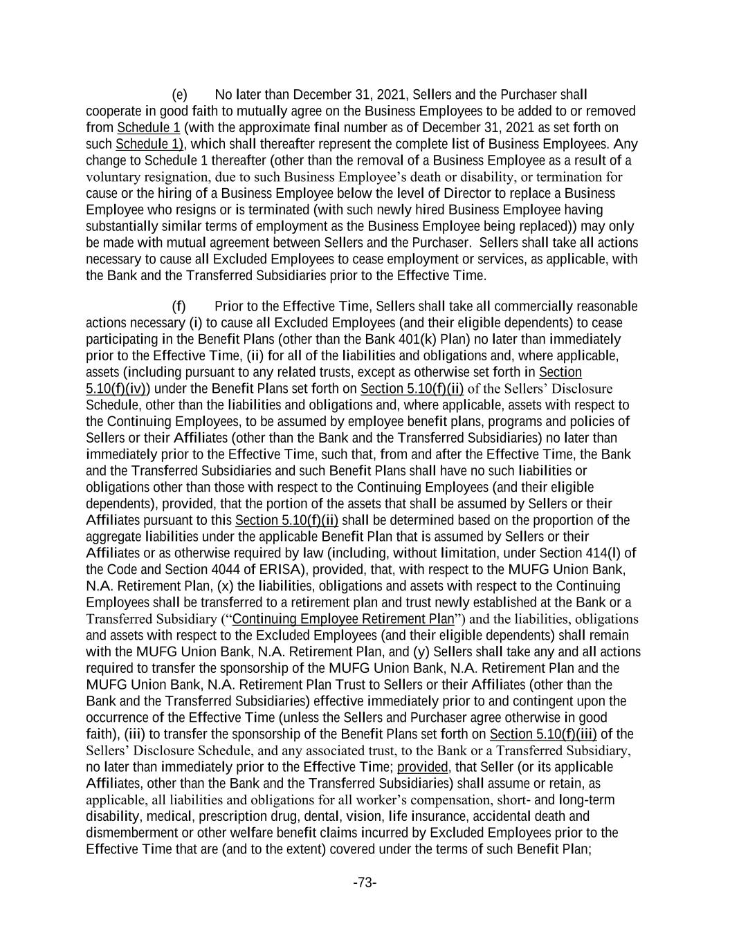 -73- (e) No later than December 31, 2021, Sellers and the Purchaser shall cooperate in good faith to mutually agree on the Business Employees to be added to or removed from Schedule 1 (with the approximate final number as of December 31, 2021 as set forth on such Schedule 1), which shall thereafter represent the complete list of Business Employees. Any change to Schedule 1 thereafter (other than the removal of a Business Employee as a result of a voluntary resignation, due to such Business Employee’s death or disability, or termination for cause or the hiring of a Business Employee below the level of Director to replace a Business Employee who resigns or is terminated (with such newly hired Business Employee having substantially similar terms of employment as the Business Employee being replaced)) may only be made with mutual agreement between Sellers and the Purchaser. Sellers shall take all actions necessary to cause all Excluded Employees to cease employment or services, as applicable, with the Bank and the Transferred Subsidiaries prior to the Effective Time. (f) Prior to the Effective Time, Sellers shall take all commercially reasonable actions necessary (i) to cause all Excluded Employees (and their eligible dependents) to cease participating in the Benefit Plans (other than the Bank 401(k) Plan) no later than immediately prior to the Effective Time, (ii) for all of the liabilities and obligations and, where applicable, assets (including pursuant to any related trusts, except as otherwise set forth in Section 5.10(f)(iv)) under the Benefit Plans set forth on Section 5.10(f)(ii) of the Sellers’ Disclosure Schedule, other than the liabilities and obligations and, where applicable, assets with respect to the Continuing Employees, to be assumed by employee benefit plans, programs and policies of Sellers or their Affiliates (other than the Bank and the Transferred Subsidiaries) no later than immediately prior to the Effective Time, such that, from and after the Effective Time, the Bank and the Transferred Subsidiaries and such Benefit Plans shall have no such liabilities or obligations other than those with respect to the Continuing Employees (and their eligible dependents), provided, that the portion of the assets that shall be assumed by Sellers or their Affiliates pursuant to this Section 5.10(f)(ii) shall be determined based on the proportion of the aggregate liabilities under the applicable Benefit Plan that is assumed by Sellers or their Affiliates or as otherwise required by law (including, without limitation, under Section 414(l) of the Code and Section 4044 of ERISA), provided, that, with respect to the MUFG Union Bank, N.A. Retirement Plan, (x) the liabilities, obligations and assets with respect to the Continuing Employees shall be transferred to a retirement plan and trust newly established at the Bank or a Transferred Subsidiary (“Continuing Employee Retirement Plan”) and the liabilities, obligations and assets with respect to the Excluded Employees (and their eligible dependents) shall remain with the MUFG Union Bank, N.A. Retirement Plan, and (y) Sellers shall take any and all actions required to transfer the sponsorship of the MUFG Union Bank, N.A. Retirement Plan and the MUFG Union Bank, N.A. Retirement Plan Trust to Sellers or their Affiliates (other than the Bank and the Transferred Subsidiaries) effective immediately prior to and contingent upon the occurrence of the Effective Time (unless the Sellers and Purchaser agree otherwise in good faith), (iii) to transfer the sponsorship of the Benefit Plans set forth on Section 5.10(f)(iii) of the Sellers’ Disclosure Schedule, and any associated trust, to the Bank or a Transferred Subsidiary, no later than immediately prior to the Effective Time; provided, that Seller (or its applicable Affiliates, other than the Bank and the Transferred Subsidiaries) shall assume or retain, as applicable, all liabilities and obligations for all worker’s compensation, short- and long-term disability, medical, prescription drug, dental, vision, life insurance, accidental death and dismemberment or other welfare benefit claims incurred by Excluded Employees prior to the Effective Time that are (and to the extent) covered under the terms of such Benefit Plan;