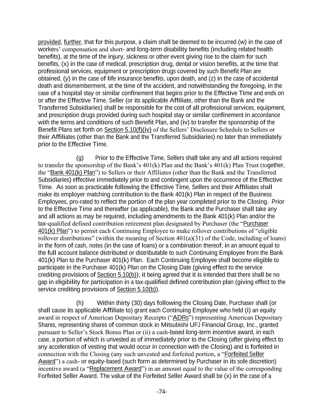 -74- provided, further, that for this purpose, a claim shall be deemed to be incurred (w) in the case of workers’ compensation and short- and long-term disability benefits (including related health benefits), at the time of the injury, sickness or other event giving rise to the claim for such benefits, (x) in the case of medical, prescription drug, dental or vision benefits, at the time that professional services, equipment or prescription drugs covered by such Benefit Plan are obtained, (y) in the case of life insurance benefits, upon death, and (z) in the case of accidental death and dismemberment, at the time of the accident, and notwithstanding the foregoing, in the case of a hospital stay or similar confinement that begins prior to the Effective Time and ends on or after the Effective Time, Seller (or its applicable Affiliate, other than the Bank and the Transferred Subsidiaries) shall be responsible for the cost of all professional services, equipment, and prescription drugs provided during such hospital stay or similar confinement in accordance with the terms and conditions of such Benefit Plan, and (iv) to transfer the sponsorship of the Benefit Plans set forth on Section 5.10(f)(iv) of the Sellers’ Disclosure Schedule to Sellers or their Affiliates (other than the Bank and the Transferred Subsidiaries) no later than immediately prior to the Effective Time. (g) Prior to the Effective Time, Sellers shall take any and all actions required to transfer the sponsorship of the Bank’s 401(k) Plan and the Bank’s 401(k) Plan Trust (together, the “Bank 401(k) Plan”) to Sellers or their Affiliates (other than the Bank and the Transferred Subsidiaries) effective immediately prior to and contingent upon the occurrence of the Effective Time. As soon as practicable following the Effective Time, Sellers and their Affiliates shall make its employer matching contribution to the Bank 401(k) Plan in respect of the Business Employees, pro-rated to reflect the portion of the plan year completed prior to the Closing. Prior to the Effective Time and thereafter (as applicable), the Bank and the Purchaser shall take any and all actions as may be required, including amendments to the Bank 401(k) Plan and/or the tax-qualified defined contribution retirement plan designated by Purchaser (the “Purchaser 401(k) Plan”) to permit each Continuing Employee to make rollover contributions of “eligible rollover distributions” (within the meaning of Section 401(a)(31) of the Code, including of loans) in the form of cash, notes (in the case of loans) or a combination thereof, in an amount equal to the full account balance distributed or distributable to such Continuing Employee from the Bank 401(k) Plan to the Purchaser 401(k) Plan. Each Continuing Employee shall become eligible to participate in the Purchaser 401(k) Plan on the Closing Date (giving effect to the service crediting provisions of Section 5.10(b)); it being agreed that it is intended that there shall be no gap in eligibility for participation in a tax-qualified defined contribution plan (giving effect to the service crediting provisions of Section 5.10(b)). (h) Within thirty (30) days following the Closing Date, Purchaser shall (or shall cause its applicable Affiliate to) grant each Continuing Employee who held (i) an equity award in respect of American Depositary Receipts (“ADRs”) representing American Depositary Shares, representing shares of common stock in Mitsubishi UFJ Financial Group, Inc., granted pursuant to Seller’s Stock Bonus Plan or (ii) a cash-based long-term incentive award, in each case, a portion of which is unvested as of immediately prior to the Closing (after giving effect to any acceleration of vesting that would occur in connection with the Closing) and is forfeited in connection with the Closing (any such unvested and forfeited portion, a “Forfeited Seller Award”) a cash- or equity-based (such form as determined by Purchaser in its sole discretion) incentive award (a “Replacement Award”) in an amount equal to the value of the corresponding Forfeited Seller Award. The value of the Forfeited Seller Award shall be (x) in the case of a