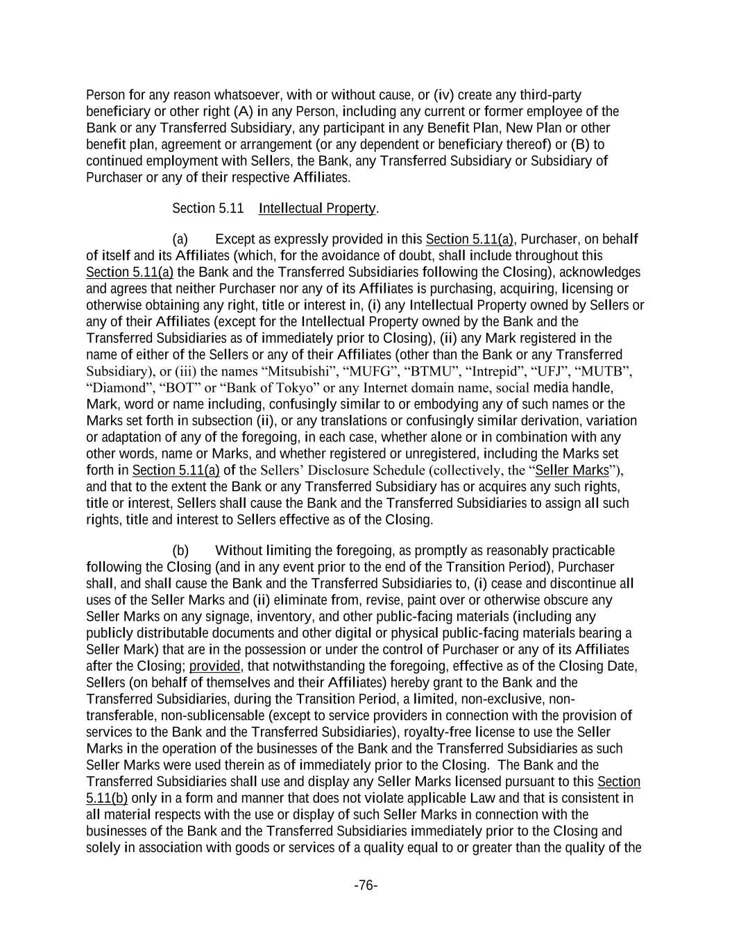 -76- Person for any reason whatsoever, with or without cause, or (iv) create any third-party beneficiary or other right (A) in any Person, including any current or former employee of the Bank or any Transferred Subsidiary, any participant in any Benefit Plan, New Plan or other benefit plan, agreement or arrangement (or any dependent or beneficiary thereof) or (B) to continued employment with Sellers, the Bank, any Transferred Subsidiary or Subsidiary of Purchaser or any of their respective Affiliates. Section 5.11 Intellectual Property. (a) Except as expressly provided in this Section 5.11(a), Purchaser, on behalf of itself and its Affiliates (which, for the avoidance of doubt, shall include throughout this Section 5.11(a) the Bank and the Transferred Subsidiaries following the Closing), acknowledges and agrees that neither Purchaser nor any of its Affiliates is purchasing, acquiring, licensing or otherwise obtaining any right, title or interest in, (i) any Intellectual Property owned by Sellers or any of their Affiliates (except for the Intellectual Property owned by the Bank and the Transferred Subsidiaries as of immediately prior to Closing), (ii) any Mark registered in the name of either of the Sellers or any of their Affiliates (other than the Bank or any Transferred Subsidiary), or (iii) the names “Mitsubishi”, “MUFG”, “BTMU”, “Intrepid”, “UFJ”, “MUTB”, “Diamond”, “BOT” or “Bank of Tokyo” or any Internet domain name, social media handle, Mark, word or name including, confusingly similar to or embodying any of such names or the Marks set forth in subsection (ii), or any translations or confusingly similar derivation, variation or adaptation of any of the foregoing, in each case, whether alone or in combination with any other words, name or Marks, and whether registered or unregistered, including the Marks set forth in Section 5.11(a) of the Sellers’ Disclosure Schedule (collectively, the “Seller Marks”), and that to the extent the Bank or any Transferred Subsidiary has or acquires any such rights, title or interest, Sellers shall cause the Bank and the Transferred Subsidiaries to assign all such rights, title and interest to Sellers effective as of the Closing. (b) Without limiting the foregoing, as promptly as reasonably practicable following the Closing (and in any event prior to the end of the Transition Period), Purchaser shall, and shall cause the Bank and the Transferred Subsidiaries to, (i) cease and discontinue all uses of the Seller Marks and (ii) eliminate from, revise, paint over or otherwise obscure any Seller Marks on any signage, inventory, and other public-facing materials (including any publicly distributable documents and other digital or physical public-facing materials bearing a Seller Mark) that are in the possession or under the control of Purchaser or any of its Affiliates after the Closing; provided, that notwithstanding the foregoing, effective as of the Closing Date, Sellers (on behalf of themselves and their Affiliates) hereby grant to the Bank and the Transferred Subsidiaries, during the Transition Period, a limited, non-exclusive, non- transferable, non-sublicensable (except to service providers in connection with the provision of services to the Bank and the Transferred Subsidiaries), royalty-free license to use the Seller Marks in the operation of the businesses of the Bank and the Transferred Subsidiaries as such Seller Marks were used therein as of immediately prior to the Closing. The Bank and the Transferred Subsidiaries shall use and display any Seller Marks licensed pursuant to this Section 5.11(b) only in a form and manner that does not violate applicable Law and that is consistent in all material respects with the use or display of such Seller Marks in connection with the businesses of the Bank and the Transferred Subsidiaries immediately prior to the Closing and solely in association with goods or services of a quality equal to or greater than the quality of the
