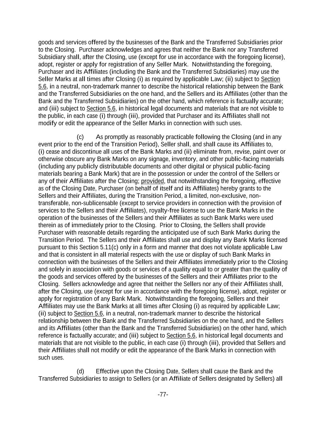 -77- goods and services offered by the businesses of the Bank and the Transferred Subsidiaries prior to the Closing. Purchaser acknowledges and agrees that neither the Bank nor any Transferred Subsidiary shall, after the Closing, use (except for use in accordance with the foregoing license), adopt, register or apply for registration of any Seller Mark. Notwithstanding the foregoing, Purchaser and its Affiliates (including the Bank and the Transferred Subsidiaries) may use the Seller Marks at all times after Closing (i) as required by applicable Law; (ii) subject to Section 5.6, in a neutral, non-trademark manner to describe the historical relationship between the Bank and the Transferred Subsidiaries on the one hand, and the Sellers and its Affiliates (other than the Bank and the Transferred Subsidiaries) on the other hand, which reference is factually accurate; and (iii) subject to Section 5.6, in historical legal documents and materials that are not visible to the public, in each case (i) through (iii), provided that Purchaser and its Affiliates shall not modify or edit the appearance of the Seller Marks in connection with such uses. (c) As promptly as reasonably practicable following the Closing (and in any event prior to the end of the Transition Period), Seller shall, and shall cause its Affiliates to, (i) cease and discontinue all uses of the Bank Marks and (ii) eliminate from, revise, paint over or otherwise obscure any Bank Marks on any signage, inventory, and other public-facing materials (including any publicly distributable documents and other digital or physical public-facing materials bearing a Bank Mark) that are in the possession or under the control of the Sellers or any of their Affiliates after the Closing; provided, that notwithstanding the foregoing, effective as of the Closing Date, Purchaser (on behalf of itself and its Affiliates) hereby grants to the Sellers and their Affiliates, during the Transition Period, a limited, non-exclusive, non- transferable, non-sublicensable (except to service providers in connection with the provision of services to the Sellers and their Affiliates), royalty-free license to use the Bank Marks in the operation of the businesses of the Sellers and their Affiliates as such Bank Marks were used therein as of immediately prior to the Closing. Prior to Closing, the Sellers shall provide Purchaser with reasonable details regarding the anticipated use of such Bank Marks during the Transition Period. The Sellers and their Affiliates shall use and display any Bank Marks licensed pursuant to this Section 5.11(c) only in a form and manner that does not violate applicable Law and that is consistent in all material respects with the use or display of such Bank Marks in connection with the businesses of the Sellers and their Affiliates immediately prior to the Closing and solely in association with goods or services of a quality equal to or greater than the quality of the goods and services offered by the businesses of the Sellers and their Affiliates prior to the Closing. Sellers acknowledge and agree that neither the Sellers nor any of their Affiliates shall, after the Closing, use (except for use in accordance with the foregoing license), adopt, register or apply for registration of any Bank Mark. Notwithstanding the foregoing, Sellers and their Affiliates may use the Bank Marks at all times after Closing (i) as required by applicable Law; (ii) subject to Section 5.6, in a neutral, non-trademark manner to describe the historical relationship between the Bank and the Transferred Subsidiaries on the one hand, and the Sellers and its Affiliates (other than the Bank and the Transferred Subsidiaries) on the other hand, which reference is factually accurate; and (iii) subject to Section 5.6, in historical legal documents and materials that are not visible to the public, in each case (i) through (iii), provided that Sellers and their Affiliates shall not modify or edit the appearance of the Bank Marks in connection with such uses. (d) Effective upon the Closing Date, Sellers shall cause the Bank and the Transferred Subsidiaries to assign to Sellers (or an Affiliate of Sellers designated by Sellers) all