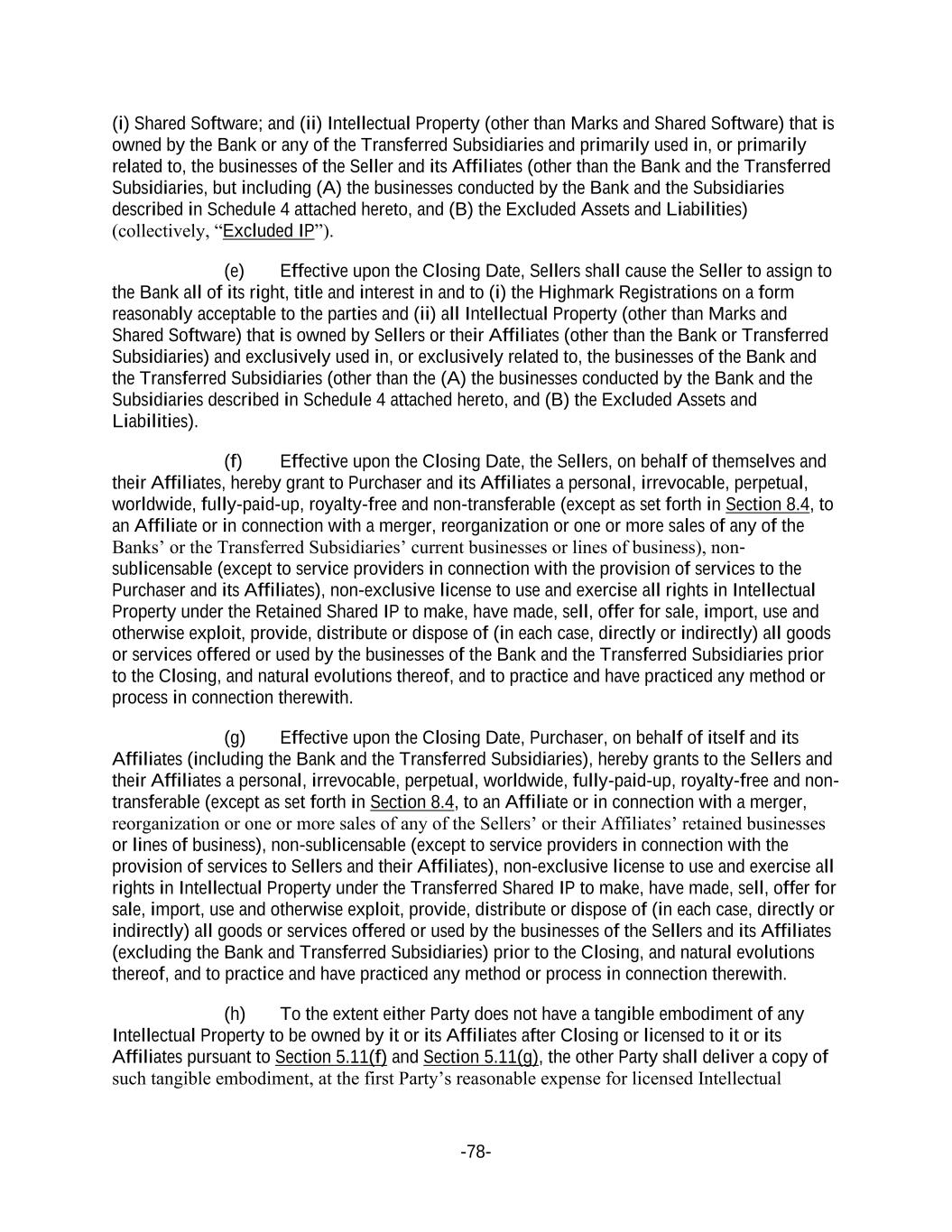 -78- (i) Shared Software; and (ii) Intellectual Property (other than Marks and Shared Software) that is owned by the Bank or any of the Transferred Subsidiaries and primarily used in, or primarily related to, the businesses of the Seller and its Affiliates (other than the Bank and the Transferred Subsidiaries, but including (A) the businesses conducted by the Bank and the Subsidiaries described in Schedule 4 attached hereto, and (B) the Excluded Assets and Liabilities) (collectively, “Excluded IP”). (e) Effective upon the Closing Date, Sellers shall cause the Seller to assign to the Bank all of its right, title and interest in and to (i) the Highmark Registrations on a form reasonably acceptable to the parties and (ii) all Intellectual Property (other than Marks and Shared Software) that is owned by Sellers or their Affiliates (other than the Bank or Transferred Subsidiaries) and exclusively used in, or exclusively related to, the businesses of the Bank and the Transferred Subsidiaries (other than the (A) the businesses conducted by the Bank and the Subsidiaries described in Schedule 4 attached hereto, and (B) the Excluded Assets and Liabilities). (f) Effective upon the Closing Date, the Sellers, on behalf of themselves and their Affiliates, hereby grant to Purchaser and its Affiliates a personal, irrevocable, perpetual, worldwide, fully-paid-up, royalty-free and non-transferable (except as set forth in Section 8.4, to an Affiliate or in connection with a merger, reorganization or one or more sales of any of the Banks’ or the Transferred Subsidiaries’ current businesses or lines of business), non- sublicensable (except to service providers in connection with the provision of services to the Purchaser and its Affiliates), non-exclusive license to use and exercise all rights in Intellectual Property under the Retained Shared IP to make, have made, sell, offer for sale, import, use and otherwise exploit, provide, distribute or dispose of (in each case, directly or indirectly) all goods or services offered or used by the businesses of the Bank and the Transferred Subsidiaries prior to the Closing, and natural evolutions thereof, and to practice and have practiced any method or process in connection therewith. (g) Effective upon the Closing Date, Purchaser, on behalf of itself and its Affiliates (including the Bank and the Transferred Subsidiaries), hereby grants to the Sellers and their Affiliates a personal, irrevocable, perpetual, worldwide, fully-paid-up, royalty-free and non- transferable (except as set forth in Section 8.4, to an Affiliate or in connection with a merger, reorganization or one or more sales of any of the Sellers’ or their Affiliates’ retained businesses or lines of business), non-sublicensable (except to service providers in connection with the provision of services to Sellers and their Affiliates), non-exclusive license to use and exercise all rights in Intellectual Property under the Transferred Shared IP to make, have made, sell, offer for sale, import, use and otherwise exploit, provide, distribute or dispose of (in each case, directly or indirectly) all goods or services offered or used by the businesses of the Sellers and its Affiliates (excluding the Bank and Transferred Subsidiaries) prior to the Closing, and natural evolutions thereof, and to practice and have practiced any method or process in connection therewith. (h) To the extent either Party does not have a tangible embodiment of any Intellectual Property to be owned by it or its Affiliates after Closing or licensed to it or its Affiliates pursuant to Section 5.11(f) and Section 5.11(g), the other Party shall deliver a copy of such tangible embodiment, at the first Party’s reasonable expense for licensed Intellectual