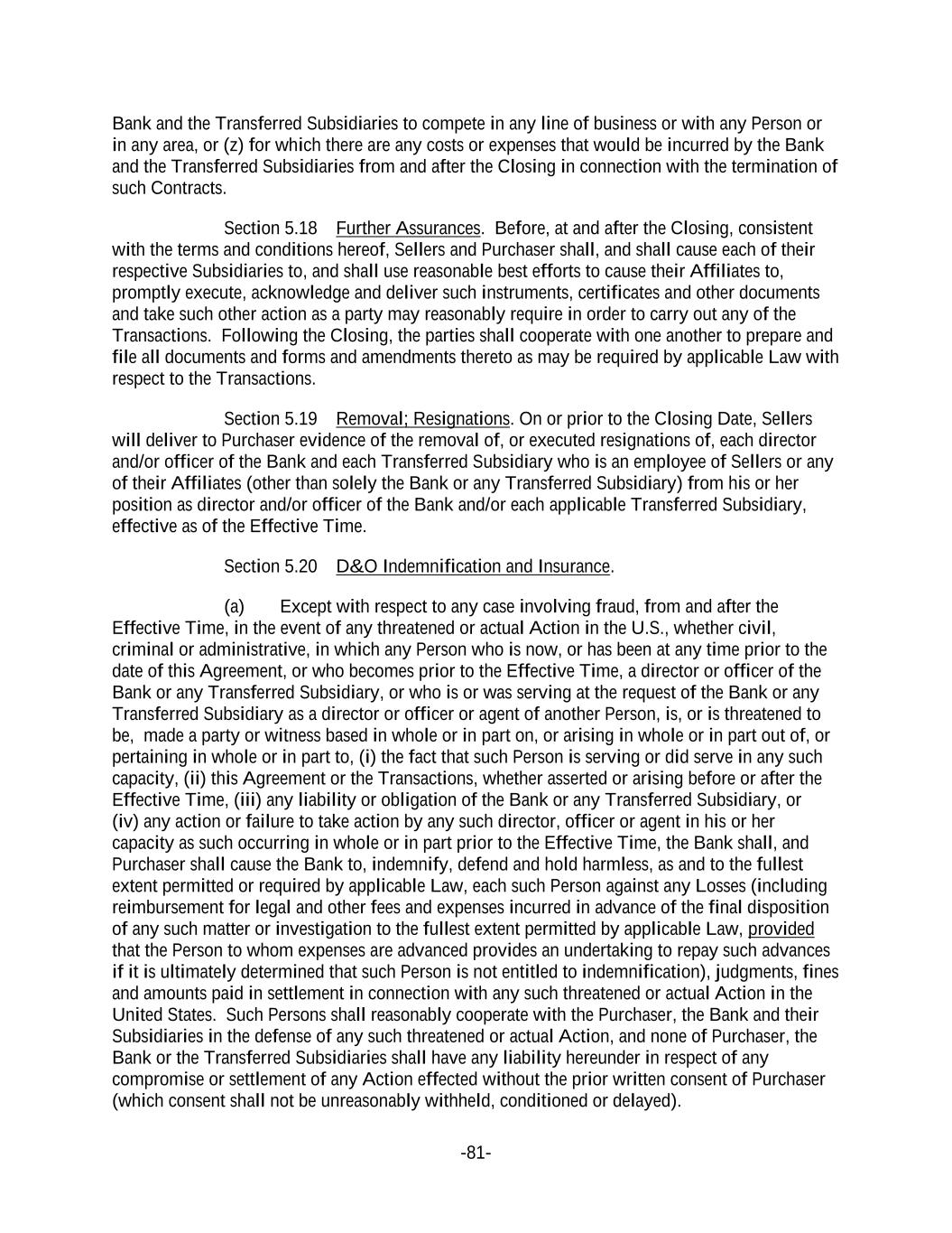 -81- Bank and the Transferred Subsidiaries to compete in any line of business or with any Person or in any area, or (z) for which there are any costs or expenses that would be incurred by the Bank and the Transferred Subsidiaries from and after the Closing in connection with the termination of such Contracts. Section 5.18 Further Assurances. Before, at and after the Closing, consistent with the terms and conditions hereof, Sellers and Purchaser shall, and shall cause each of their respective Subsidiaries to, and shall use reasonable best efforts to cause their Affiliates to, promptly execute, acknowledge and deliver such instruments, certificates and other documents and take such other action as a party may reasonably require in order to carry out any of the Transactions. Following the Closing, the parties shall cooperate with one another to prepare and file all documents and forms and amendments thereto as may be required by applicable Law with respect to the Transactions. Section 5.19 Removal; Resignations. On or prior to the Closing Date, Sellers will deliver to Purchaser evidence of the removal of, or executed resignations of, each director and/or officer of the Bank and each Transferred Subsidiary who is an employee of Sellers or any of their Affiliates (other than solely the Bank or any Transferred Subsidiary) from his or her position as director and/or officer of the Bank and/or each applicable Transferred Subsidiary, effective as of the Effective Time. Section 5.20 D&O Indemnification and Insurance. (a) Except with respect to any case involving fraud, from and after the Effective Time, in the event of any threatened or actual Action in the U.S., whether civil, criminal or administrative, in which any Person who is now, or has been at any time prior to the date of this Agreement, or who becomes prior to the Effective Time, a director or officer of the Bank or any Transferred Subsidiary, or who is or was serving at the request of the Bank or any Transferred Subsidiary as a director or officer or agent of another Person, is, or is threatened to be, made a party or witness based in whole or in part on, or arising in whole or in part out of, or pertaining in whole or in part to, (i) the fact that such Person is serving or did serve in any such capacity, (ii) this Agreement or the Transactions, whether asserted or arising before or after the Effective Time, (iii) any liability or obligation of the Bank or any Transferred Subsidiary, or (iv) any action or failure to take action by any such director, officer or agent in his or her capacity as such occurring in whole or in part prior to the Effective Time, the Bank shall, and Purchaser shall cause the Bank to, indemnify, defend and hold harmless, as and to the fullest extent permitted or required by applicable Law, each such Person against any Losses (including reimbursement for legal and other fees and expenses incurred in advance of the final disposition of any such matter or investigation to the fullest extent permitted by applicable Law, provided that the Person to whom expenses are advanced provides an undertaking to repay such advances if it is ultimately determined that such Person is not entitled to indemnification), judgments, fines and amounts paid in settlement in connection with any such threatened or actual Action in the United States. Such Persons shall reasonably cooperate with the Purchaser, the Bank and their Subsidiaries in the defense of any such threatened or actual Action, and none of Purchaser, the Bank or the Transferred Subsidiaries shall have any liability hereunder in respect of any compromise or settlement of any Action effected without the prior written consent of Purchaser (which consent shall not be unreasonably withheld, conditioned or delayed).