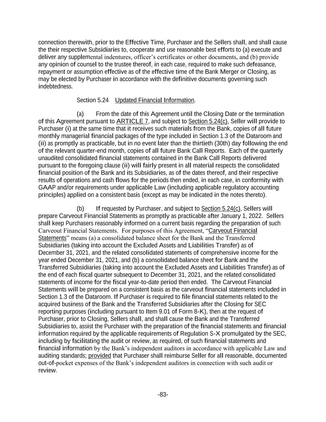 -83- connection therewith, prior to the Effective Time, Purchaser and the Sellers shall, and shall cause the their respective Subsidiaries to, cooperate and use reasonable best efforts to (a) execute and deliver any supplemental indentures, officer’s certificates or other documents, and (b) provide any opinion of counsel to the trustee thereof, in each case, required to make such defeasance, repayment or assumption effective as of the effective time of the Bank Merger or Closing, as may be elected by Purchaser in accordance with the definitive documents governing such indebtedness. Section 5.24 Updated Financial Information. (a) From the date of this Agreement until the Closing Date or the termination of this Agreement pursuant to ARTICLE 7, and subject to Section 5.24(c), Seller will provide to Purchaser (i) at the same time that it receives such materials from the Bank, copies of all future monthly managerial financial packages of the type included in Section 1.3 of the Dataroom and (ii) as promptly as practicable, but in no event later than the thirtieth (30th) day following the end of the relevant quarter-end month, copies of all future Bank Call Reports. Each of the quarterly unaudited consolidated financial statements contained in the Bank Call Reports delivered pursuant to the foregoing clause (ii) will fairly present in all material respects the consolidated financial position of the Bank and its Subsidiaries, as of the dates thereof, and their respective results of operations and cash flows for the periods then ended, in each case, in conformity with GAAP and/or requirements under applicable Law (including applicable regulatory accounting principles) applied on a consistent basis (except as may be indicated in the notes thereto). (b) If requested by Purchaser, and subject to Section 5.24(c), Sellers will prepare Carveout Financial Statements as promptly as practicable after January 1, 2022. Sellers shall keep Purchasers reasonably informed on a current basis regarding the preparation of such Carveout Financial Statements. For purposes of this Agreement, “Carveout Financial Statements” means (a) a consolidated balance sheet for the Bank and the Transferred Subsidiaries (taking into account the Excluded Assets and Liabilities Transfer) as of December 31, 2021, and the related consolidated statements of comprehensive income for the year ended December 31, 2021, and (b) a consolidated balance sheet for Bank and the Transferred Subsidiaries (taking into account the Excluded Assets and Liabilities Transfer) as of the end of each fiscal quarter subsequent to December 31, 2021, and the related consolidated statements of income for the fiscal year-to-date period then ended. The Carveout Financial Statements will be prepared on a consistent basis as the carveout financial statements included in Section 1.3 of the Dataroom. If Purchaser is required to file financial statements related to the acquired business of the Bank and the Transferred Subsidiaries after the Closing for SEC reporting purposes (including pursuant to Item 9.01 of Form 8-K), then at the request of Purchaser, prior to Closing, Sellers shall, and shall cause the Bank and the Transferred Subsidiaries to, assist the Purchaser with the preparation of the financial statements and financial information required by the applicable requirements of Regulation S-X promulgated by the SEC, including by facilitating the audit or review, as required, of such financial statements and financial information by the Bank’s independent auditors in accordance with applicable Law and auditing standards; provided that Purchaser shall reimburse Seller for all reasonable, documented out-of-pocket expenses of the Bank’s independent auditors in connection with such audit or review.