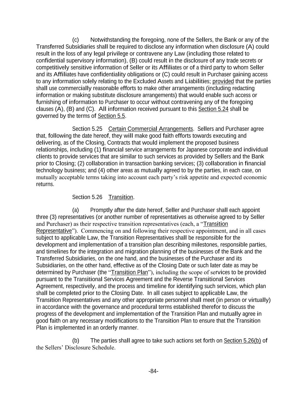 -84- (c) Notwithstanding the foregoing, none of the Sellers, the Bank or any of the Transferred Subsidiaries shall be required to disclose any information when disclosure (A) could result in the loss of any legal privilege or contravene any Law (including those related to confidential supervisory information), (B) could result in the disclosure of any trade secrets or competitively sensitive information of Seller or its Affiliates or of a third party to whom Seller and its Affiliates have confidentiality obligations or (C) could result in Purchaser gaining access to any information solely relating to the Excluded Assets and Liabilities; provided that the parties shall use commercially reasonable efforts to make other arrangements (including redacting information or making substitute disclosure arrangements) that would enable such access or furnishing of information to Purchaser to occur without contravening any of the foregoing clauses (A), (B) and (C). All information received pursuant to this Section 5.24 shall be governed by the terms of Section 5.5. Section 5.25 Certain Commercial Arrangements. Sellers and Purchaser agree that, following the date hereof, they will make good faith efforts towards executing and delivering, as of the Closing, Contracts that would implement the proposed business relationships, including (1) financial service arrangements for Japanese corporate and individual clients to provide services that are similar to such services as provided by Sellers and the Bank prior to Closing; (2) collaboration in transaction banking services; (3) collaboration in financial technology business; and (4) other areas as mutually agreed to by the parties, in each case, on mutually acceptable terms taking into account each party’s risk appetite and expected economic returns. Section 5.26 Transition. (a) Promptly after the date hereof, Seller and Purchaser shall each appoint three (3) representatives (or another number of representatives as otherwise agreed to by Seller and Purchaser) as their respective transition representatives (each, a “Transition Representative”). Commencing on and following their respective appointment, and in all cases subject to applicable Law, the Transition Representatives shall be responsible for the development and implementation of a transition plan describing milestones, responsible parties, and timelines for the integration and migration planning of the businesses of the Bank and the Transferred Subsidiaries, on the one hand, and the businesses of the Purchaser and its Subsidiaries, on the other hand, effective as of the Closing Date or such later date as may be determined by Purchaser (the “Transition Plan”), including the scope of services to be provided pursuant to the Transitional Services Agreement and the Reverse Transitional Services Agreement, respectively, and the process and timeline for identifying such services, which plan shall be completed prior to the Closing Date. In all cases subject to applicable Law, the Transition Representatives and any other appropriate personnel shall meet (in person or virtually) in accordance with the governance and procedural terms established therefor to discuss the progress of the development and implementation of the Transition Plan and mutually agree in good faith on any necessary modifications to the Transition Plan to ensure that the Transition Plan is implemented in an orderly manner. (b) The parties shall agree to take such actions set forth on Section 5.26(b) of the Sellers’ Disclosure Schedule.