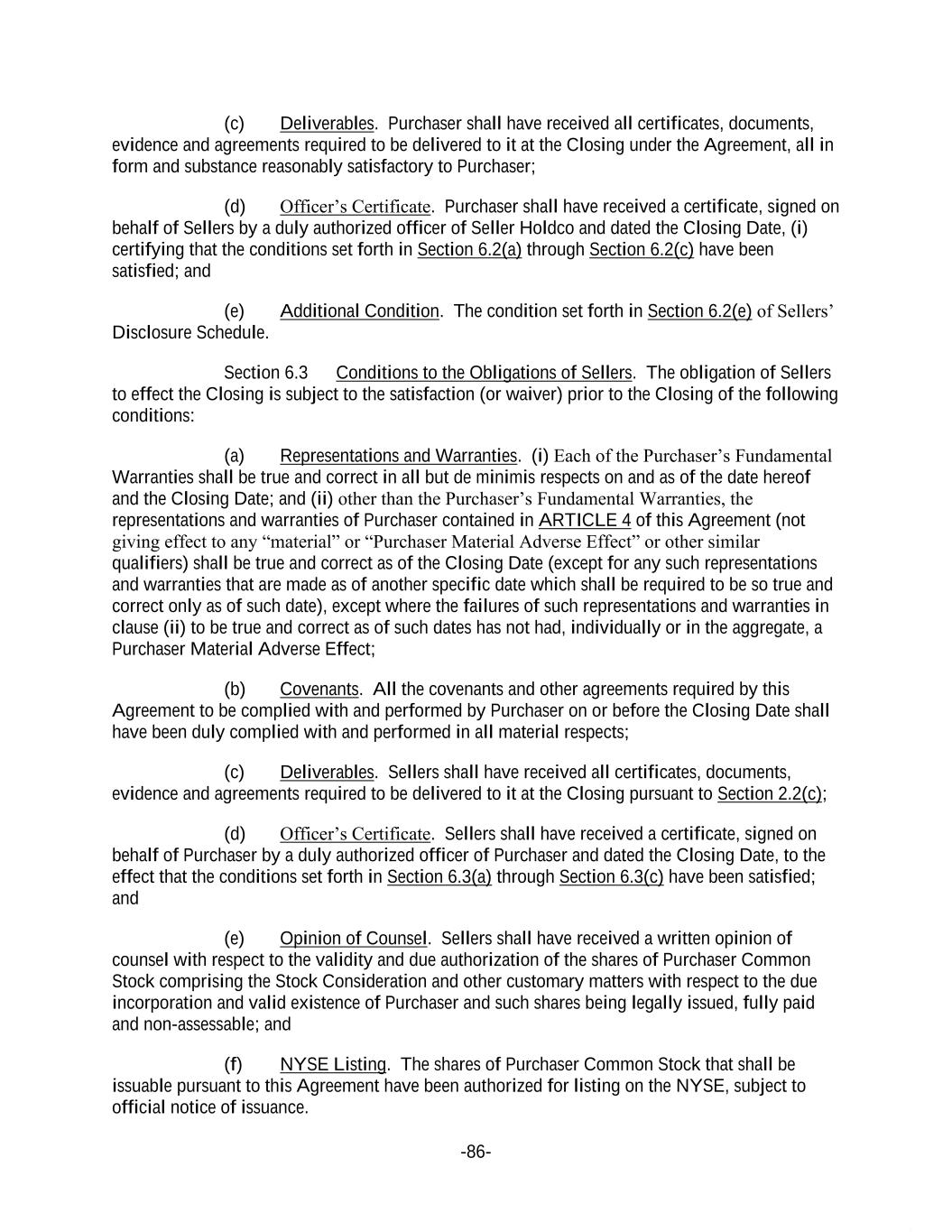 -86- (c) Deliverables. Purchaser shall have received all certificates, documents, evidence and agreements required to be delivered to it at the Closing under the Agreement, all in form and substance reasonably satisfactory to Purchaser; (d) Officer’s Certificate. Purchaser shall have received a certificate, signed on behalf of Sellers by a duly authorized officer of Seller Holdco and dated the Closing Date, (i) certifying that the conditions set forth in Section 6.2(a) through Section 6.2(c) have been satisfied; and (e) Additional Condition. The condition set forth in Section 6.2(e) of Sellers’ Disclosure Schedule. Section 6.3 Conditions to the Obligations of Sellers. The obligation of Sellers to effect the Closing is subject to the satisfaction (or waiver) prior to the Closing of the following conditions: (a) Representations and Warranties. (i) Each of the Purchaser’s Fundamental Warranties shall be true and correct in all but de minimis respects on and as of the date hereof and the Closing Date; and (ii) other than the Purchaser’s Fundamental Warranties, the representations and warranties of Purchaser contained in ARTICLE 4 of this Agreement (not giving effect to any “material” or “Purchaser Material Adverse Effect” or other similar qualifiers) shall be true and correct as of the Closing Date (except for any such representations and warranties that are made as of another specific date which shall be required to be so true and correct only as of such date), except where the failures of such representations and warranties in clause (ii) to be true and correct as of such dates has not had, individually or in the aggregate, a Purchaser Material Adverse Effect; (b) Covenants. All the covenants and other agreements required by this Agreement to be complied with and performed by Purchaser on or before the Closing Date shall have been duly complied with and performed in all material respects; (c) Deliverables. Sellers shall have received all certificates, documents, evidence and agreements required to be delivered to it at the Closing pursuant to Section 2.2(c); (d) Officer’s Certificate. Sellers shall have received a certificate, signed on behalf of Purchaser by a duly authorized officer of Purchaser and dated the Closing Date, to the effect that the conditions set forth in Section 6.3(a) through Section 6.3(c) have been satisfied; and (e) Opinion of Counsel. Sellers shall have received a written opinion of counsel with respect to the validity and due authorization of the shares of Purchaser Common Stock comprising the Stock Consideration and other customary matters with respect to the due incorporation and valid existence of Purchaser and such shares being legally issued, fully paid and non-assessable; and (f) NYSE Listing. The shares of Purchaser Common Stock that shall be issuable pursuant to this Agreement have been authorized for listing on the NYSE, subject to official notice of issuance.