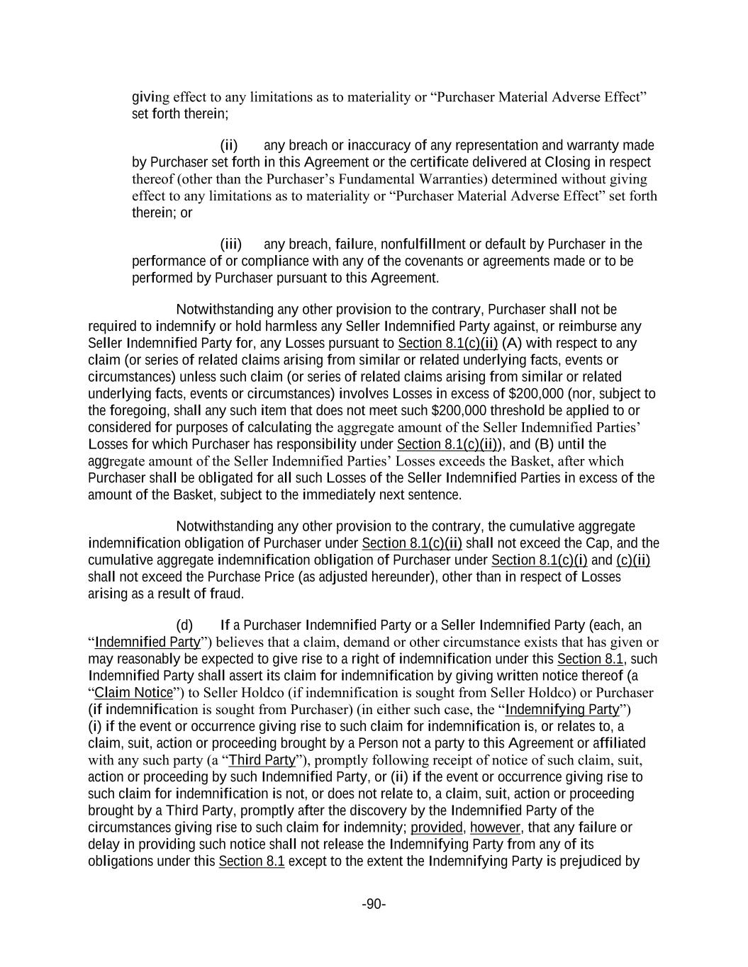 -90- giving effect to any limitations as to materiality or “Purchaser Material Adverse Effect” set forth therein; (ii) any breach or inaccuracy of any representation and warranty made by Purchaser set forth in this Agreement or the certificate delivered at Closing in respect thereof (other than the Purchaser’s Fundamental Warranties) determined without giving effect to any limitations as to materiality or “Purchaser Material Adverse Effect” set forth therein; or (iii) any breach, failure, nonfulfillment or default by Purchaser in the performance of or compliance with any of the covenants or agreements made or to be performed by Purchaser pursuant to this Agreement. Notwithstanding any other provision to the contrary, Purchaser shall not be required to indemnify or hold harmless any Seller Indemnified Party against, or reimburse any Seller Indemnified Party for, any Losses pursuant to Section 8.1(c)(ii) (A) with respect to any claim (or series of related claims arising from similar or related underlying facts, events or circumstances) unless such claim (or series of related claims arising from similar or related underlying facts, events or circumstances) involves Losses in excess of $200,000 (nor, subject to the foregoing, shall any such item that does not meet such $200,000 threshold be applied to or considered for purposes of calculating the aggregate amount of the Seller Indemnified Parties’ Losses for which Purchaser has responsibility under Section 8.1(c)(ii)), and (B) until the aggregate amount of the Seller Indemnified Parties’ Losses exceeds the Basket, after which Purchaser shall be obligated for all such Losses of the Seller Indemnified Parties in excess of the amount of the Basket, subject to the immediately next sentence. Notwithstanding any other provision to the contrary, the cumulative aggregate indemnification obligation of Purchaser under Section 8.1(c)(ii) shall not exceed the Cap, and the cumulative aggregate indemnification obligation of Purchaser under Section 8.1(c)(i) and (c)(ii) shall not exceed the Purchase Price (as adjusted hereunder), other than in respect of Losses arising as a result of fraud. (d) If a Purchaser Indemnified Party or a Seller Indemnified Party (each, an “Indemnified Party”) believes that a claim, demand or other circumstance exists that has given or may reasonably be expected to give rise to a right of indemnification under this Section 8.1, such Indemnified Party shall assert its claim for indemnification by giving written notice thereof (a “Claim Notice”) to Seller Holdco (if indemnification is sought from Seller Holdco) or Purchaser (if indemnification is sought from Purchaser) (in either such case, the “Indemnifying Party”) (i) if the event or occurrence giving rise to such claim for indemnification is, or relates to, a claim, suit, action or proceeding brought by a Person not a party to this Agreement or affiliated with any such party (a “Third Party”), promptly following receipt of notice of such claim, suit, action or proceeding by such Indemnified Party, or (ii) if the event or occurrence giving rise to such claim for indemnification is not, or does not relate to, a claim, suit, action or proceeding brought by a Third Party, promptly after the discovery by the Indemnified Party of the circumstances giving rise to such claim for indemnity; provided, however, that any failure or delay in providing such notice shall not release the Indemnifying Party from any of its obligations under this Section 8.1 except to the extent the Indemnifying Party is prejudiced by