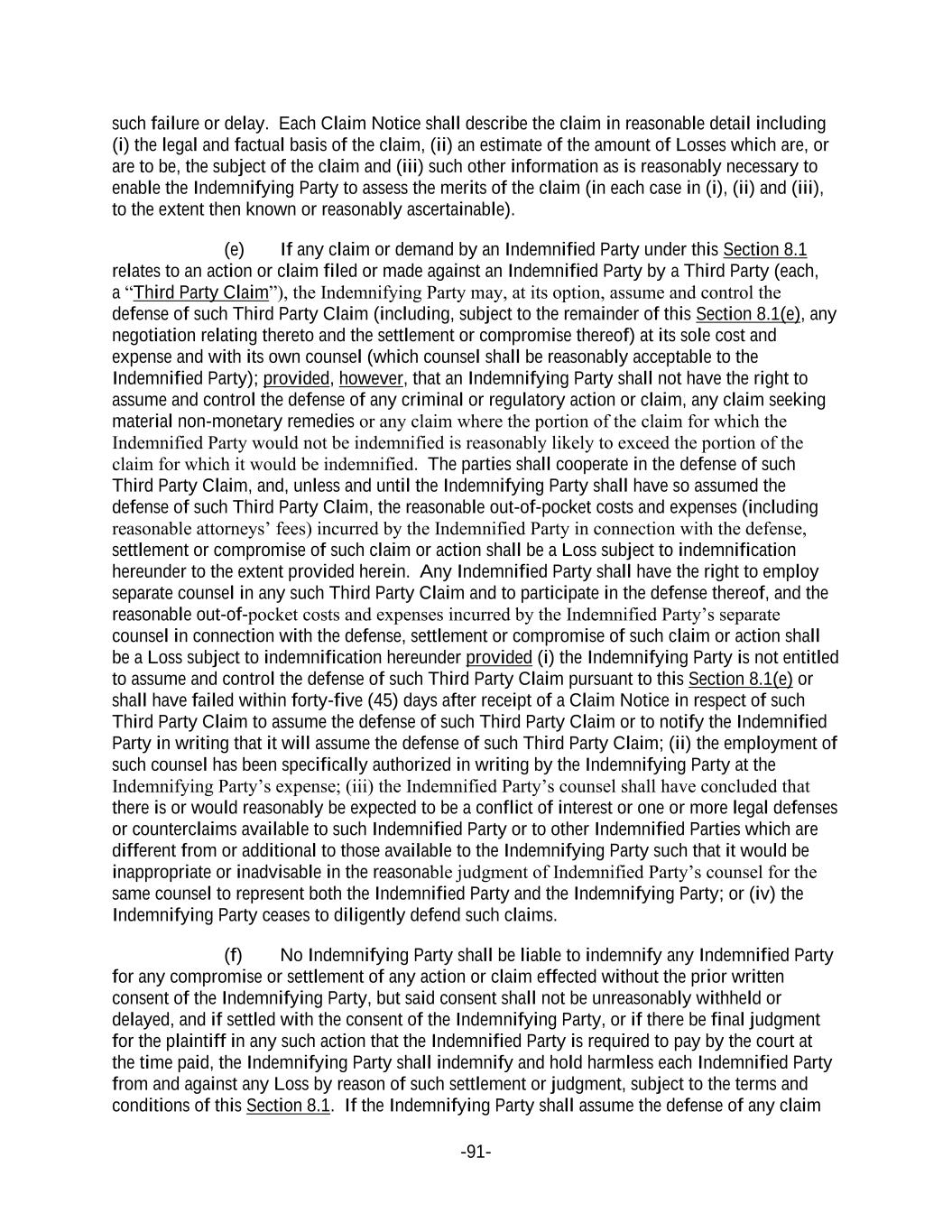 -91- such failure or delay. Each Claim Notice shall describe the claim in reasonable detail including (i) the legal and factual basis of the claim, (ii) an estimate of the amount of Losses which are, or are to be, the subject of the claim and (iii) such other information as is reasonably necessary to enable the Indemnifying Party to assess the merits of the claim (in each case in (i), (ii) and (iii), to the extent then known or reasonably ascertainable). (e) If any claim or demand by an Indemnified Party under this Section 8.1 relates to an action or claim filed or made against an Indemnified Party by a Third Party (each, a “Third Party Claim”), the Indemnifying Party may, at its option, assume and control the defense of such Third Party Claim (including, subject to the remainder of this Section 8.1(e), any negotiation relating thereto and the settlement or compromise thereof) at its sole cost and expense and with its own counsel (which counsel shall be reasonably acceptable to the Indemnified Party); provided, however, that an Indemnifying Party shall not have the right to assume and control the defense of any criminal or regulatory action or claim, any claim seeking material non-monetary remedies or any claim where the portion of the claim for which the Indemnified Party would not be indemnified is reasonably likely to exceed the portion of the claim for which it would be indemnified. The parties shall cooperate in the defense of such Third Party Claim, and, unless and until the Indemnifying Party shall have so assumed the defense of such Third Party Claim, the reasonable out-of-pocket costs and expenses (including reasonable attorneys’ fees) incurred by the Indemnified Party in connection with the defense, settlement or compromise of such claim or action shall be a Loss subject to indemnification hereunder to the extent provided herein. Any Indemnified Party shall have the right to employ separate counsel in any such Third Party Claim and to participate in the defense thereof, and the reasonable out-of-pocket costs and expenses incurred by the Indemnified Party’s separate counsel in connection with the defense, settlement or compromise of such claim or action shall be a Loss subject to indemnification hereunder provided (i) the Indemnifying Party is not entitled to assume and control the defense of such Third Party Claim pursuant to this Section 8.1(e) or shall have failed within forty-five (45) days after receipt of a Claim Notice in respect of such Third Party Claim to assume the defense of such Third Party Claim or to notify the Indemnified Party in writing that it will assume the defense of such Third Party Claim; (ii) the employment of such counsel has been specifically authorized in writing by the Indemnifying Party at the Indemnifying Party’s expense; (iii) the Indemnified Party’s counsel shall have concluded that there is or would reasonably be expected to be a conflict of interest or one or more legal defenses or counterclaims available to such Indemnified Party or to other Indemnified Parties which are different from or additional to those available to the Indemnifying Party such that it would be inappropriate or inadvisable in the reasonable judgment of Indemnified Party’s counsel for the same counsel to represent both the Indemnified Party and the Indemnifying Party; or (iv) the Indemnifying Party ceases to diligently defend such claims. (f) No Indemnifying Party shall be liable to indemnify any Indemnified Party for any compromise or settlement of any action or claim effected without the prior written consent of the Indemnifying Party, but said consent shall not be unreasonably withheld or delayed, and if settled with the consent of the Indemnifying Party, or if there be final judgment for the plaintiff in any such action that the Indemnified Party is required to pay by the court at the time paid, the Indemnifying Party shall indemnify and hold harmless each Indemnified Party from and against any Loss by reason of such settlement or judgment, subject to the terms and conditions of this Section 8.1. If the Indemnifying Party shall assume the defense of any claim