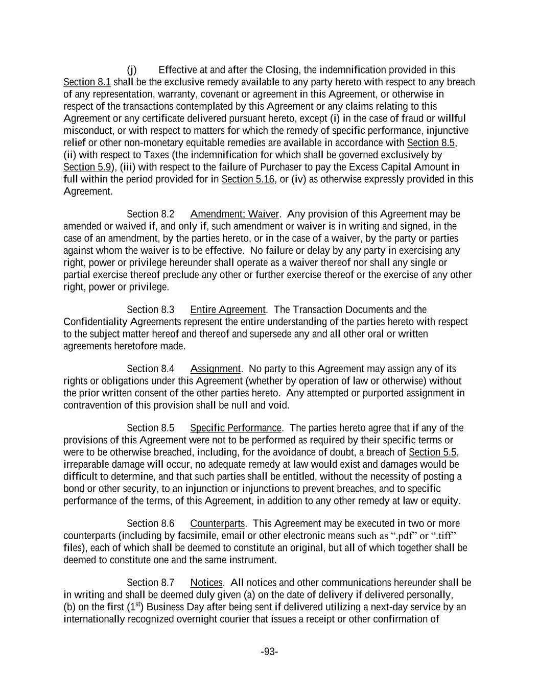 -93- (j) Effective at and after the Closing, the indemnification provided in this Section 8.1 shall be the exclusive remedy available to any party hereto with respect to any breach of any representation, warranty, covenant or agreement in this Agreement, or otherwise in respect of the transactions contemplated by this Agreement or any claims relating to this Agreement or any certificate delivered pursuant hereto, except (i) in the case of fraud or willful misconduct, or with respect to matters for which the remedy of specific performance, injunctive relief or other non-monetary equitable remedies are available in accordance with Section 8.5, (ii) with respect to Taxes (the indemnification for which shall be governed exclusively by Section 5.9), (iii) with respect to the failure of Purchaser to pay the Excess Capital Amount in full within the period provided for in Section 5.16, or (iv) as otherwise expressly provided in this Agreement. Section 8.2 Amendment; Waiver. Any provision of this Agreement may be amended or waived if, and only if, such amendment or waiver is in writing and signed, in the case of an amendment, by the parties hereto, or in the case of a waiver, by the party or parties against whom the waiver is to be effective. No failure or delay by any party in exercising any right, power or privilege hereunder shall operate as a waiver thereof nor shall any single or partial exercise thereof preclude any other or further exercise thereof or the exercise of any other right, power or privilege. Section 8.3 Entire Agreement. The Transaction Documents and the Confidentiality Agreements represent the entire understanding of the parties hereto with respect to the subject matter hereof and thereof and supersede any and all other oral or written agreements heretofore made. Section 8.4 Assignment. No party to this Agreement may assign any of its rights or obligations under this Agreement (whether by operation of law or otherwise) without the prior written consent of the other parties hereto. Any attempted or purported assignment in contravention of this provision shall be null and void. Section 8.5 Specific Performance. The parties hereto agree that if any of the provisions of this Agreement were not to be performed as required by their specific terms or were to be otherwise breached, including, for the avoidance of doubt, a breach of Section 5.5, irreparable damage will occur, no adequate remedy at law would exist and damages would be difficult to determine, and that such parties shall be entitled, without the necessity of posting a bond or other security, to an injunction or injunctions to prevent breaches, and to specific performance of the terms, of this Agreement, in addition to any other remedy at law or equity. Section 8.6 Counterparts. This Agreement may be executed in two or more counterparts (including by facsimile, email or other electronic means such as “.pdf” or “.tiff” files), each of which shall be deemed to constitute an original, but all of which together shall be deemed to constitute one and the same instrument. Section 8.7 Notices. All notices and other communications hereunder shall be in writing and shall be deemed duly given (a) on the date of delivery if delivered personally, (b) on the first (1st) Business Day after being sent if delivered utilizing a next-day service by an internationally recognized overnight courier that issues a receipt or other confirmation of