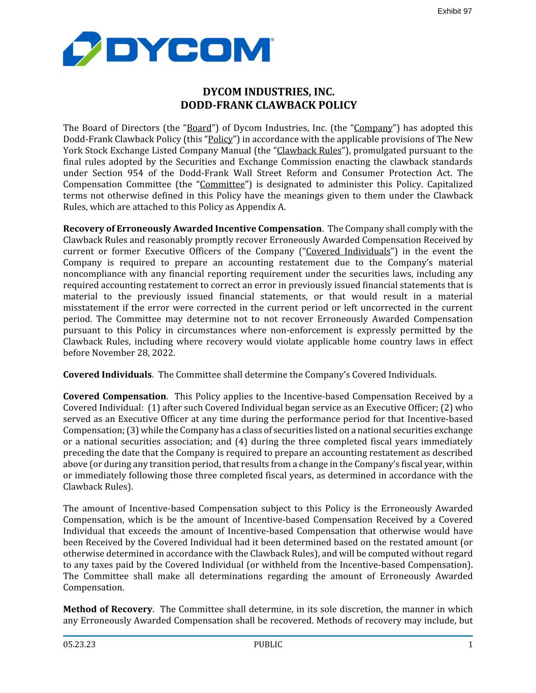 05.23.23 PUBLIC 1 DYCOM INDUSTRIES, INC. DODD-FRANK CLAWBACK POLICY The Board of Directors (the “Board”) of Dycom Industries, Inc. (the “Company”) has adopted this Dodd-Frank Clawback Policy (this “Policy”) in accordance with the applicable provisions of The New York Stock Exchange Listed Company Manual (the “Clawback Rules”), promulgated pursuant to the final rules adopted by the Securities and Exchange Commission enacting the clawback standards under Section 954 of the Dodd-Frank Wall Street Reform and Consumer Protection Act. The Compensation Committee (the “Committee”) is designated to administer this Policy. Capitalized terms not otherwise defined in this Policy have the meanings given to them under the Clawback Rules, which are attached to this Policy as Appendix A. Recovery of Erroneously Awarded Incentive Compensation. The Company shall comply with the Clawback Rules and reasonably promptly recover Erroneously Awarded Compensation Received by current or former Executive Officers of the Company (“Covered Individuals”) in the event the Company is required to prepare an accounting restatement due to the Company’s material noncompliance with any financial reporting requirement under the securities laws, including any required accounting restatement to correct an error in previously issued financial statements that is material to the previously issued financial statements, or that would result in a material misstatement if the error were corrected in the current period or left uncorrected in the current period. The Committee may determine not to not recover Erroneously Awarded Compensation pursuant to this Policy in circumstances where non-enforcement is expressly permitted by the Clawback Rules, including where recovery would violate applicable home country laws in effect before November 28, 2022. Covered Individuals. The Committee shall determine the Company’s Covered Individuals. Covered Compensation. This Policy applies to the Incentive-based Compensation Received by a Covered Individual: (1) after such Covered Individual began service as an Executive Officer; (2) who served as an Executive Officer at any time during the performance period for that Incentive-based Compensation; (3) while the Company has a class of securities listed on a national securities exchange or a national securities association; and (4) during the three completed fiscal years immediately preceding the date that the Company is required to prepare an accounting restatement as described above (or during any transition period, that results from a change in the Company’s fiscal year, within or immediately following those three completed fiscal years, as determined in accordance with the Clawback Rules). The amount of Incentive-based Compensation subject to this Policy is the Erroneously Awarded Compensation, which is be the amount of Incentive-based Compensation Received by a Covered Individual that exceeds the amount of Incentive-based Compensation that otherwise would have been Received by the Covered Individual had it been determined based on the restated amount (or otherwise determined in accordance with the Clawback Rules), and will be computed without regard to any taxes paid by the Covered Individual (or withheld from the Incentive-based Compensation). The Committee shall make all determinations regarding the amount of Erroneously Awarded Compensation. Method of Recovery. The Committee shall determine, in its sole discretion, the manner in which any Erroneously Awarded Compensation shall be recovered. Methods of recovery may include, but Exhibit 97