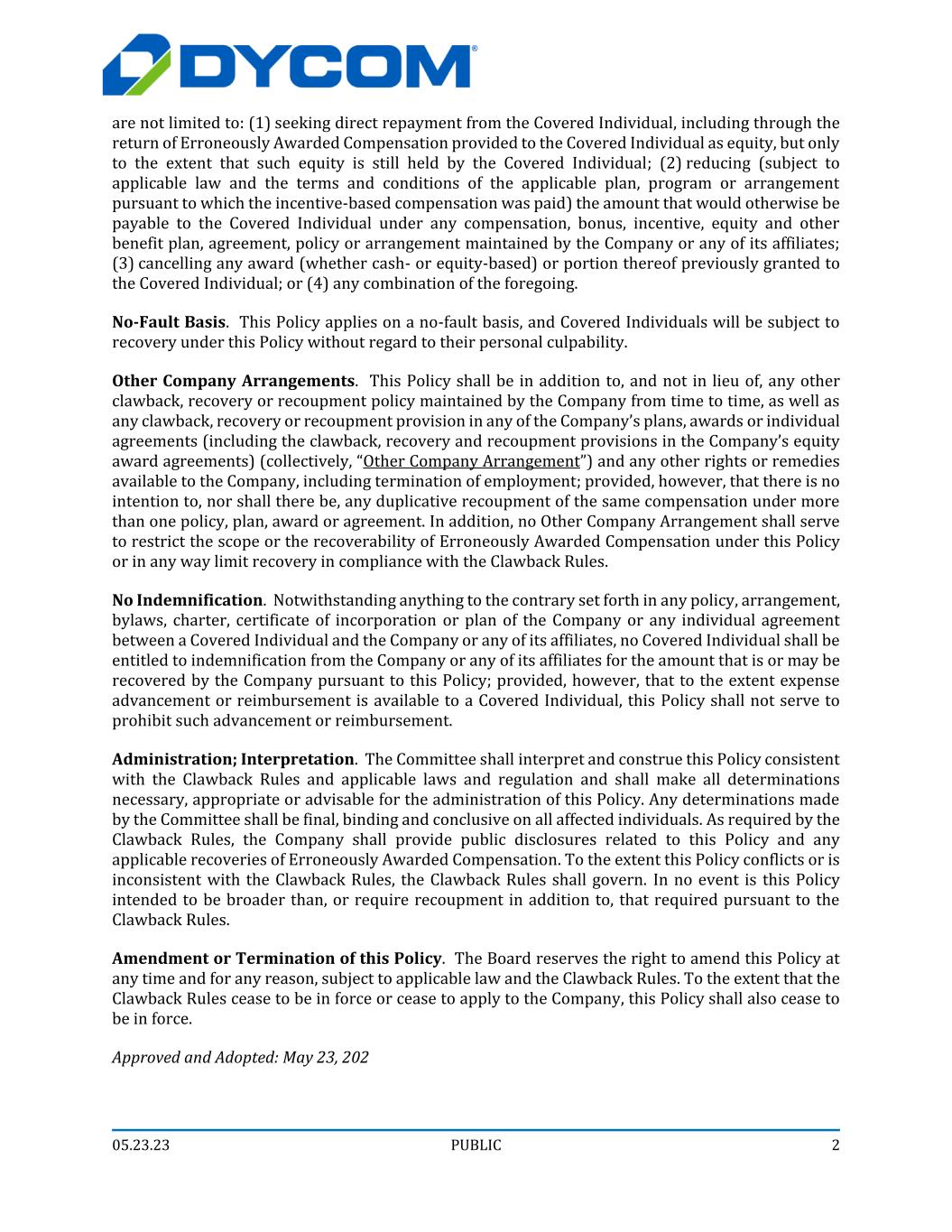 05.23.23 PUBLIC 2 are not limited to: (1) seeking direct repayment from the Covered Individual, including through the return of Erroneously Awarded Compensation provided to the Covered Individual as equity, but only to the extent that such equity is still held by the Covered Individual; (2) reducing (subject to applicable law and the terms and conditions of the applicable plan, program or arrangement pursuant to which the incentive-based compensation was paid) the amount that would otherwise be payable to the Covered Individual under any compensation, bonus, incentive, equity and other benefit plan, agreement, policy or arrangement maintained by the Company or any of its affiliates; (3) cancelling any award (whether cash- or equity-based) or portion thereof previously granted to the Covered Individual; or (4) any combination of the foregoing. No-Fault Basis. This Policy applies on a no-fault basis, and Covered Individuals will be subject to recovery under this Policy without regard to their personal culpability. Other Company Arrangements. This Policy shall be in addition to, and not in lieu of, any other clawback, recovery or recoupment policy maintained by the Company from time to time, as well as any clawback, recovery or recoupment provision in any of the Company’s plans, awards or individual agreements (including the clawback, recovery and recoupment provisions in the Company’s equity award agreements) (collectively, “Other Company Arrangement”) and any other rights or remedies available to the Company, including termination of employment; provided, however, that there is no intention to, nor shall there be, any duplicative recoupment of the same compensation under more than one policy, plan, award or agreement. In addition, no Other Company Arrangement shall serve to restrict the scope or the recoverability of Erroneously Awarded Compensation under this Policy or in any way limit recovery in compliance with the Clawback Rules. No Indemnification. Notwithstanding anything to the contrary set forth in any policy, arrangement, bylaws, charter, certificate of incorporation or plan of the Company or any individual agreement between a Covered Individual and the Company or any of its affiliates, no Covered Individual shall be entitled to indemnification from the Company or any of its affiliates for the amount that is or may be recovered by the Company pursuant to this Policy; provided, however, that to the extent expense advancement or reimbursement is available to a Covered Individual, this Policy shall not serve to prohibit such advancement or reimbursement. Administration; Interpretation. The Committee shall interpret and construe this Policy consistent with the Clawback Rules and applicable laws and regulation and shall make all determinations necessary, appropriate or advisable for the administration of this Policy. Any determinations made by the Committee shall be final, binding and conclusive on all affected individuals. As required by the Clawback Rules, the Company shall provide public disclosures related to this Policy and any applicable recoveries of Erroneously Awarded Compensation. To the extent this Policy conflicts or is inconsistent with the Clawback Rules, the Clawback Rules shall govern. In no event is this Policy intended to be broader than, or require recoupment in addition to, that required pursuant to the Clawback Rules. Amendment or Termination of this Policy. The Board reserves the right to amend this Policy at any time and for any reason, subject to applicable law and the Clawback Rules. To the extent that the Clawback Rules cease to be in force or cease to apply to the Company, this Policy shall also cease to be in force. Approved and Adopted: May 23, 202