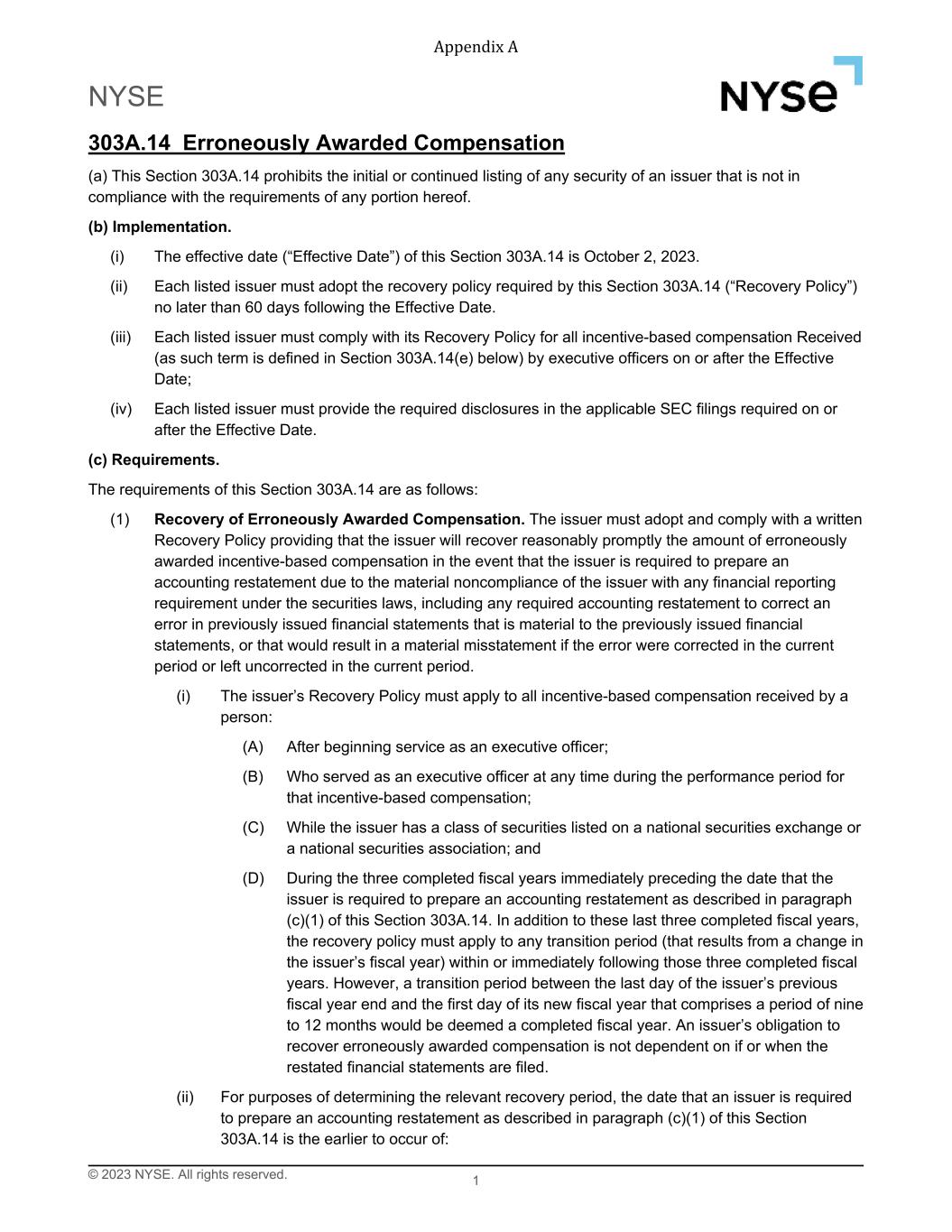 NYSE © 2023 NYSE. All rights reserved. 1 303A.14 Erroneously Awarded Compensation (a) This Section 303A.14 prohibits the initial or continued listing of any security of an issuer that is not in compliance with the requirements of any portion hereof. (b) Implementation. (i) The effective date (“Effective Date”) of this Section 303A.14 is October 2, 2023. (ii) Each listed issuer must adopt the recovery policy required by this Section 303A.14 (“Recovery Policy”) no later than 60 days following the Effective Date. (iii) Each listed issuer must comply with its Recovery Policy for all incentive-based compensation Received (as such term is defined in Section 303A.14(e) below) by executive officers on or after the Effective Date; (iv) Each listed issuer must provide the required disclosures in the applicable SEC filings required on or after the Effective Date. (c) Requirements. The requirements of this Section 303A.14 are as follows: (1) Recovery of Erroneously Awarded Compensation. The issuer must adopt and comply with a written Recovery Policy providing that the issuer will recover reasonably promptly the amount of erroneously awarded incentive-based compensation in the event that the issuer is required to prepare an accounting restatement due to the material noncompliance of the issuer with any financial reporting requirement under the securities laws, including any required accounting restatement to correct an error in previously issued financial statements that is material to the previously issued financial statements, or that would result in a material misstatement if the error were corrected in the current period or left uncorrected in the current period. (i) The issuer’s Recovery Policy must apply to all incentive-based compensation received by a person: (A) After beginning service as an executive officer; (B) Who served as an executive officer at any time during the performance period for that incentive-based compensation; (C) While the issuer has a class of securities listed on a national securities exchange or a national securities association; and (D) During the three completed fiscal years immediately preceding the date that the issuer is required to prepare an accounting restatement as described in paragraph (c)(1) of this Section 303A.14. In addition to these last three completed fiscal years, the recovery policy must apply to any transition period (that results from a change in the issuer’s fiscal year) within or immediately following those three completed fiscal years. However, a transition period between the last day of the issuer’s previous fiscal year end and the first day of its new fiscal year that comprises a period of nine to 12 months would be deemed a completed fiscal year. An issuer’s obligation to recover erroneously awarded compensation is not dependent on if or when the restated financial statements are filed. (ii) For purposes of determining the relevant recovery period, the date that an issuer is required to prepare an accounting restatement as described in paragraph (c)(1) of this Section 303A.14 is the earlier to occur of: Appendix A