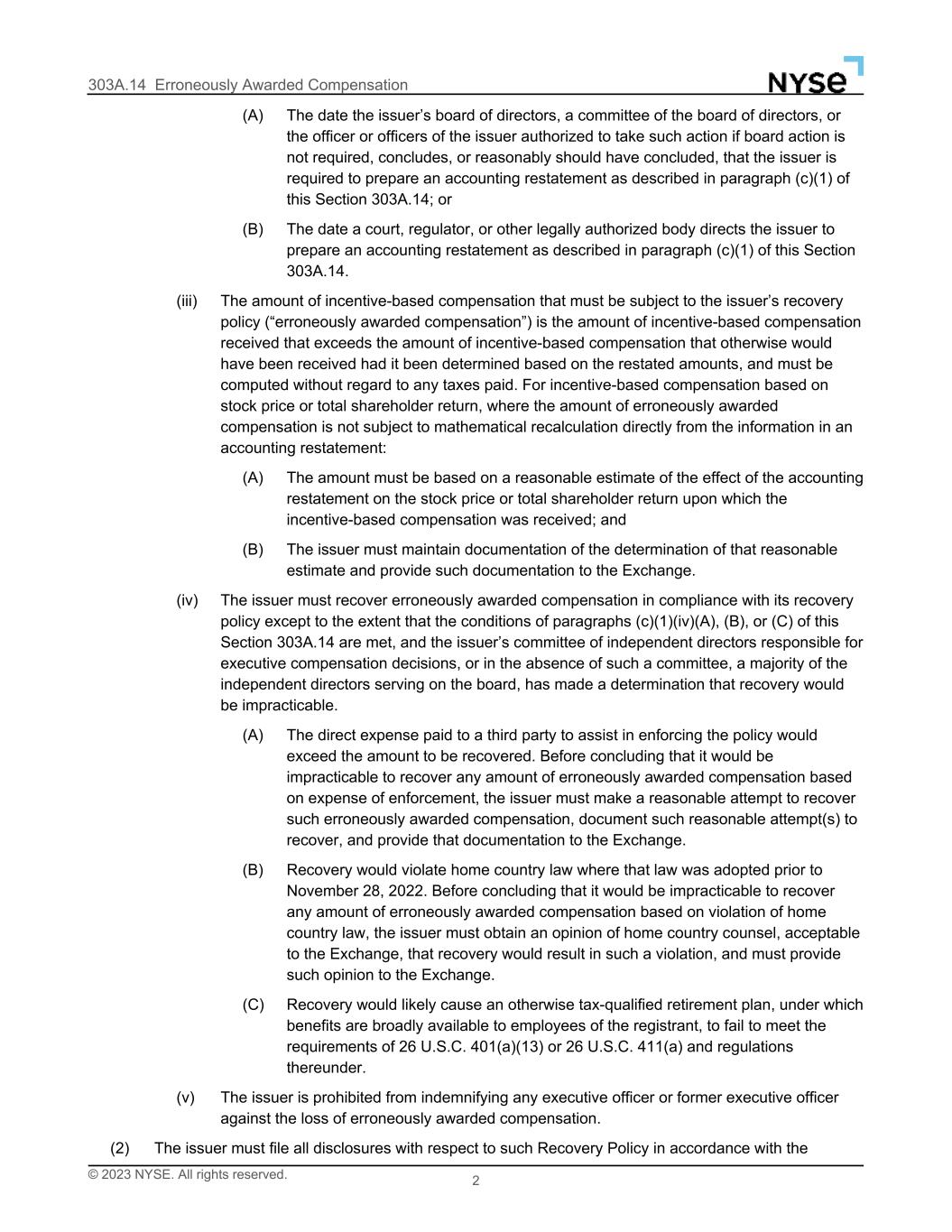 303A.14 Erroneously Awarded Compensation © 2023 NYSE. All rights reserved. 2 (A) The date the issuer’s board of directors, a committee of the board of directors, or the officer or officers of the issuer authorized to take such action if board action is not required, concludes, or reasonably should have concluded, that the issuer is required to prepare an accounting restatement as described in paragraph (c)(1) of this Section 303A.14; or (B) The date a court, regulator, or other legally authorized body directs the issuer to prepare an accounting restatement as described in paragraph (c)(1) of this Section 303A.14. (iii) The amount of incentive-based compensation that must be subject to the issuer’s recovery policy (“erroneously awarded compensation”) is the amount of incentive-based compensation received that exceeds the amount of incentive-based compensation that otherwise would have been received had it been determined based on the restated amounts, and must be computed without regard to any taxes paid. For incentive-based compensation based on stock price or total shareholder return, where the amount of erroneously awarded compensation is not subject to mathematical recalculation directly from the information in an accounting restatement: (A) The amount must be based on a reasonable estimate of the effect of the accounting restatement on the stock price or total shareholder return upon which the incentive-based compensation was received; and (B) The issuer must maintain documentation of the determination of that reasonable estimate and provide such documentation to the Exchange. (iv) The issuer must recover erroneously awarded compensation in compliance with its recovery policy except to the extent that the conditions of paragraphs (c)(1)(iv)(A), (B), or (C) of this Section 303A.14 are met, and the issuer’s committee of independent directors responsible for executive compensation decisions, or in the absence of such a committee, a majority of the independent directors serving on the board, has made a determination that recovery would be impracticable. (A) The direct expense paid to a third party to assist in enforcing the policy would exceed the amount to be recovered. Before concluding that it would be impracticable to recover any amount of erroneously awarded compensation based on expense of enforcement, the issuer must make a reasonable attempt to recover such erroneously awarded compensation, document such reasonable attempt(s) to recover, and provide that documentation to the Exchange. (B) Recovery would violate home country law where that law was adopted prior to November 28, 2022. Before concluding that it would be impracticable to recover any amount of erroneously awarded compensation based on violation of home country law, the issuer must obtain an opinion of home country counsel, acceptable to the Exchange, that recovery would result in such a violation, and must provide such opinion to the Exchange. (C) Recovery would likely cause an otherwise tax-qualified retirement plan, under which benefits are broadly available to employees of the registrant, to fail to meet the requirements of 26 U.S.C. 401(a)(13) or 26 U.S.C. 411(a) and regulations thereunder. (v) The issuer is prohibited from indemnifying any executive officer or former executive officer against the loss of erroneously awarded compensation. (2) The issuer must file all disclosures with respect to such Recovery Policy in accordance with the