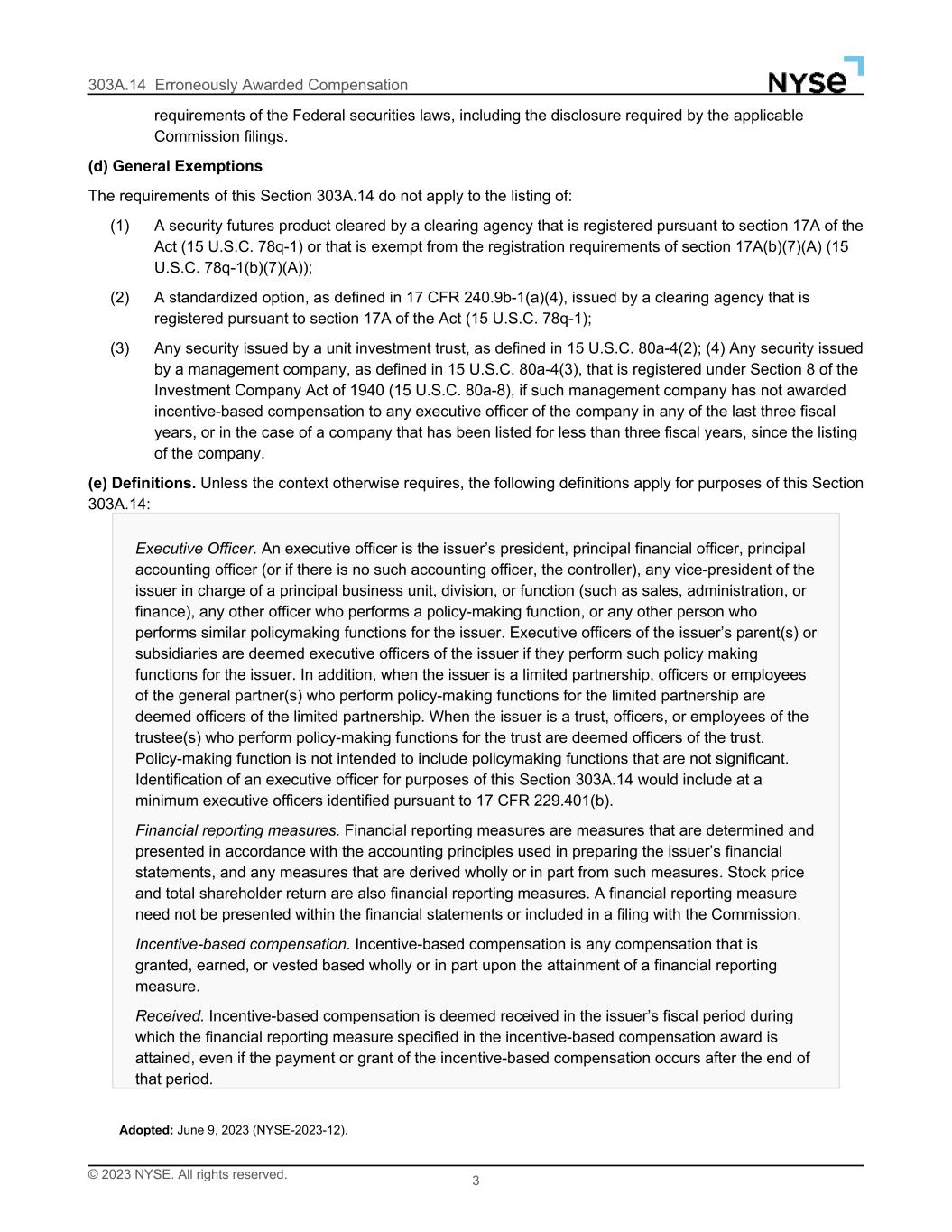 303A.14 Erroneously Awarded Compensation © 2023 NYSE. All rights reserved. 3 requirements of the Federal securities laws, including the disclosure required by the applicable Commission filings. (d) General Exemptions The requirements of this Section 303A.14 do not apply to the listing of: (1) A security futures product cleared by a clearing agency that is registered pursuant to section 17A of the Act (15 U.S.C. 78q-1) or that is exempt from the registration requirements of section 17A(b)(7)(A) (15 U.S.C. 78q-1(b)(7)(A)); (2) A standardized option, as defined in 17 CFR 240.9b-1(a)(4), issued by a clearing agency that is registered pursuant to section 17A of the Act (15 U.S.C. 78q-1); (3) Any security issued by a unit investment trust, as defined in 15 U.S.C. 80a-4(2); (4) Any security issued by a management company, as defined in 15 U.S.C. 80a-4(3), that is registered under Section 8 of the Investment Company Act of 1940 (15 U.S.C. 80a-8), if such management company has not awarded incentive-based compensation to any executive officer of the company in any of the last three fiscal years, or in the case of a company that has been listed for less than three fiscal years, since the listing of the company. (e) Definitions. Unless the context otherwise requires, the following definitions apply for purposes of this Section 303A.14: Executive Officer. An executive officer is the issuer’s president, principal financial officer, principal accounting officer (or if there is no such accounting officer, the controller), any vice-president of the issuer in charge of a principal business unit, division, or function (such as sales, administration, or finance), any other officer who performs a policy-making function, or any other person who performs similar policymaking functions for the issuer. Executive officers of the issuer’s parent(s) or subsidiaries are deemed executive officers of the issuer if they perform such policy making functions for the issuer. In addition, when the issuer is a limited partnership, officers or employees of the general partner(s) who perform policy-making functions for the limited partnership are deemed officers of the limited partnership. When the issuer is a trust, officers, or employees of the trustee(s) who perform policy-making functions for the trust are deemed officers of the trust. Policy-making function is not intended to include policymaking functions that are not significant. Identification of an executive officer for purposes of this Section 303A.14 would include at a minimum executive officers identified pursuant to 17 CFR 229.401(b). Financial reporting measures. Financial reporting measures are measures that are determined and presented in accordance with the accounting principles used in preparing the issuer’s financial statements, and any measures that are derived wholly or in part from such measures. Stock price and total shareholder return are also financial reporting measures. A financial reporting measure need not be presented within the financial statements or included in a filing with the Commission. Incentive-based compensation. Incentive-based compensation is any compensation that is granted, earned, or vested based wholly or in part upon the attainment of a financial reporting measure. Received. Incentive-based compensation is deemed received in the issuer’s fiscal period during which the financial reporting measure specified in the incentive-based compensation award is attained, even if the payment or grant of the incentive-based compensation occurs after the end of that period. Adopted: June 9, 2023 (NYSE-2023-12).