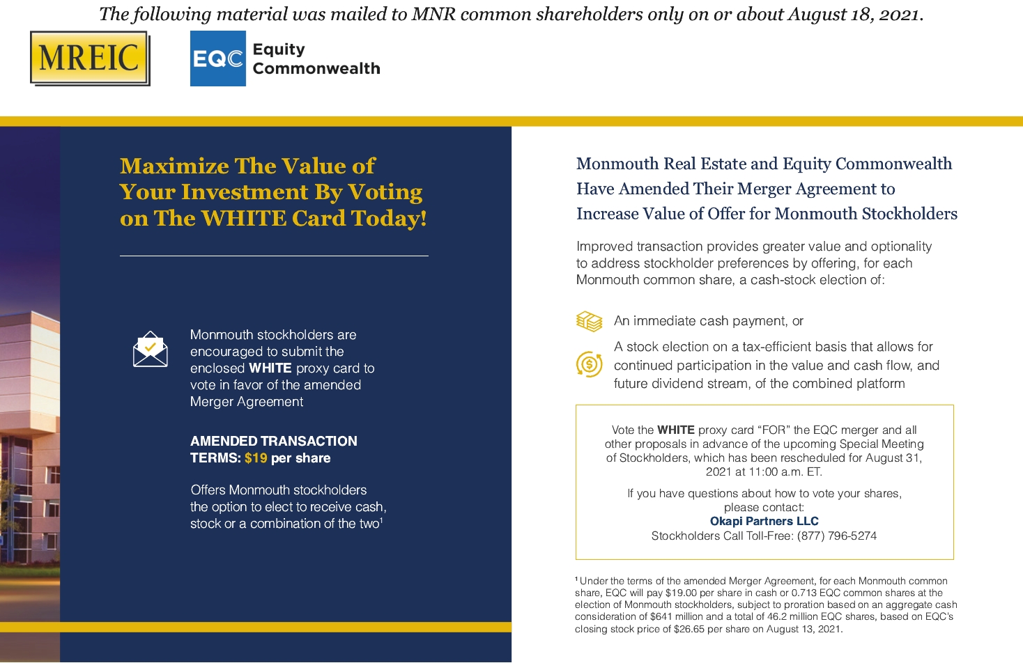 • | To offer an election for MNR shareholders to make the structure more attractive: The new cash component of the revised offer provides greater certainty of value and optionality to MNR’s common shareholders while also increasing the overall value of the offer. The revised offer increases the exchange ratio from 0.67 to 0.713, representing a 6.4% premium over the previous all-stock offer based on EQC’s closing price on August 13, 2021 of $26.65; |