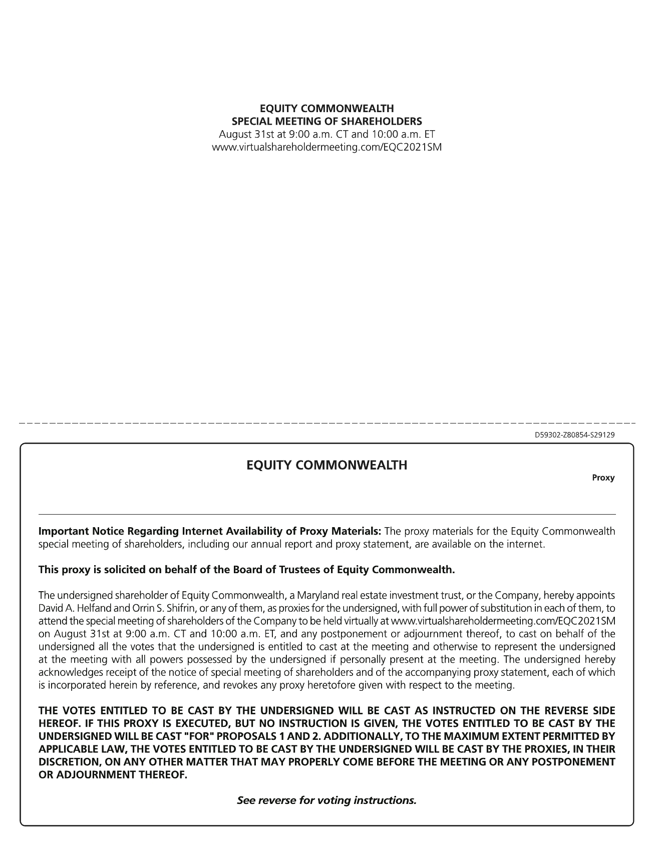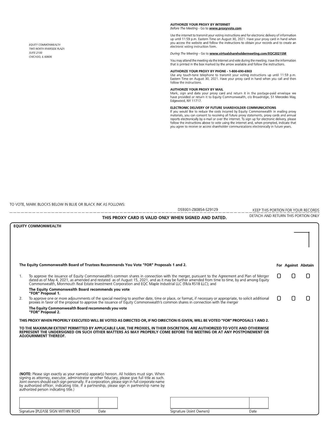 ○ | Strong Corporate Governance and Leadership: EQC’s commitment to strong corporate governance that promotes transparency as well as alignment with and accountability to shareholders will continue at the Combined Company. Sam Zell will remain the Chairman of the Board of Trustees of the Combined Company, which will continue to be led by EQC’s President and Chief Executive Officer David Helfand and the existing EQC senior management team. The EQC management team has a demonstrated record in real estate and public REIT management, including consistent execution of EQC’s strategic goals under the supervision and direction of the EQC Board. Following completion of the merger, the board of trustees of the Combined Company will consist of (i) all of the members of the EQC Board serving immediately prior to the effective time of the merger and (ii) Michael P. Landy and Sonal Pande, who have been designated by the MNR Board to serve on the board of trustees of the Combined Company following the completion of the merger in accordance with the terms of the amended merger agreement. |