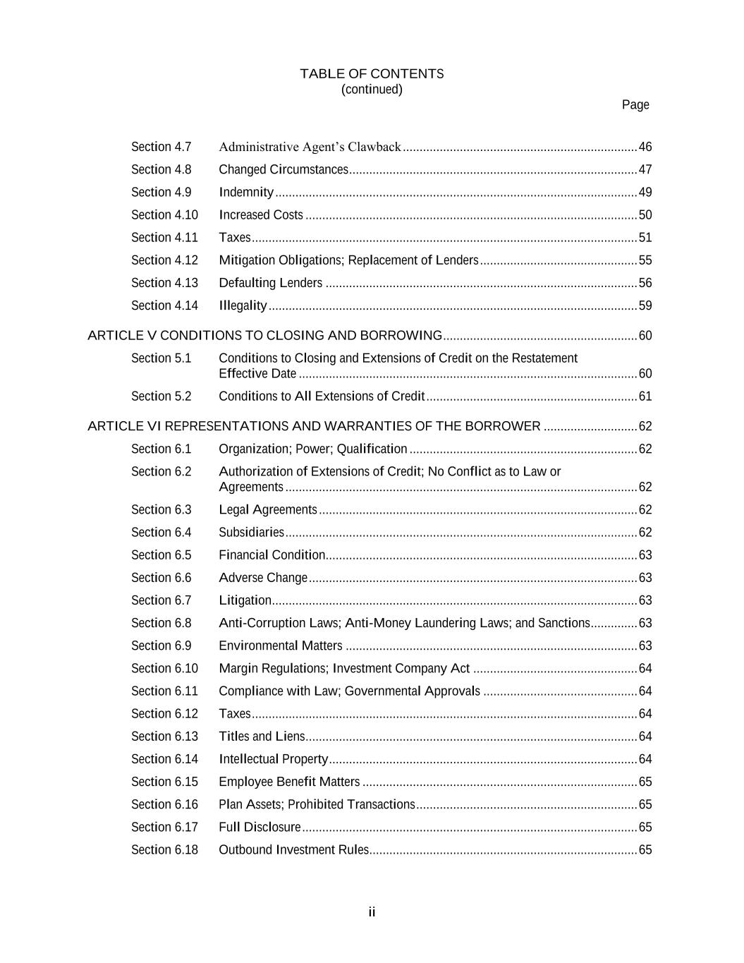 TABLE OF CONTENTS (continued) Page ii Section 4.7 Administrative Agent’s Clawback ...................................................................... 46 Section 4.8 Changed Circumstances ...................................................................................... 47 Section 4.9 Indemnity ............................................................................................................ 49 Section 4.10 Increased Costs ................................................................................................... 50 Section 4.11 Taxes ................................................................................................................... 51 Section 4.12 Mitigation Obligations; Replacement of Lenders ............................................... 55 Section 4.13 Defaulting Lenders ............................................................................................. 56 Section 4.14 Illegality .............................................................................................................. 59 ARTICLE V CONDITIONS TO CLOSING AND BORROWING .......................................................... 60 Section 5.1 Conditions to Closing and Extensions of Credit on the Restatement Effective Date ..................................................................................................... 60 Section 5.2 Conditions to All Extensions of Credit ............................................................... 61 ARTICLE VI REPRESENTATIONS AND WARRANTIES OF THE BORROWER ............................ 62 Section 6.1 Organization; Power; Qualification .................................................................... 62 Section 6.2 Authorization of Extensions of Credit; No Conflict as to Law or Agreements ......................................................................................................... 62 Section 6.3 Legal Agreements ............................................................................................... 62 Section 6.4 Subsidiaries ......................................................................................................... 62 Section 6.5 Financial Condition ............................................................................................. 63 Section 6.6 Adverse Change .................................................................................................. 63 Section 6.7 Litigation ............................................................................................................. 63 Section 6.8 Anti-Corruption Laws; Anti-Money Laundering Laws; and Sanctions .............. 63 Section 6.9 Environmental Matters ....................................................................................... 63 Section 6.10 Margin Regulations; Investment Company Act ................................................. 64 Section 6.11 Compliance with Law; Governmental Approvals .............................................. 64 Section 6.12 Taxes ................................................................................................................... 64 Section 6.13 Titles and Liens ................................................................................................... 64 Section 6.14 Intellectual Property ............................................................................................ 64 Section 6.15 Employee Benefit Matters .................................................................................. 65 Section 6.16 Plan Assets; Prohibited Transactions .................................................................. 65 Section 6.17 Full Disclosure .................................................................................................... 65 Section 6.18 Outbound Investment Rules ................................................................................ 65