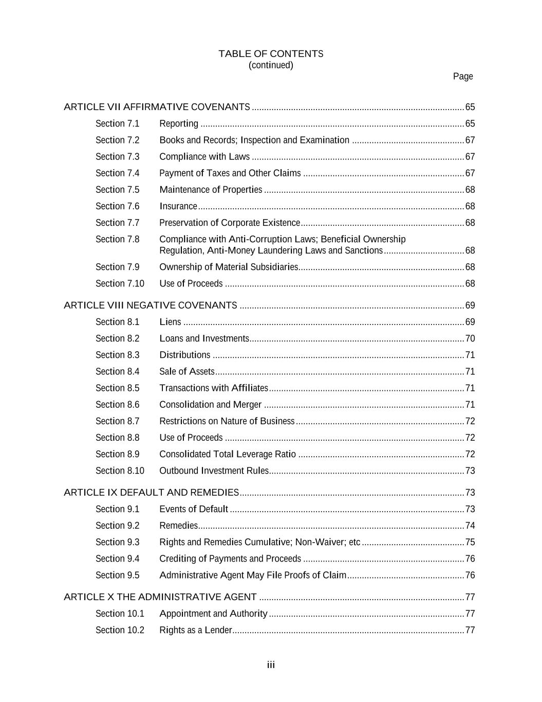 TABLE OF CONTENTS (continued) Page iii ARTICLE VII AFFIRMATIVE COVENANTS ....................................................................................... 65 Section 7.1 Reporting ............................................................................................................ 65 Section 7.2 Books and Records; Inspection and Examination .............................................. 67 Section 7.3 Compliance with Laws ....................................................................................... 67 Section 7.4 Payment of Taxes and Other Claims .................................................................. 67 Section 7.5 Maintenance of Properties .................................................................................. 68 Section 7.6 Insurance ............................................................................................................. 68 Section 7.7 Preservation of Corporate Existence ................................................................... 68 Section 7.8 Compliance with Anti-Corruption Laws; Beneficial Ownership Regulation, Anti-Money Laundering Laws and Sanctions ................................. 68 Section 7.9 Ownership of Material Subsidiaries.................................................................... 68 Section 7.10 Use of Proceeds .................................................................................................. 68 ARTICLE VIII NEGATIVE COVENANTS ............................................................................................ 69 Section 8.1 Liens ................................................................................................................... 69 Section 8.2 Loans and Investments ........................................................................................ 70 Section 8.3 Distributions ....................................................................................................... 71 Section 8.4 Sale of Assets ...................................................................................................... 71 Section 8.5 Transactions with Affiliates ................................................................................ 71 Section 8.6 Consolidation and Merger .................................................................................. 71 Section 8.7 Restrictions on Nature of Business ..................................................................... 72 Section 8.8 Use of Proceeds .................................................................................................. 72 Section 8.9 Consolidated Total Leverage Ratio .................................................................... 72 Section 8.10 Outbound Investment Rules ................................................................................ 73 ARTICLE IX DEFAULT AND REMEDIES ............................................................................................ 73 Section 9.1 Events of Default ................................................................................................ 73 Section 9.2 Remedies ............................................................................................................. 74 Section 9.3 Rights and Remedies Cumulative; Non-Waiver; etc .......................................... 75 Section 9.4 Crediting of Payments and Proceeds .................................................................. 76 Section 9.5 Administrative Agent May File Proofs of Claim ................................................ 76 ARTICLE X THE ADMINISTRATIVE AGENT .................................................................................... 77 Section 10.1 Appointment and Authority ................................................................................ 77 Section 10.2 Rights as a Lender ............................................................................................... 77