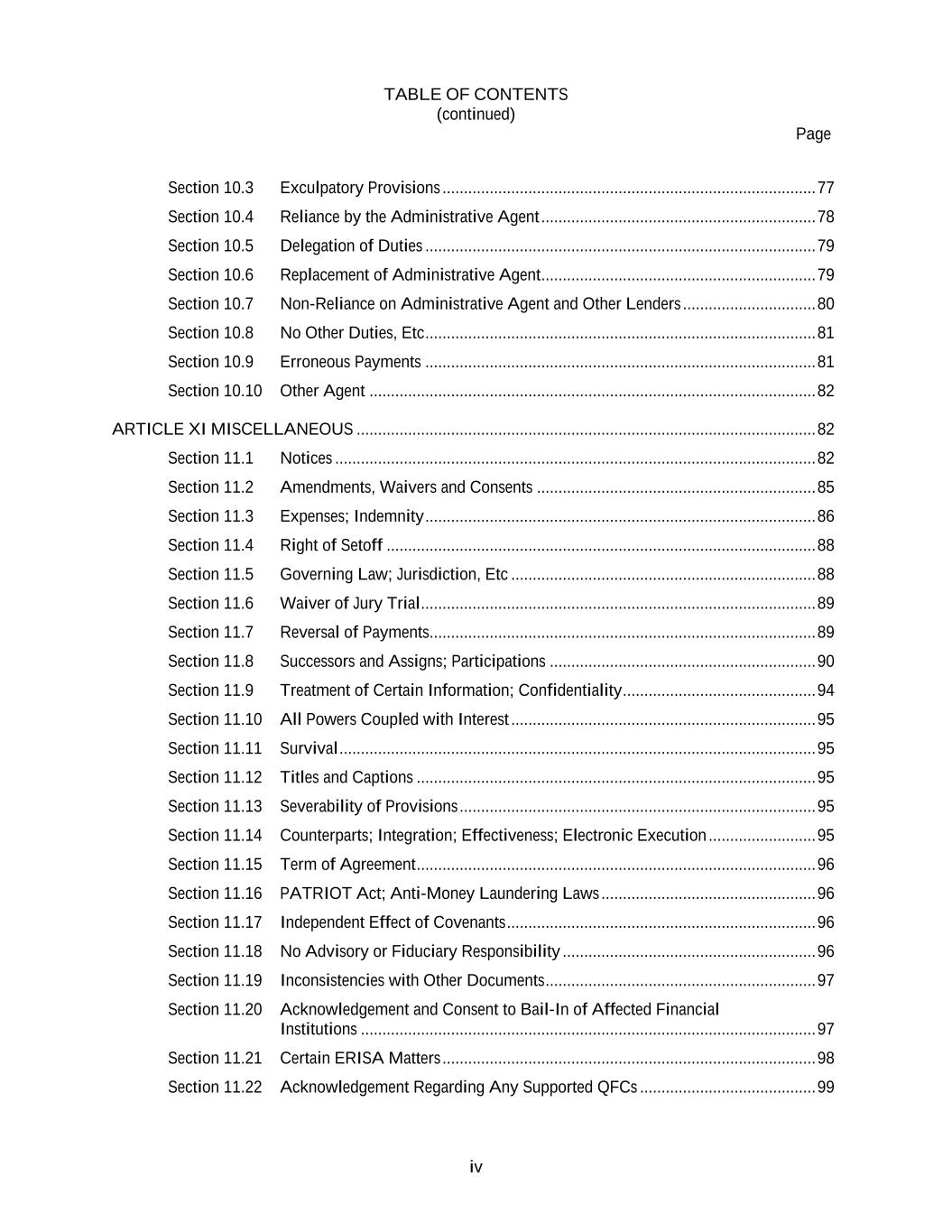TABLE OF CONTENTS (continued) Page iv Section 10.3 Exculpatory Provisions ....................................................................................... 77 Section 10.4 Reliance by the Administrative Agent ................................................................ 78 Section 10.5 Delegation of Duties ........................................................................................... 79 Section 10.6 Replacement of Administrative Agent ................................................................ 79 Section 10.7 Non-Reliance on Administrative Agent and Other Lenders ............................... 80 Section 10.8 No Other Duties, Etc ........................................................................................... 81 Section 10.9 Erroneous Payments ........................................................................................... 81 Section 10.10 Other Agent ........................................................................................................ 82 ARTICLE XI MISCELLANEOUS ........................................................................................................... 82 Section 11.1 Notices ................................................................................................................ 82 Section 11.2 Amendments, Waivers and Consents ................................................................. 85 Section 11.3 Expenses; Indemnity ........................................................................................... 86 Section 11.4 Right of Setoff .................................................................................................... 88 Section 11.5 Governing Law; Jurisdiction, Etc ....................................................................... 88 Section 11.6 Waiver of Jury Trial ............................................................................................ 89 Section 11.7 Reversal of Payments .......................................................................................... 89 Section 11.8 Successors and Assigns; Participations .............................................................. 90 Section 11.9 Treatment of Certain Information; Confidentiality ............................................. 94 Section 11.10 All Powers Coupled with Interest ....................................................................... 95 Section 11.11 Survival ............................................................................................................... 95 Section 11.12 Titles and Captions ............................................................................................. 95 Section 11.13 Severability of Provisions ................................................................................... 95 Section 11.14 Counterparts; Integration; Effectiveness; Electronic Execution ......................... 95 Section 11.15 Term of Agreement ............................................................................................. 96 Section 11.16 PATRIOT Act; Anti-Money Laundering Laws .................................................. 96 Section 11.17 Independent Effect of Covenants ........................................................................ 96 Section 11.18 No Advisory or Fiduciary Responsibility ........................................................... 96 Section 11.19 Inconsistencies with Other Documents ............................................................... 97 Section 11.20 Acknowledgement and Consent to Bail-In of Affected Financial Institutions .......................................................................................................... 97 Section 11.21 Certain ERISA Matters ....................................................................................... 98 Section 11.22 Acknowledgement Regarding Any Supported QFCs ......................................... 99