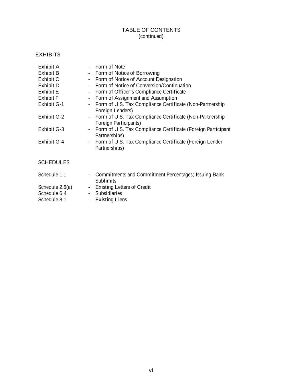 TABLE OF CONTENTS (continued) vi EXHIBITS Exhibit A - Form of Note Exhibit B - Form of Notice of Borrowing Exhibit C - Form of Notice of Account Designation Exhibit D - Form of Notice of Conversion/Continuation Exhibit E - Form of Officer’s Compliance Certificate Exhibit F - Form of Assignment and Assumption Exhibit G-1 - Form of U.S. Tax Compliance Certificate (Non-Partnership Foreign Lenders) Exhibit G-2 - Form of U.S. Tax Compliance Certificate (Non-Partnership Foreign Participants) Exhibit G-3 - Form of U.S. Tax Compliance Certificate (Foreign Participant Partnerships) Exhibit G-4 - Form of U.S. Tax Compliance Certificate (Foreign Lender Partnerships) SCHEDULES Schedule 1.1 - Commitments and Commitment Percentages; Issuing Bank Sublimits Schedule 2.6(a) - Existing Letters of Credit Schedule 6.4 - Subsidiaries Schedule 8.1 - Existing Liens