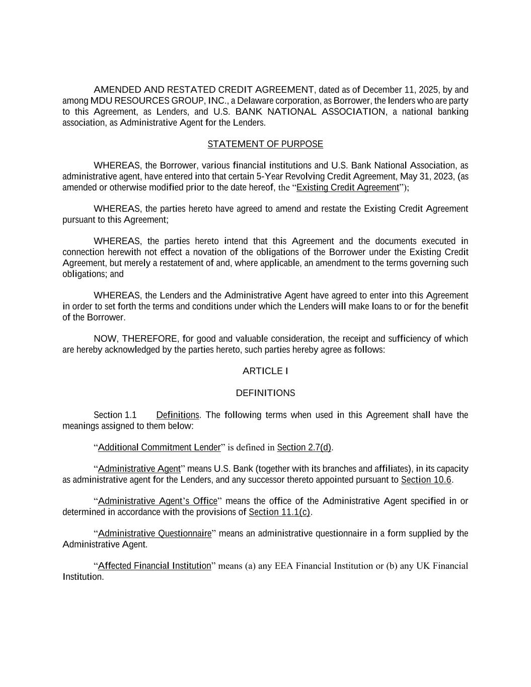 AMENDED AND RESTATED CREDIT AGREEMENT, dated as of December 11, 2025, by and among MDU RESOURCES GROUP, INC., a Delaware corporation, as Borrower, the lenders who are party to this Agreement, as Lenders, and U.S. BANK NATIONAL ASSOCIATION, a national banking association, as Administrative Agent for the Lenders. STATEMENT OF PURPOSE WHEREAS, the Borrower, various financial institutions and U.S. Bank National Association, as administrative agent, have entered into that certain 5-Year Revolving Credit Agreement, May 31, 2023, (as amended or otherwise modified prior to the date hereof, the “Existing Credit Agreement”); WHEREAS, the parties hereto have agreed to amend and restate the Existing Credit Agreement pursuant to this Agreement; WHEREAS, the parties hereto intend that this Agreement and the documents executed in connection herewith not effect a novation of the obligations of the Borrower under the Existing Credit Agreement, but merely a restatement of and, where applicable, an amendment to the terms governing such obligations; and WHEREAS, the Lenders and the Administrative Agent have agreed to enter into this Agreement in order to set forth the terms and conditions under which the Lenders will make loans to or for the benefit of the Borrower. NOW, THEREFORE, for good and valuable consideration, the receipt and sufficiency of which are hereby acknowledged by the parties hereto, such parties hereby agree as follows: ARTICLE I DEFINITIONS Section 1.1 Definitions. The following terms when used in this Agreement shall have the meanings assigned to them below: “Additional Commitment Lender” is defined in Section 2.7(d). “Administrative Agent” means U.S. Bank (together with its branches and affiliates), in its capacity as administrative agent for the Lenders, and any successor thereto appointed pursuant to Section 10.6. “Administrative Agent’s Office” means the office of the Administrative Agent specified in or determined in accordance with the provisions of Section 11.1(c). “Administrative Questionnaire” means an administrative questionnaire in a form supplied by the Administrative Agent. “Affected Financial Institution” means (a) any EEA Financial Institution or (b) any UK Financial Institution.