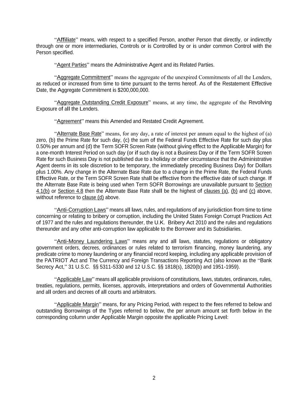 2 “Affiliate” means, with respect to a specified Person, another Person that directly, or indirectly through one or more intermediaries, Controls or is Controlled by or is under common Control with the Person specified. “Agent Parties” means the Administrative Agent and its Related Parties. “Aggregate Commitment” means the aggregate of the unexpired Commitments of all the Lenders, as reduced or increased from time to time pursuant to the terms hereof. As of the Restatement Effective Date, the Aggregate Commitment is $200,000,000. “Aggregate Outstanding Credit Exposure” means, at any time, the aggregate of the Revolving Exposure of all the Lenders. “Agreement” means this Amended and Restated Credit Agreement. “Alternate Base Rate” means, for any day, a rate of interest per annum equal to the highest of (a) zero, (b) the Prime Rate for such day, (c) the sum of the Federal Funds Effective Rate for such day plus 0.50% per annum and (d) the Term SOFR Screen Rate (without giving effect to the Applicable Margin) for a one-month Interest Period on such day (or if such day is not a Business Day or if the Term SOFR Screen Rate for such Business Day is not published due to a holiday or other circumstance that the Administrative Agent deems in its sole discretion to be temporary, the immediately preceding Business Day) for Dollars plus 1.00%. Any change in the Alternate Base Rate due to a change in the Prime Rate, the Federal Funds Effective Rate, or the Term SOFR Screen Rate shall be effective from the effective date of such change. If the Alternate Base Rate is being used when Term SOFR Borrowings are unavailable pursuant to Section 4.1(b) or Section 4.8 then the Alternate Base Rate shall be the highest of clauses (a), (b) and (c) above, without reference to clause (d) above. “Anti-Corruption Laws” means all laws, rules, and regulations of any jurisdiction from time to time concerning or relating to bribery or corruption, including the United States Foreign Corrupt Practices Act of 1977 and the rules and regulations thereunder, the U.K. Bribery Act 2010 and the rules and regulations thereunder and any other anti-corruption law applicable to the Borrower and its Subsidiaries. “Anti-Money Laundering Laws” means any and all laws, statutes, regulations or obligatory government orders, decrees, ordinances or rules related to terrorism financing, money laundering, any predicate crime to money laundering or any financial record keeping, including any applicable provision of the PATRIOT Act and The Currency and Foreign Transactions Reporting Act (also known as the “Bank Secrecy Act,” 31 U.S.C. §§ 5311-5330 and 12 U.S.C. §§ 1818(s), 1820(b) and 1951-1959). “Applicable Law” means all applicable provisions of constitutions, laws, statutes, ordinances, rules, treaties, regulations, permits, licenses, approvals, interpretations and orders of Governmental Authorities and all orders and decrees of all courts and arbitrators. “Applicable Margin” means, for any Pricing Period, with respect to the fees referred to below and outstanding Borrowings of the Types referred to below, the per annum amount set forth below in the corresponding column under Applicable Margin opposite the applicable Pricing Level: