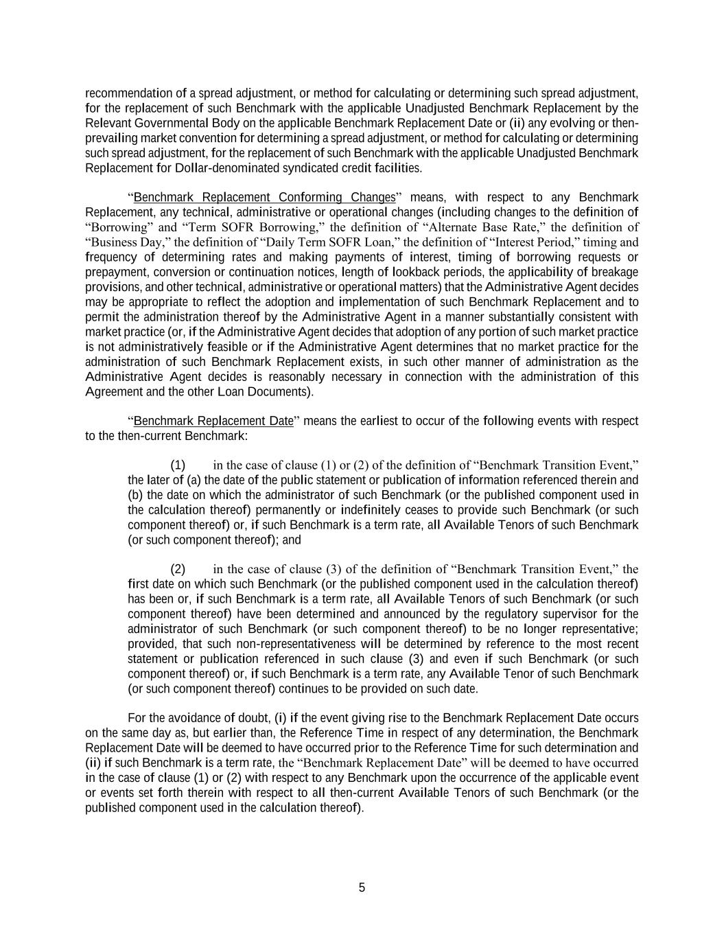 5 recommendation of a spread adjustment, or method for calculating or determining such spread adjustment, for the replacement of such Benchmark with the applicable Unadjusted Benchmark Replacement by the Relevant Governmental Body on the applicable Benchmark Replacement Date or (ii) any evolving or then- prevailing market convention for determining a spread adjustment, or method for calculating or determining such spread adjustment, for the replacement of such Benchmark with the applicable Unadjusted Benchmark Replacement for Dollar-denominated syndicated credit facilities. “Benchmark Replacement Conforming Changes” means, with respect to any Benchmark Replacement, any technical, administrative or operational changes (including changes to the definition of “Borrowing” and “Term SOFR Borrowing,” the definition of “Alternate Base Rate,” the definition of “Business Day,” the definition of “Daily Term SOFR Loan,” the definition of “Interest Period,” timing and frequency of determining rates and making payments of interest, timing of borrowing requests or prepayment, conversion or continuation notices, length of lookback periods, the applicability of breakage provisions, and other technical, administrative or operational matters) that the Administrative Agent decides may be appropriate to reflect the adoption and implementation of such Benchmark Replacement and to permit the administration thereof by the Administrative Agent in a manner substantially consistent with market practice (or, if the Administrative Agent decides that adoption of any portion of such market practice is not administratively feasible or if the Administrative Agent determines that no market practice for the administration of such Benchmark Replacement exists, in such other manner of administration as the Administrative Agent decides is reasonably necessary in connection with the administration of this Agreement and the other Loan Documents). “Benchmark Replacement Date” means the earliest to occur of the following events with respect to the then-current Benchmark: (1) in the case of clause (1) or (2) of the definition of “Benchmark Transition Event,” the later of (a) the date of the public statement or publication of information referenced therein and (b) the date on which the administrator of such Benchmark (or the published component used in the calculation thereof) permanently or indefinitely ceases to provide such Benchmark (or such component thereof) or, if such Benchmark is a term rate, all Available Tenors of such Benchmark (or such component thereof); and (2) in the case of clause (3) of the definition of “Benchmark Transition Event,” the first date on which such Benchmark (or the published component used in the calculation thereof) has been or, if such Benchmark is a term rate, all Available Tenors of such Benchmark (or such component thereof) have been determined and announced by the regulatory supervisor for the administrator of such Benchmark (or such component thereof) to be no longer representative; provided, that such non-representativeness will be determined by reference to the most recent statement or publication referenced in such clause (3) and even if such Benchmark (or such component thereof) or, if such Benchmark is a term rate, any Available Tenor of such Benchmark (or such component thereof) continues to be provided on such date. For the avoidance of doubt, (i) if the event giving rise to the Benchmark Replacement Date occurs on the same day as, but earlier than, the Reference Time in respect of any determination, the Benchmark Replacement Date will be deemed to have occurred prior to the Reference Time for such determination and (ii) if such Benchmark is a term rate, the “Benchmark Replacement Date” will be deemed to have occurred in the case of clause (1) or (2) with respect to any Benchmark upon the occurrence of the applicable event or events set forth therein with respect to all then-current Available Tenors of such Benchmark (or the published component used in the calculation thereof).