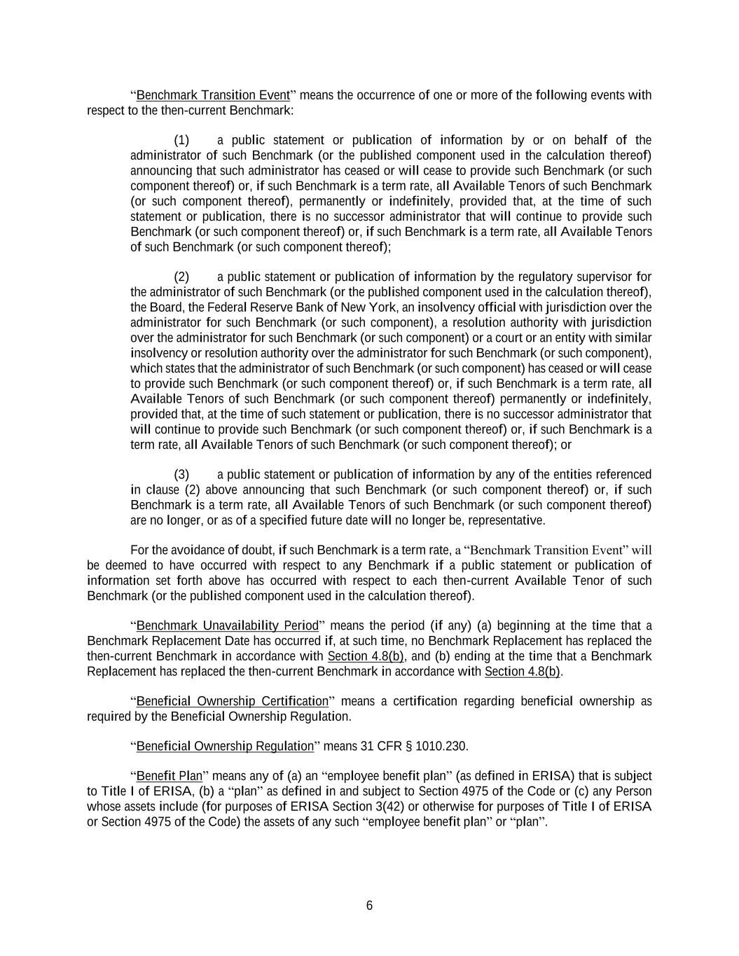 6 “Benchmark Transition Event” means the occurrence of one or more of the following events with respect to the then-current Benchmark: (1) a public statement or publication of information by or on behalf of the administrator of such Benchmark (or the published component used in the calculation thereof) announcing that such administrator has ceased or will cease to provide such Benchmark (or such component thereof) or, if such Benchmark is a term rate, all Available Tenors of such Benchmark (or such component thereof), permanently or indefinitely, provided that, at the time of such statement or publication, there is no successor administrator that will continue to provide such Benchmark (or such component thereof) or, if such Benchmark is a term rate, all Available Tenors of such Benchmark (or such component thereof); (2) a public statement or publication of information by the regulatory supervisor for the administrator of such Benchmark (or the published component used in the calculation thereof), the Board, the Federal Reserve Bank of New York, an insolvency official with jurisdiction over the administrator for such Benchmark (or such component), a resolution authority with jurisdiction over the administrator for such Benchmark (or such component) or a court or an entity with similar insolvency or resolution authority over the administrator for such Benchmark (or such component), which states that the administrator of such Benchmark (or such component) has ceased or will cease to provide such Benchmark (or such component thereof) or, if such Benchmark is a term rate, all Available Tenors of such Benchmark (or such component thereof) permanently or indefinitely, provided that, at the time of such statement or publication, there is no successor administrator that will continue to provide such Benchmark (or such component thereof) or, if such Benchmark is a term rate, all Available Tenors of such Benchmark (or such component thereof); or (3) a public statement or publication of information by any of the entities referenced in clause (2) above announcing that such Benchmark (or such component thereof) or, if such Benchmark is a term rate, all Available Tenors of such Benchmark (or such component thereof) are no longer, or as of a specified future date will no longer be, representative. For the avoidance of doubt, if such Benchmark is a term rate, a “Benchmark Transition Event” will be deemed to have occurred with respect to any Benchmark if a public statement or publication of information set forth above has occurred with respect to each then-current Available Tenor of such Benchmark (or the published component used in the calculation thereof). “Benchmark Unavailability Period” means the period (if any) (a) beginning at the time that a Benchmark Replacement Date has occurred if, at such time, no Benchmark Replacement has replaced the then-current Benchmark in accordance with Section 4.8(b), and (b) ending at the time that a Benchmark Replacement has replaced the then-current Benchmark in accordance with Section 4.8(b). “Beneficial Ownership Certification” means a certification regarding beneficial ownership as required by the Beneficial Ownership Regulation. “Beneficial Ownership Regulation” means 31 CFR § 1010.230. “Benefit Plan” means any of (a) an “employee benefit plan” (as defined in ERISA) that is subject to Title I of ERISA, (b) a “plan” as defined in and subject to Section 4975 of the Code or (c) any Person whose assets include (for purposes of ERISA Section 3(42) or otherwise for purposes of Title I of ERISA or Section 4975 of the Code) the assets of any such “employee benefit plan” or “plan”.