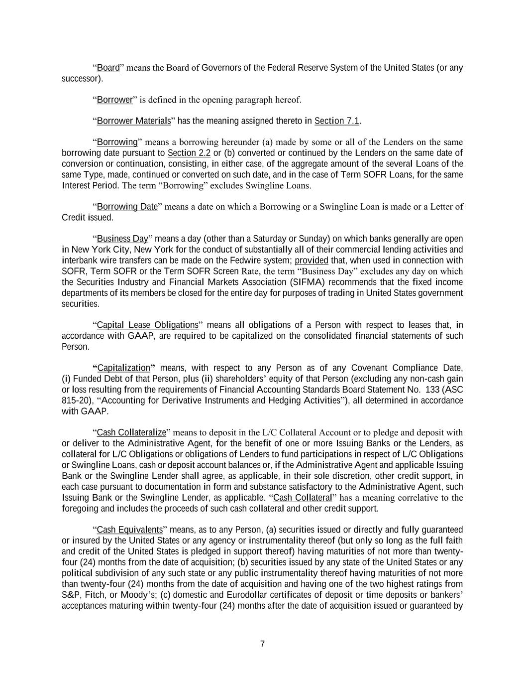 7 “Board” means the Board of Governors of the Federal Reserve System of the United States (or any successor). “Borrower” is defined in the opening paragraph hereof. “Borrower Materials” has the meaning assigned thereto in Section 7.1. “Borrowing” means a borrowing hereunder (a) made by some or all of the Lenders on the same borrowing date pursuant to Section 2.2 or (b) converted or continued by the Lenders on the same date of conversion or continuation, consisting, in either case, of the aggregate amount of the several Loans of the same Type, made, continued or converted on such date, and in the case of Term SOFR Loans, for the same Interest Period. The term “Borrowing” excludes Swingline Loans. “Borrowing Date” means a date on which a Borrowing or a Swingline Loan is made or a Letter of Credit issued. “Business Day” means a day (other than a Saturday or Sunday) on which banks generally are open in New York City, New York for the conduct of substantially all of their commercial lending activities and interbank wire transfers can be made on the Fedwire system; provided that, when used in connection with SOFR, Term SOFR or the Term SOFR Screen Rate, the term “Business Day” excludes any day on which the Securities Industry and Financial Markets Association (SIFMA) recommends that the fixed income departments of its members be closed for the entire day for purposes of trading in United States government securities. “Capital Lease Obligations” means all obligations of a Person with respect to leases that, in accordance with GAAP, are required to be capitalized on the consolidated financial statements of such Person. “Capitalization” means, with respect to any Person as of any Covenant Compliance Date, (i) Funded Debt of that Person, plus (ii) shareholders’ equity of that Person (excluding any non-cash gain or loss resulting from the requirements of Financial Accounting Standards Board Statement No. 133 (ASC 815-20), “Accounting for Derivative Instruments and Hedging Activities”), all determined in accordance with GAAP. “Cash Collateralize” means to deposit in the L/C Collateral Account or to pledge and deposit with or deliver to the Administrative Agent, for the benefit of one or more Issuing Banks or the Lenders, as collateral for L/C Obligations or obligations of Lenders to fund participations in respect of L/C Obligations or Swingline Loans, cash or deposit account balances or, if the Administrative Agent and applicable Issuing Bank or the Swingline Lender shall agree, as applicable, in their sole discretion, other credit support, in each case pursuant to documentation in form and substance satisfactory to the Administrative Agent, such Issuing Bank or the Swingline Lender, as applicable. “Cash Collateral” has a meaning correlative to the foregoing and includes the proceeds of such cash collateral and other credit support. “Cash Equivalents” means, as to any Person, (a) securities issued or directly and fully guaranteed or insured by the United States or any agency or instrumentality thereof (but only so long as the full faith and credit of the United States is pledged in support thereof) having maturities of not more than twenty- four (24) months from the date of acquisition; (b) securities issued by any state of the United States or any political subdivision of any such state or any public instrumentality thereof having maturities of not more than twenty-four (24) months from the date of acquisition and having one of the two highest ratings from S&P, Fitch, or Moody’s; (c) domestic and Eurodollar certificates of deposit or time deposits or bankers’ acceptances maturing within twenty-four (24) months after the date of acquisition issued or guaranteed by
