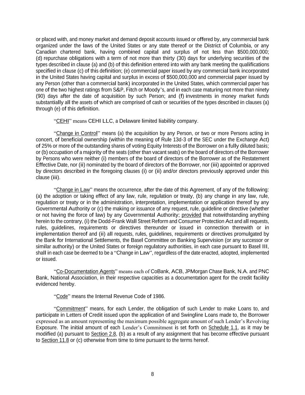 8 or placed with, and money market and demand deposit accounts issued or offered by, any commercial bank organized under the laws of the United States or any state thereof or the District of Columbia, or any Canadian chartered bank, having combined capital and surplus of not less than $500,000,000; (d) repurchase obligations with a term of not more than thirty (30) days for underlying securities of the types described in clause (a) and (b) of this definition entered into with any bank meeting the qualifications specified in clause (c) of this definition; (e) commercial paper issued by any commercial bank incorporated in the United States having capital and surplus in excess of $500,000,000 and commercial paper issued by any Person (other than a commercial bank) incorporated in the United States, which commercial paper has one of the two highest ratings from S&P, Fitch or Moody’s, and in each case maturing not more than ninety (90) days after the date of acquisition by such Person; and (f) investments in money market funds substantially all the assets of which are comprised of cash or securities of the types described in clauses (a) through (e) of this definition. “CEHI” means CEHI LLC, a Delaware limited liability company. “Change in Control” means (a) the acquisition by any Person, or two or more Persons acting in concert, of beneficial ownership (within the meaning of Rule 13d-3 of the SEC under the Exchange Act) of 25% or more of the outstanding shares of voting Equity Interests of the Borrower on a fully diluted basis; or (b) occupation of a majority of the seats (other than vacant seats) on the board of directors of the Borrower by Persons who were neither (i) members of the board of directors of the Borrower as of the Restatement Effective Date, nor (ii) nominated by the board of directors of the Borrower, nor (iii) appointed or approved by directors described in the foregoing clauses (i) or (ii) and/or directors previously approved under this clause (iii). “Change in Law” means the occurrence, after the date of this Agreement, of any of the following: (a) the adoption or taking effect of any law, rule, regulation or treaty, (b) any change in any law, rule, regulation or treaty or in the administration, interpretation, implementation or application thereof by any Governmental Authority or (c) the making or issuance of any request, rule, guideline or directive (whether or not having the force of law) by any Governmental Authority; provided that notwithstanding anything herein to the contrary, (i) the Dodd-Frank Wall Street Reform and Consumer Protection Act and all requests, rules, guidelines, requirements or directives thereunder or issued in connection therewith or in implementation thereof and (ii) all requests, rules, guidelines, requirements or directives promulgated by the Bank for International Settlements, the Basel Committee on Banking Supervision (or any successor or similar authority) or the United States or foreign regulatory authorities, in each case pursuant to Basel III, shall in each case be deemed to be a “Change in Law”, regardless of the date enacted, adopted, implemented or issued. “Co-Documentation Agents” means each of CoBank, ACB, JPMorgan Chase Bank, N.A. and PNC Bank, National Association, in their respective capacities as a documentation agent for the credit facility evidenced hereby. “Code” means the Internal Revenue Code of 1986. “Commitment” means, for each Lender, the obligation of such Lender to make Loans to, and participate in Letters of Credit issued upon the application of and Swingline Loans made to, the Borrower expressed as an amount representing the maximum possible aggregate amount of such Lender’s Revolving Exposure. The initial amount of each Lender’s Commitment is set forth on Schedule 1.1, as it may be modified (a) pursuant to Section 2.8, (b) as a result of any assignment that has become effective pursuant to Section 11.8 or (c) otherwise from time to time pursuant to the terms hereof.