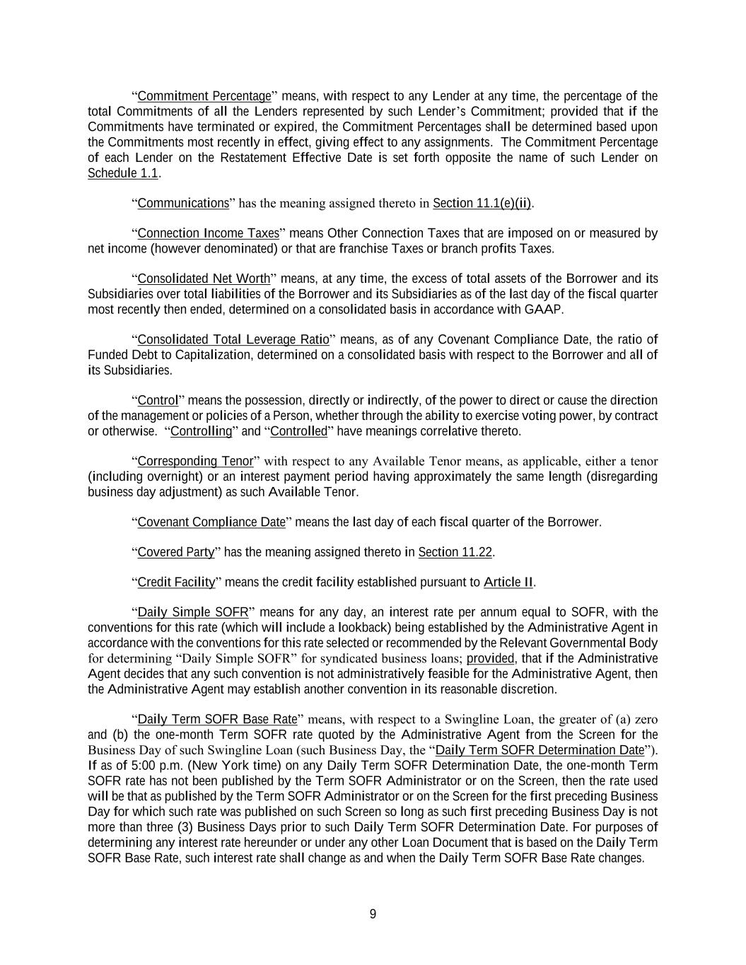 9 “Commitment Percentage” means, with respect to any Lender at any time, the percentage of the total Commitments of all the Lenders represented by such Lender’s Commitment; provided that if the Commitments have terminated or expired, the Commitment Percentages shall be determined based upon the Commitments most recently in effect, giving effect to any assignments. The Commitment Percentage of each Lender on the Restatement Effective Date is set forth opposite the name of such Lender on Schedule 1.1. “Communications” has the meaning assigned thereto in Section 11.1(e)(ii). “Connection Income Taxes” means Other Connection Taxes that are imposed on or measured by net income (however denominated) or that are franchise Taxes or branch profits Taxes. “Consolidated Net Worth” means, at any time, the excess of total assets of the Borrower and its Subsidiaries over total liabilities of the Borrower and its Subsidiaries as of the last day of the fiscal quarter most recently then ended, determined on a consolidated basis in accordance with GAAP. “Consolidated Total Leverage Ratio” means, as of any Covenant Compliance Date, the ratio of Funded Debt to Capitalization, determined on a consolidated basis with respect to the Borrower and all of its Subsidiaries. “Control” means the possession, directly or indirectly, of the power to direct or cause the direction of the management or policies of a Person, whether through the ability to exercise voting power, by contract or otherwise. “Controlling” and “Controlled” have meanings correlative thereto. “Corresponding Tenor” with respect to any Available Tenor means, as applicable, either a tenor (including overnight) or an interest payment period having approximately the same length (disregarding business day adjustment) as such Available Tenor. “Covenant Compliance Date” means the last day of each fiscal quarter of the Borrower. “Covered Party” has the meaning assigned thereto in Section 11.22. “Credit Facility” means the credit facility established pursuant to Article II. “Daily Simple SOFR” means for any day, an interest rate per annum equal to SOFR, with the conventions for this rate (which will include a lookback) being established by the Administrative Agent in accordance with the conventions for this rate selected or recommended by the Relevant Governmental Body for determining “Daily Simple SOFR” for syndicated business loans; provided, that if the Administrative Agent decides that any such convention is not administratively feasible for the Administrative Agent, then the Administrative Agent may establish another convention in its reasonable discretion. “Daily Term SOFR Base Rate” means, with respect to a Swingline Loan, the greater of (a) zero and (b) the one-month Term SOFR rate quoted by the Administrative Agent from the Screen for the Business Day of such Swingline Loan (such Business Day, the “Daily Term SOFR Determination Date”). If as of 5:00 p.m. (New York time) on any Daily Term SOFR Determination Date, the one-month Term SOFR rate has not been published by the Term SOFR Administrator or on the Screen, then the rate used will be that as published by the Term SOFR Administrator or on the Screen for the first preceding Business Day for which such rate was published on such Screen so long as such first preceding Business Day is not more than three (3) Business Days prior to such Daily Term SOFR Determination Date. For purposes of determining any interest rate hereunder or under any other Loan Document that is based on the Daily Term SOFR Base Rate, such interest rate shall change as and when the Daily Term SOFR Base Rate changes.