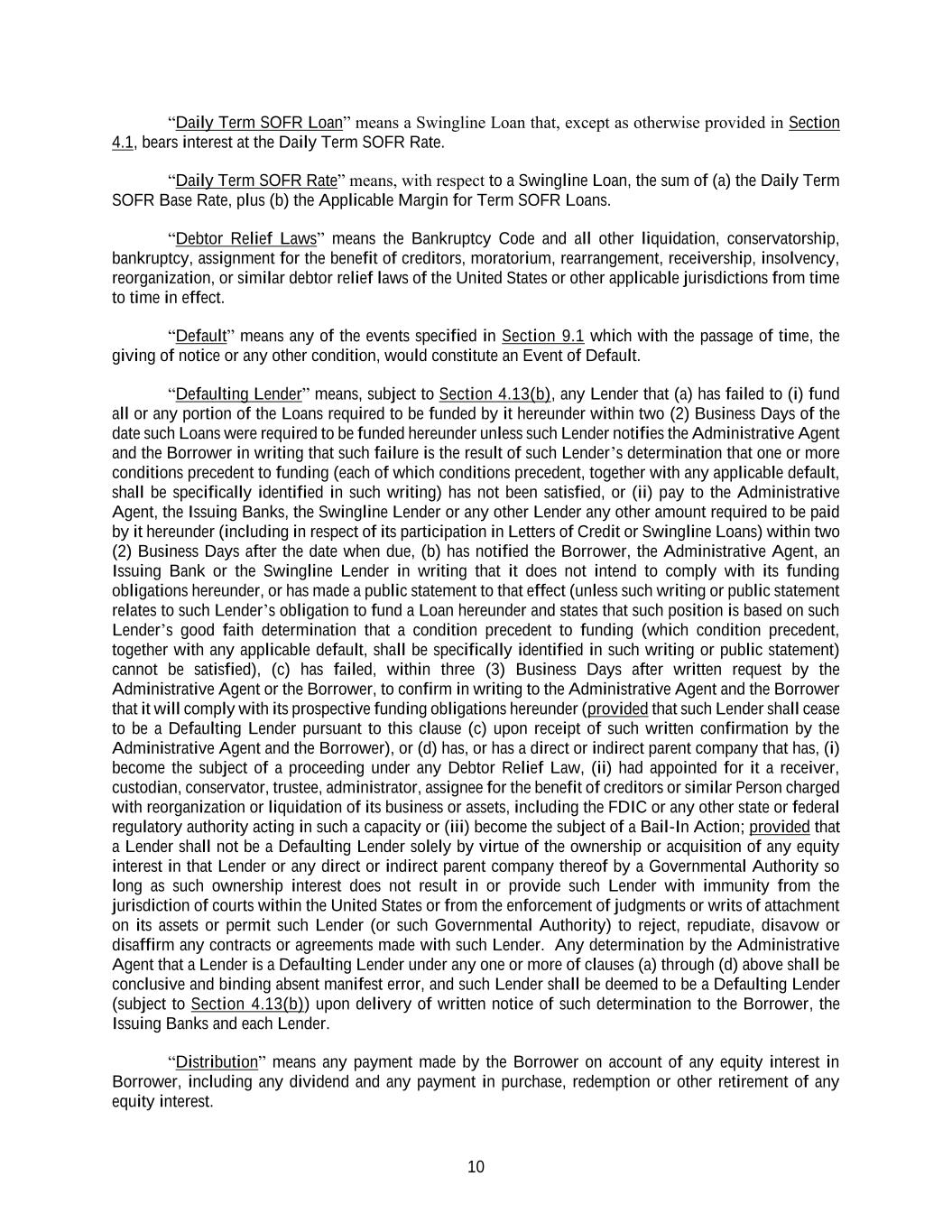 10 “Daily Term SOFR Loan” means a Swingline Loan that, except as otherwise provided in Section 4.1, bears interest at the Daily Term SOFR Rate. “Daily Term SOFR Rate” means, with respect to a Swingline Loan, the sum of (a) the Daily Term SOFR Base Rate, plus (b) the Applicable Margin for Term SOFR Loans. “Debtor Relief Laws” means the Bankruptcy Code and all other liquidation, conservatorship, bankruptcy, assignment for the benefit of creditors, moratorium, rearrangement, receivership, insolvency, reorganization, or similar debtor relief laws of the United States or other applicable jurisdictions from time to time in effect. “Default” means any of the events specified in Section 9.1 which with the passage of time, the giving of notice or any other condition, would constitute an Event of Default. “Defaulting Lender” means, subject to Section 4.13(b), any Lender that (a) has failed to (i) fund all or any portion of the Loans required to be funded by it hereunder within two (2) Business Days of the date such Loans were required to be funded hereunder unless such Lender notifies the Administrative Agent and the Borrower in writing that such failure is the result of such Lender’s determination that one or more conditions precedent to funding (each of which conditions precedent, together with any applicable default, shall be specifically identified in such writing) has not been satisfied, or (ii) pay to the Administrative Agent, the Issuing Banks, the Swingline Lender or any other Lender any other amount required to be paid by it hereunder (including in respect of its participation in Letters of Credit or Swingline Loans) within two (2) Business Days after the date when due, (b) has notified the Borrower, the Administrative Agent, an Issuing Bank or the Swingline Lender in writing that it does not intend to comply with its funding obligations hereunder, or has made a public statement to that effect (unless such writing or public statement relates to such Lender’s obligation to fund a Loan hereunder and states that such position is based on such Lender’s good faith determination that a condition precedent to funding (which condition precedent, together with any applicable default, shall be specifically identified in such writing or public statement) cannot be satisfied), (c) has failed, within three (3) Business Days after written request by the Administrative Agent or the Borrower, to confirm in writing to the Administrative Agent and the Borrower that it will comply with its prospective funding obligations hereunder (provided that such Lender shall cease to be a Defaulting Lender pursuant to this clause (c) upon receipt of such written confirmation by the Administrative Agent and the Borrower), or (d) has, or has a direct or indirect parent company that has, (i) become the subject of a proceeding under any Debtor Relief Law, (ii) had appointed for it a receiver, custodian, conservator, trustee, administrator, assignee for the benefit of creditors or similar Person charged with reorganization or liquidation of its business or assets, including the FDIC or any other state or federal regulatory authority acting in such a capacity or (iii) become the subject of a Bail-In Action; provided that a Lender shall not be a Defaulting Lender solely by virtue of the ownership or acquisition of any equity interest in that Lender or any direct or indirect parent company thereof by a Governmental Authority so long as such ownership interest does not result in or provide such Lender with immunity from the jurisdiction of courts within the United States or from the enforcement of judgments or writs of attachment on its assets or permit such Lender (or such Governmental Authority) to reject, repudiate, disavow or disaffirm any contracts or agreements made with such Lender. Any determination by the Administrative Agent that a Lender is a Defaulting Lender under any one or more of clauses (a) through (d) above shall be conclusive and binding absent manifest error, and such Lender shall be deemed to be a Defaulting Lender (subject to Section 4.13(b)) upon delivery of written notice of such determination to the Borrower, the Issuing Banks and each Lender. “Distribution” means any payment made by the Borrower on account of any equity interest in Borrower, including any dividend and any payment in purchase, redemption or other retirement of any equity interest.