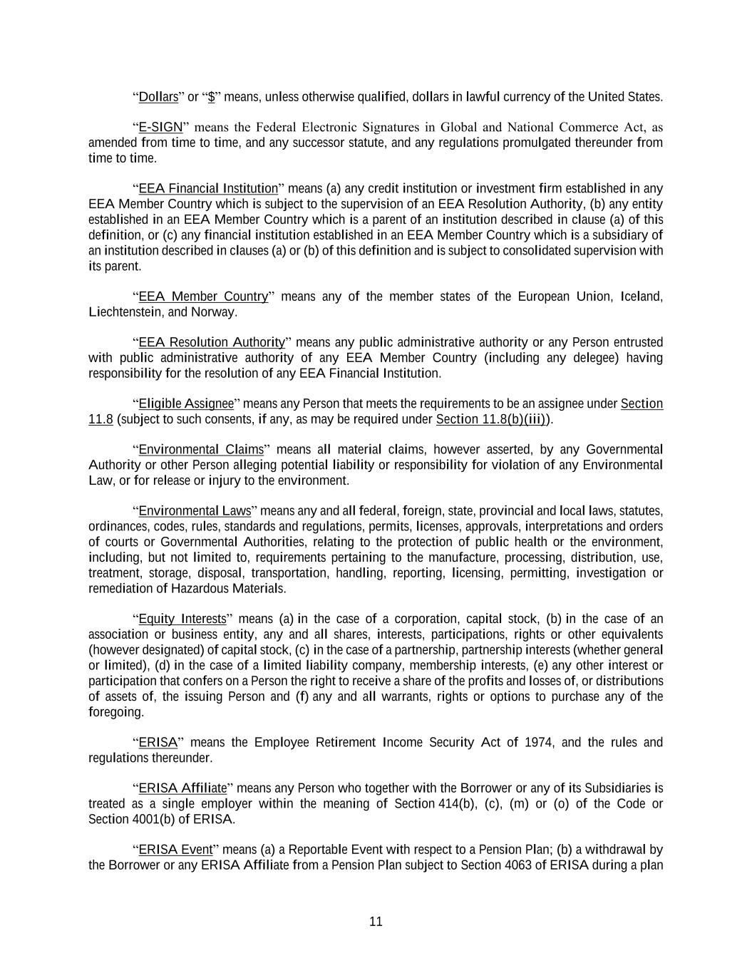 11 “Dollars” or “$” means, unless otherwise qualified, dollars in lawful currency of the United States. “E-SIGN” means the Federal Electronic Signatures in Global and National Commerce Act, as amended from time to time, and any successor statute, and any regulations promulgated thereunder from time to time. “EEA Financial Institution” means (a) any credit institution or investment firm established in any EEA Member Country which is subject to the supervision of an EEA Resolution Authority, (b) any entity established in an EEA Member Country which is a parent of an institution described in clause (a) of this definition, or (c) any financial institution established in an EEA Member Country which is a subsidiary of an institution described in clauses (a) or (b) of this definition and is subject to consolidated supervision with its parent. “EEA Member Country” means any of the member states of the European Union, Iceland, Liechtenstein, and Norway. “EEA Resolution Authority” means any public administrative authority or any Person entrusted with public administrative authority of any EEA Member Country (including any delegee) having responsibility for the resolution of any EEA Financial Institution. “Eligible Assignee” means any Person that meets the requirements to be an assignee under Section 11.8 (subject to such consents, if any, as may be required under Section 11.8(b)(iii)). “Environmental Claims” means all material claims, however asserted, by any Governmental Authority or other Person alleging potential liability or responsibility for violation of any Environmental Law, or for release or injury to the environment. “Environmental Laws” means any and all federal, foreign, state, provincial and local laws, statutes, ordinances, codes, rules, standards and regulations, permits, licenses, approvals, interpretations and orders of courts or Governmental Authorities, relating to the protection of public health or the environment, including, but not limited to, requirements pertaining to the manufacture, processing, distribution, use, treatment, storage, disposal, transportation, handling, reporting, licensing, permitting, investigation or remediation of Hazardous Materials. “Equity Interests” means (a) in the case of a corporation, capital stock, (b) in the case of an association or business entity, any and all shares, interests, participations, rights or other equivalents (however designated) of capital stock, (c) in the case of a partnership, partnership interests (whether general or limited), (d) in the case of a limited liability company, membership interests, (e) any other interest or participation that confers on a Person the right to receive a share of the profits and losses of, or distributions of assets of, the issuing Person and (f) any and all warrants, rights or options to purchase any of the foregoing. “ERISA” means the Employee Retirement Income Security Act of 1974, and the rules and regulations thereunder. “ERISA Affiliate” means any Person who together with the Borrower or any of its Subsidiaries is treated as a single employer within the meaning of Section 414(b), (c), (m) or (o) of the Code or Section 4001(b) of ERISA. “ERISA Event” means (a) a Reportable Event with respect to a Pension Plan; (b) a withdrawal by the Borrower or any ERISA Affiliate from a Pension Plan subject to Section 4063 of ERISA during a plan