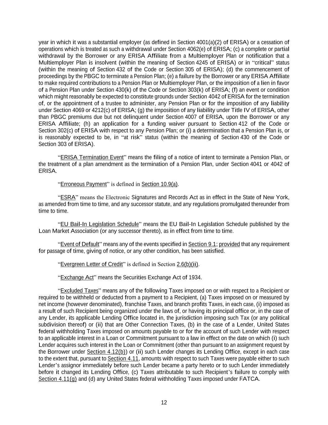 12 year in which it was a substantial employer (as defined in Section 4001(a)(2) of ERISA) or a cessation of operations which is treated as such a withdrawal under Section 4062(e) of ERISA; (c) a complete or partial withdrawal by the Borrower or any ERISA Affiliate from a Multiemployer Plan or notification that a Multiemployer Plan is insolvent (within the meaning of Section 4245 of ERISA) or in “critical” status (within the meaning of Section 432 of the Code or Section 305 of ERISA); (d) the commencement of proceedings by the PBGC to terminate a Pension Plan; (e) a failure by the Borrower or any ERISA Affiliate to make required contributions to a Pension Plan or Multiemployer Plan, or the imposition of a lien in favor of a Pension Plan under Section 430(k) of the Code or Section 303(k) of ERISA; (f) an event or condition which might reasonably be expected to constitute grounds under Section 4042 of ERISA for the termination of, or the appointment of a trustee to administer, any Pension Plan or for the imposition of any liability under Section 4069 or 4212(c) of ERISA; (g) the imposition of any liability under Title IV of ERISA, other than PBGC premiums due but not delinquent under Section 4007 of ERISA, upon the Borrower or any ERISA Affiliate; (h) an application for a funding waiver pursuant to Section 412 of the Code or Section 302(c) of ERISA with respect to any Pension Plan; or (i) a determination that a Pension Plan is, or is reasonably expected to be, in “at risk” status (within the meaning of Section 430 of the Code or Section 303 of ERISA). “ERISA Termination Event” means the filing of a notice of intent to terminate a Pension Plan, or the treatment of a plan amendment as the termination of a Pension Plan, under Section 4041 or 4042 of ERISA. “Erroneous Payment” is defined in Section 10.9(a). “ESRA” means the Electronic Signatures and Records Act as in effect in the State of New York, as amended from time to time, and any successor statute, and any regulations promulgated thereunder from time to time. “EU Bail-In Legislation Schedule” means the EU Bail-In Legislation Schedule published by the Loan Market Association (or any successor thereto), as in effect from time to time. “Event of Default” means any of the events specified in Section 9.1; provided that any requirement for passage of time, giving of notice, or any other condition, has been satisfied. “Evergreen Letter of Credit” is defined in Section 2.6(b)(ii). “Exchange Act” means the Securities Exchange Act of 1934. “Excluded Taxes” means any of the following Taxes imposed on or with respect to a Recipient or required to be withheld or deducted from a payment to a Recipient, (a) Taxes imposed on or measured by net income (however denominated), franchise Taxes, and branch profits Taxes, in each case, (i) imposed as a result of such Recipient being organized under the laws of, or having its principal office or, in the case of any Lender, its applicable Lending Office located in, the jurisdiction imposing such Tax (or any political subdivision thereof) or (ii) that are Other Connection Taxes, (b) in the case of a Lender, United States federal withholding Taxes imposed on amounts payable to or for the account of such Lender with respect to an applicable interest in a Loan or Commitment pursuant to a law in effect on the date on which (i) such Lender acquires such interest in the Loan or Commitment (other than pursuant to an assignment request by the Borrower under Section 4.12(b)) or (ii) such Lender changes its Lending Office, except in each case to the extent that, pursuant to Section 4.11, amounts with respect to such Taxes were payable either to such Lender’s assignor immediately before such Lender became a party hereto or to such Lender immediately before it changed its Lending Office, (c) Taxes attributable to such Recipient’s failure to comply with Section 4.11(g) and (d) any United States federal withholding Taxes imposed under FATCA.