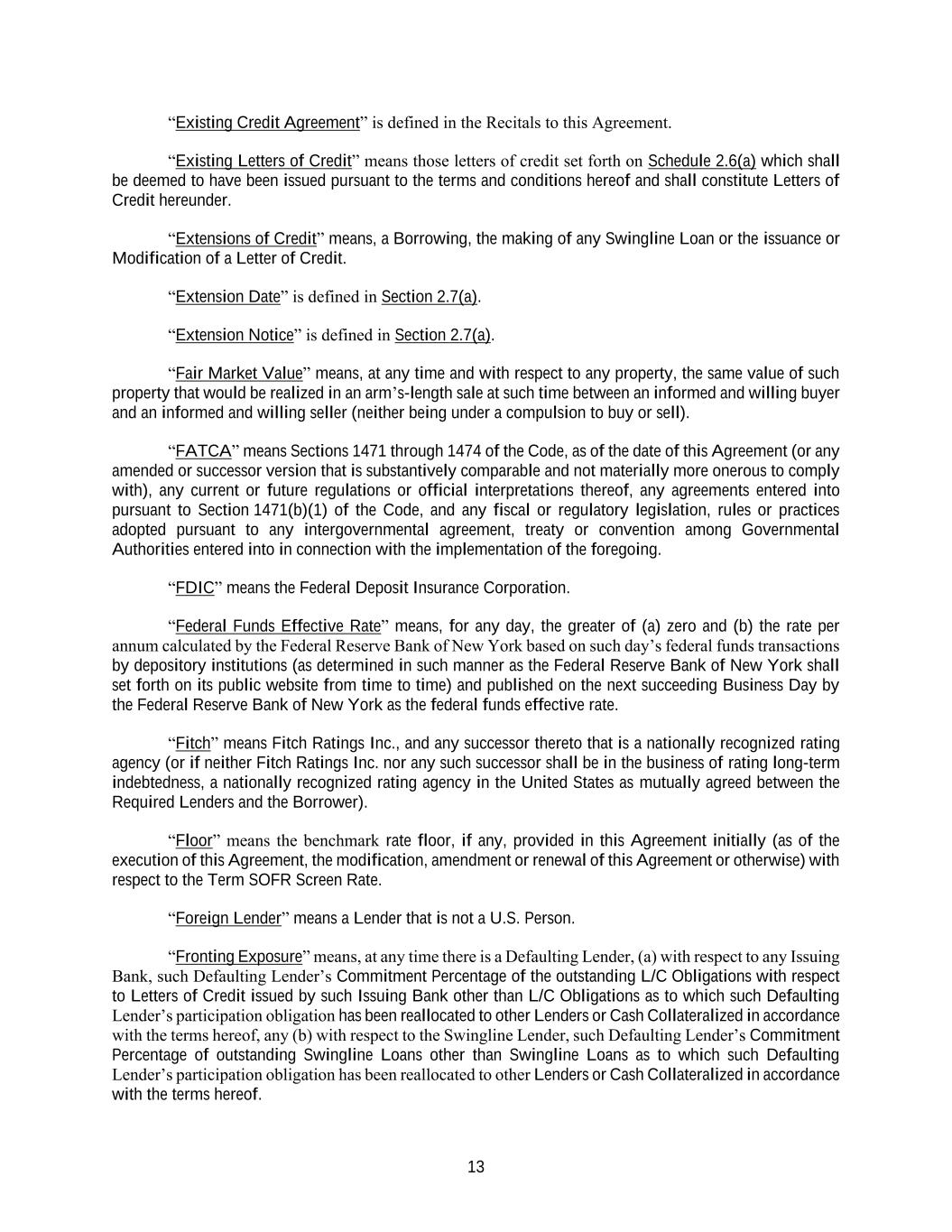 13 “Existing Credit Agreement” is defined in the Recitals to this Agreement. “Existing Letters of Credit” means those letters of credit set forth on Schedule 2.6(a) which shall be deemed to have been issued pursuant to the terms and conditions hereof and shall constitute Letters of Credit hereunder. “Extensions of Credit” means, a Borrowing, the making of any Swingline Loan or the issuance or Modification of a Letter of Credit. “Extension Date” is defined in Section 2.7(a). “Extension Notice” is defined in Section 2.7(a). “Fair Market Value” means, at any time and with respect to any property, the same value of such property that would be realized in an arm’s-length sale at such time between an informed and willing buyer and an informed and willing seller (neither being under a compulsion to buy or sell). “FATCA” means Sections 1471 through 1474 of the Code, as of the date of this Agreement (or any amended or successor version that is substantively comparable and not materially more onerous to comply with), any current or future regulations or official interpretations thereof, any agreements entered into pursuant to Section 1471(b)(1) of the Code, and any fiscal or regulatory legislation, rules or practices adopted pursuant to any intergovernmental agreement, treaty or convention among Governmental Authorities entered into in connection with the implementation of the foregoing. “FDIC” means the Federal Deposit Insurance Corporation. “Federal Funds Effective Rate” means, for any day, the greater of (a) zero and (b) the rate per annum calculated by the Federal Reserve Bank of New York based on such day’s federal funds transactions by depository institutions (as determined in such manner as the Federal Reserve Bank of New York shall set forth on its public website from time to time) and published on the next succeeding Business Day by the Federal Reserve Bank of New York as the federal funds effective rate. “Fitch” means Fitch Ratings Inc., and any successor thereto that is a nationally recognized rating agency (or if neither Fitch Ratings Inc. nor any such successor shall be in the business of rating long-term indebtedness, a nationally recognized rating agency in the United States as mutually agreed between the Required Lenders and the Borrower). “Floor” means the benchmark rate floor, if any, provided in this Agreement initially (as of the execution of this Agreement, the modification, amendment or renewal of this Agreement or otherwise) with respect to the Term SOFR Screen Rate. “Foreign Lender” means a Lender that is not a U.S. Person. “Fronting Exposure” means, at any time there is a Defaulting Lender, (a) with respect to any Issuing Bank, such Defaulting Lender’s Commitment Percentage of the outstanding L/C Obligations with respect to Letters of Credit issued by such Issuing Bank other than L/C Obligations as to which such Defaulting Lender’s participation obligation has been reallocated to other Lenders or Cash Collateralized in accordance with the terms hereof, any (b) with respect to the Swingline Lender, such Defaulting Lender’s Commitment Percentage of outstanding Swingline Loans other than Swingline Loans as to which such Defaulting Lender’s participation obligation has been reallocated to other Lenders or Cash Collateralized in accordance with the terms hereof.