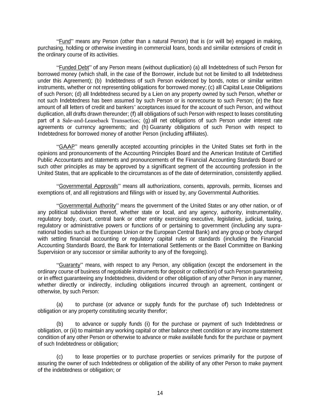 14 “Fund” means any Person (other than a natural Person) that is (or will be) engaged in making, purchasing, holding or otherwise investing in commercial loans, bonds and similar extensions of credit in the ordinary course of its activities. “Funded Debt” of any Person means (without duplication) (a) all Indebtedness of such Person for borrowed money (which shall, in the case of the Borrower, include but not be limited to all Indebtedness under this Agreement); (b) Indebtedness of such Person evidenced by bonds, notes or similar written instruments, whether or not representing obligations for borrowed money; (c) all Capital Lease Obligations of such Person; (d) all Indebtedness secured by a Lien on any property owned by such Person, whether or not such Indebtedness has been assumed by such Person or is nonrecourse to such Person; (e) the face amount of all letters of credit and bankers’ acceptances issued for the account of such Person, and without duplication, all drafts drawn thereunder; (f) all obligations of such Person with respect to leases constituting part of a Sale-and-Leaseback Transaction; (g) all net obligations of such Person under interest rate agreements or currency agreements; and (h) Guaranty obligations of such Person with respect to Indebtedness for borrowed money of another Person (including affiliates). “GAAP” means generally accepted accounting principles in the United States set forth in the opinions and pronouncements of the Accounting Principles Board and the American Institute of Certified Public Accountants and statements and pronouncements of the Financial Accounting Standards Board or such other principles as may be approved by a significant segment of the accounting profession in the United States, that are applicable to the circumstances as of the date of determination, consistently applied. “Governmental Approvals” means all authorizations, consents, approvals, permits, licenses and exemptions of, and all registrations and filings with or issued by, any Governmental Authorities. “Governmental Authority” means the government of the United States or any other nation, or of any political subdivision thereof, whether state or local, and any agency, authority, instrumentality, regulatory body, court, central bank or other entity exercising executive, legislative, judicial, taxing, regulatory or administrative powers or functions of or pertaining to government (including any supra- national bodies such as the European Union or the European Central Bank) and any group or body charged with setting financial accounting or regulatory capital rules or standards (including the Financial Accounting Standards Board, the Bank for International Settlements or the Basel Committee on Banking Supervision or any successor or similar authority to any of the foregoing). “Guaranty” means, with respect to any Person, any obligation (except the endorsement in the ordinary course of business of negotiable instruments for deposit or collection) of such Person guaranteeing or in effect guaranteeing any Indebtedness, dividend or other obligation of any other Person in any manner, whether directly or indirectly, including obligations incurred through an agreement, contingent or otherwise, by such Person: (a) to purchase (or advance or supply funds for the purchase of) such Indebtedness or obligation or any property constituting security therefor; (b) to advance or supply funds (i) for the purchase or payment of such Indebtedness or obligation, or (ii) to maintain any working capital or other balance sheet condition or any income statement condition of any other Person or otherwise to advance or make available funds for the purchase or payment of such Indebtedness or obligation; (c) to lease properties or to purchase properties or services primarily for the purpose of assuring the owner of such Indebtedness or obligation of the ability of any other Person to make payment of the indebtedness or obligation; or