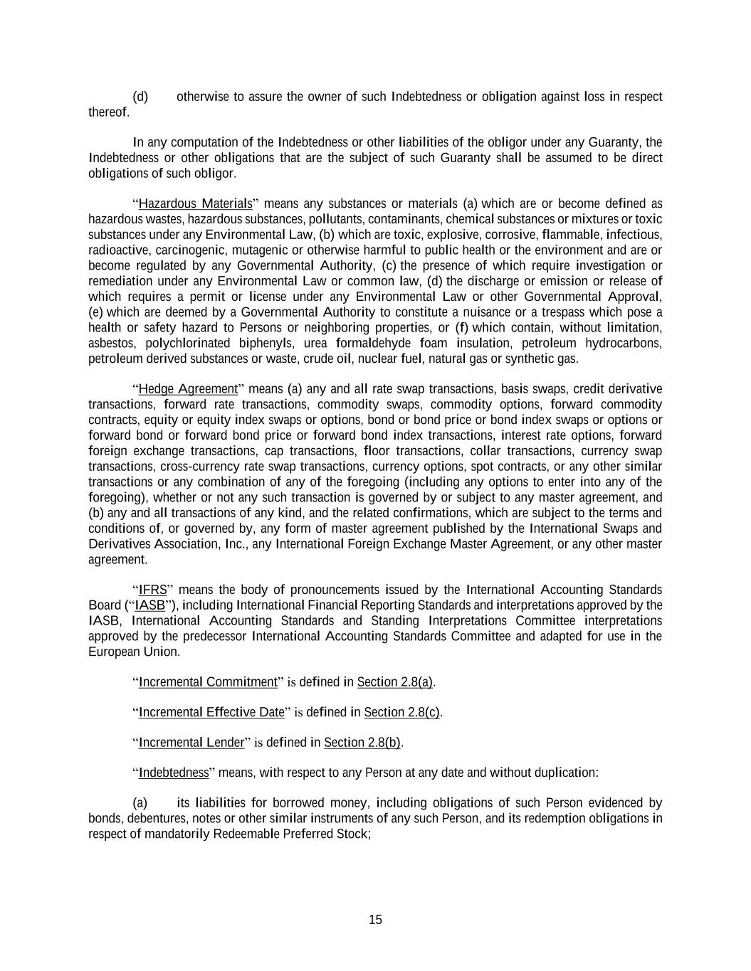 15 (d) otherwise to assure the owner of such Indebtedness or obligation against loss in respect thereof. In any computation of the Indebtedness or other liabilities of the obligor under any Guaranty, the Indebtedness or other obligations that are the subject of such Guaranty shall be assumed to be direct obligations of such obligor. “Hazardous Materials” means any substances or materials (a) which are or become defined as hazardous wastes, hazardous substances, pollutants, contaminants, chemical substances or mixtures or toxic substances under any Environmental Law, (b) which are toxic, explosive, corrosive, flammable, infectious, radioactive, carcinogenic, mutagenic or otherwise harmful to public health or the environment and are or become regulated by any Governmental Authority, (c) the presence of which require investigation or remediation under any Environmental Law or common law, (d) the discharge or emission or release of which requires a permit or license under any Environmental Law or other Governmental Approval, (e) which are deemed by a Governmental Authority to constitute a nuisance or a trespass which pose a health or safety hazard to Persons or neighboring properties, or (f) which contain, without limitation, asbestos, polychlorinated biphenyls, urea formaldehyde foam insulation, petroleum hydrocarbons, petroleum derived substances or waste, crude oil, nuclear fuel, natural gas or synthetic gas. “Hedge Agreement” means (a) any and all rate swap transactions, basis swaps, credit derivative transactions, forward rate transactions, commodity swaps, commodity options, forward commodity contracts, equity or equity index swaps or options, bond or bond price or bond index swaps or options or forward bond or forward bond price or forward bond index transactions, interest rate options, forward foreign exchange transactions, cap transactions, floor transactions, collar transactions, currency swap transactions, cross-currency rate swap transactions, currency options, spot contracts, or any other similar transactions or any combination of any of the foregoing (including any options to enter into any of the foregoing), whether or not any such transaction is governed by or subject to any master agreement, and (b) any and all transactions of any kind, and the related confirmations, which are subject to the terms and conditions of, or governed by, any form of master agreement published by the International Swaps and Derivatives Association, Inc., any International Foreign Exchange Master Agreement, or any other master agreement. “IFRS” means the body of pronouncements issued by the International Accounting Standards Board (“IASB”), including International Financial Reporting Standards and interpretations approved by the IASB, International Accounting Standards and Standing Interpretations Committee interpretations approved by the predecessor International Accounting Standards Committee and adapted for use in the European Union. “Incremental Commitment” is defined in Section 2.8(a). “Incremental Effective Date” is defined in Section 2.8(c). “Incremental Lender” is defined in Section 2.8(b). “Indebtedness” means, with respect to any Person at any date and without duplication: (a) its liabilities for borrowed money, including obligations of such Person evidenced by bonds, debentures, notes or other similar instruments of any such Person, and its redemption obligations in respect of mandatorily Redeemable Preferred Stock;