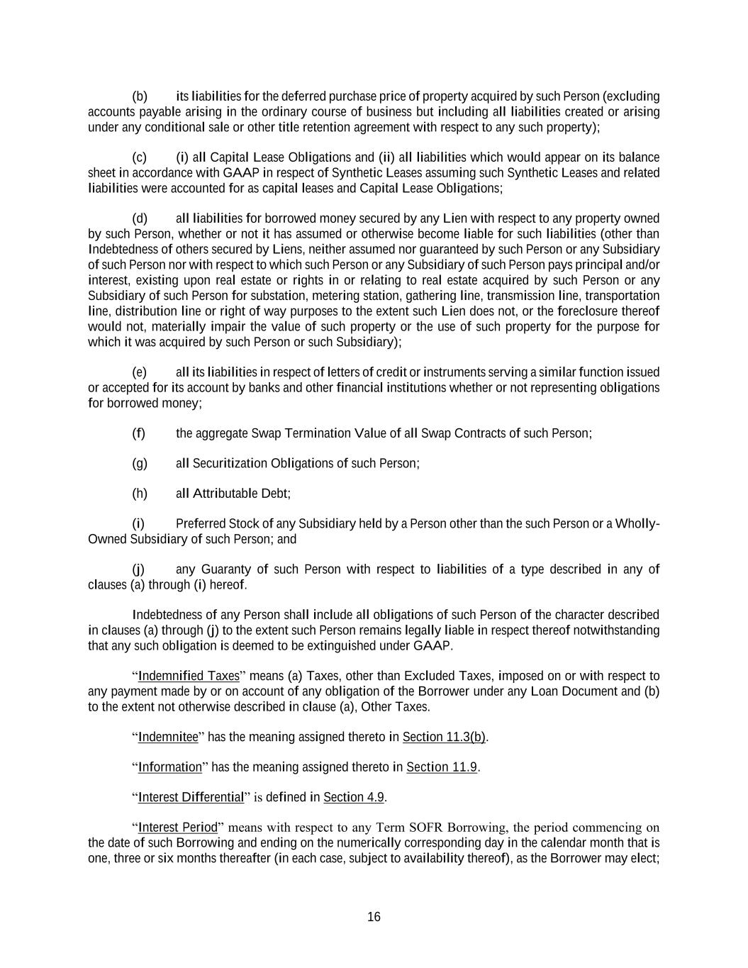 16 (b) its liabilities for the deferred purchase price of property acquired by such Person (excluding accounts payable arising in the ordinary course of business but including all liabilities created or arising under any conditional sale or other title retention agreement with respect to any such property); (c) (i) all Capital Lease Obligations and (ii) all liabilities which would appear on its balance sheet in accordance with GAAP in respect of Synthetic Leases assuming such Synthetic Leases and related liabilities were accounted for as capital leases and Capital Lease Obligations; (d) all liabilities for borrowed money secured by any Lien with respect to any property owned by such Person, whether or not it has assumed or otherwise become liable for such liabilities (other than Indebtedness of others secured by Liens, neither assumed nor guaranteed by such Person or any Subsidiary of such Person nor with respect to which such Person or any Subsidiary of such Person pays principal and/or interest, existing upon real estate or rights in or relating to real estate acquired by such Person or any Subsidiary of such Person for substation, metering station, gathering line, transmission line, transportation line, distribution line or right of way purposes to the extent such Lien does not, or the foreclosure thereof would not, materially impair the value of such property or the use of such property for the purpose for which it was acquired by such Person or such Subsidiary); (e) all its liabilities in respect of letters of credit or instruments serving a similar function issued or accepted for its account by banks and other financial institutions whether or not representing obligations for borrowed money; (f) the aggregate Swap Termination Value of all Swap Contracts of such Person; (g) all Securitization Obligations of such Person; (h) all Attributable Debt; (i) Preferred Stock of any Subsidiary held by a Person other than the such Person or a Wholly- Owned Subsidiary of such Person; and (j) any Guaranty of such Person with respect to liabilities of a type described in any of clauses (a) through (i) hereof. Indebtedness of any Person shall include all obligations of such Person of the character described in clauses (a) through (j) to the extent such Person remains legally liable in respect thereof notwithstanding that any such obligation is deemed to be extinguished under GAAP. “Indemnified Taxes” means (a) Taxes, other than Excluded Taxes, imposed on or with respect to any payment made by or on account of any obligation of the Borrower under any Loan Document and (b) to the extent not otherwise described in clause (a), Other Taxes. “Indemnitee” has the meaning assigned thereto in Section 11.3(b). “Information” has the meaning assigned thereto in Section 11.9. “Interest Differential” is defined in Section 4.9. “Interest Period” means with respect to any Term SOFR Borrowing, the period commencing on the date of such Borrowing and ending on the numerically corresponding day in the calendar month that is one, three or six months thereafter (in each case, subject to availability thereof), as the Borrower may elect;
