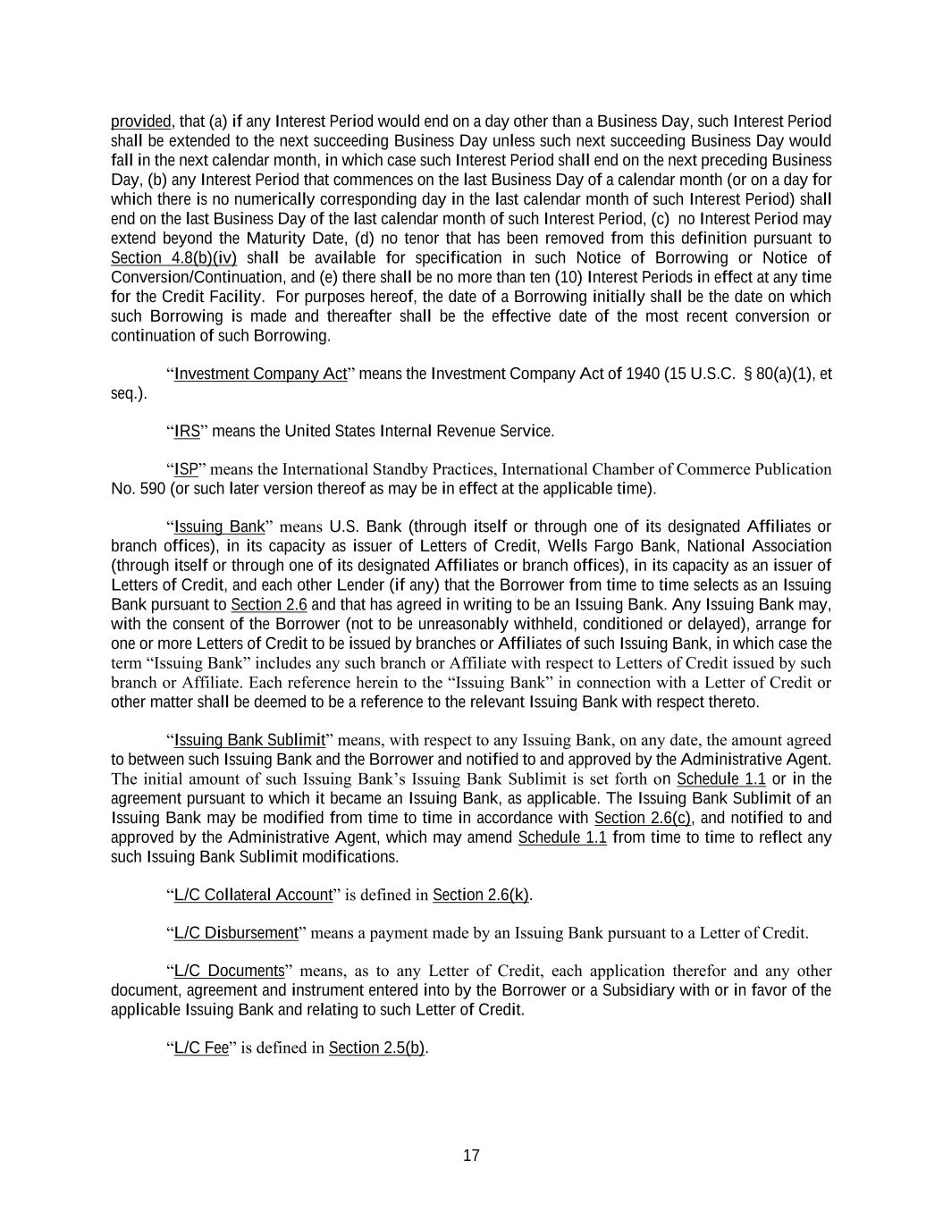 17 provided, that (a) if any Interest Period would end on a day other than a Business Day, such Interest Period shall be extended to the next succeeding Business Day unless such next succeeding Business Day would fall in the next calendar month, in which case such Interest Period shall end on the next preceding Business Day, (b) any Interest Period that commences on the last Business Day of a calendar month (or on a day for which there is no numerically corresponding day in the last calendar month of such Interest Period) shall end on the last Business Day of the last calendar month of such Interest Period, (c) no Interest Period may extend beyond the Maturity Date, (d) no tenor that has been removed from this definition pursuant to Section 4.8(b)(iv) shall be available for specification in such Notice of Borrowing or Notice of Conversion/Continuation, and (e) there shall be no more than ten (10) Interest Periods in effect at any time for the Credit Facility. For purposes hereof, the date of a Borrowing initially shall be the date on which such Borrowing is made and thereafter shall be the effective date of the most recent conversion or continuation of such Borrowing. “Investment Company Act” means the Investment Company Act of 1940 (15 U.S.C. § 80(a)(1), et seq.). “IRS” means the United States Internal Revenue Service. “ISP” means the International Standby Practices, International Chamber of Commerce Publication No. 590 (or such later version thereof as may be in effect at the applicable time). “Issuing Bank” means U.S. Bank (through itself or through one of its designated Affiliates or branch offices), in its capacity as issuer of Letters of Credit, Wells Fargo Bank, National Association (through itself or through one of its designated Affiliates or branch offices), in its capacity as an issuer of Letters of Credit, and each other Lender (if any) that the Borrower from time to time selects as an Issuing Bank pursuant to Section 2.6 and that has agreed in writing to be an Issuing Bank. Any Issuing Bank may, with the consent of the Borrower (not to be unreasonably withheld, conditioned or delayed), arrange for one or more Letters of Credit to be issued by branches or Affiliates of such Issuing Bank, in which case the term “Issuing Bank” includes any such branch or Affiliate with respect to Letters of Credit issued by such branch or Affiliate. Each reference herein to the “Issuing Bank” in connection with a Letter of Credit or other matter shall be deemed to be a reference to the relevant Issuing Bank with respect thereto. “Issuing Bank Sublimit” means, with respect to any Issuing Bank, on any date, the amount agreed to between such Issuing Bank and the Borrower and notified to and approved by the Administrative Agent. The initial amount of such Issuing Bank’s Issuing Bank Sublimit is set forth on Schedule 1.1 or in the agreement pursuant to which it became an Issuing Bank, as applicable. The Issuing Bank Sublimit of an Issuing Bank may be modified from time to time in accordance with Section 2.6(c), and notified to and approved by the Administrative Agent, which may amend Schedule 1.1 from time to time to reflect any such Issuing Bank Sublimit modifications. “L/C Collateral Account” is defined in Section 2.6(k). “L/C Disbursement” means a payment made by an Issuing Bank pursuant to a Letter of Credit. “L/C Documents” means, as to any Letter of Credit, each application therefor and any other document, agreement and instrument entered into by the Borrower or a Subsidiary with or in favor of the applicable Issuing Bank and relating to such Letter of Credit. “L/C Fee” is defined in Section 2.5(b).